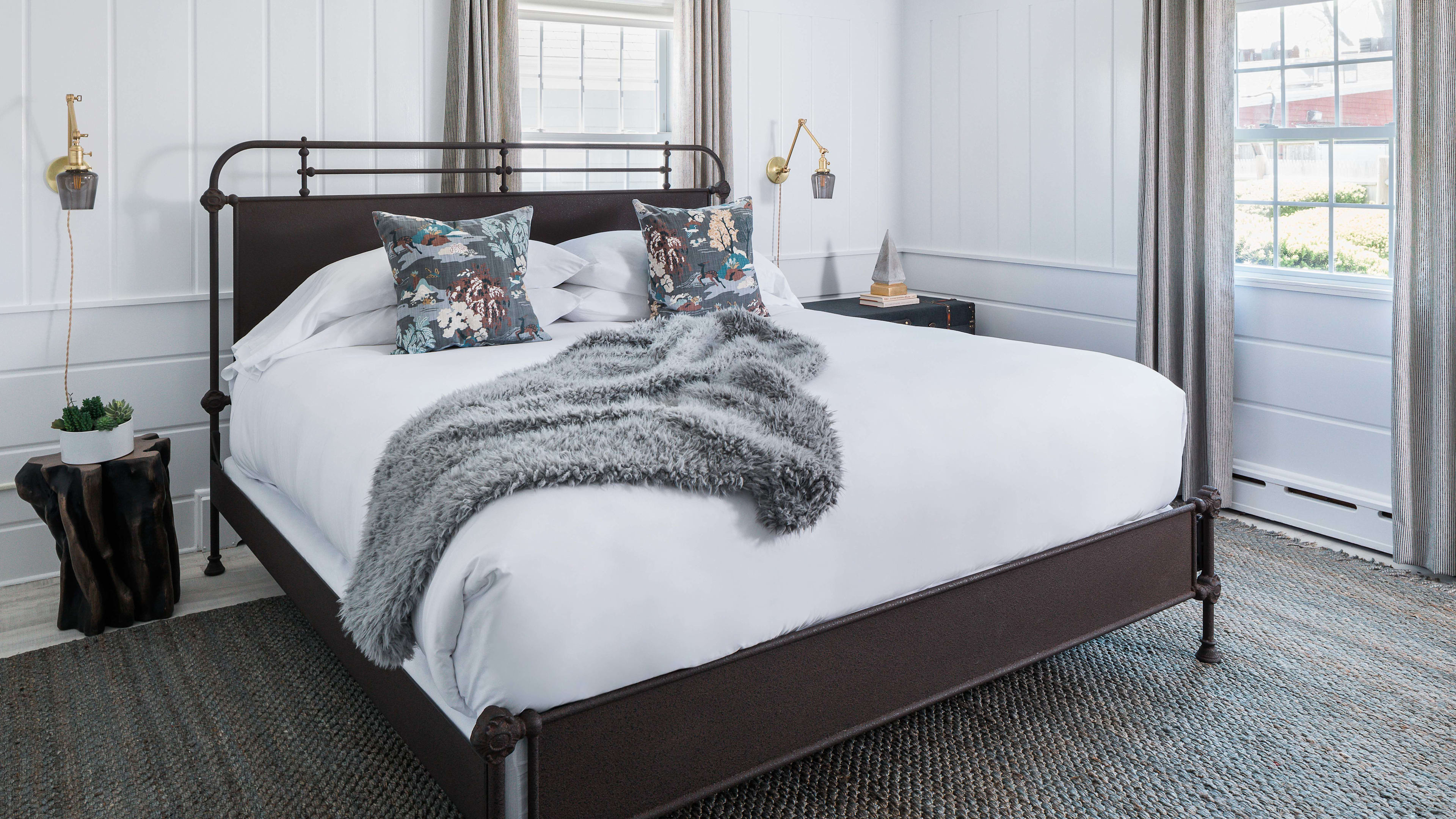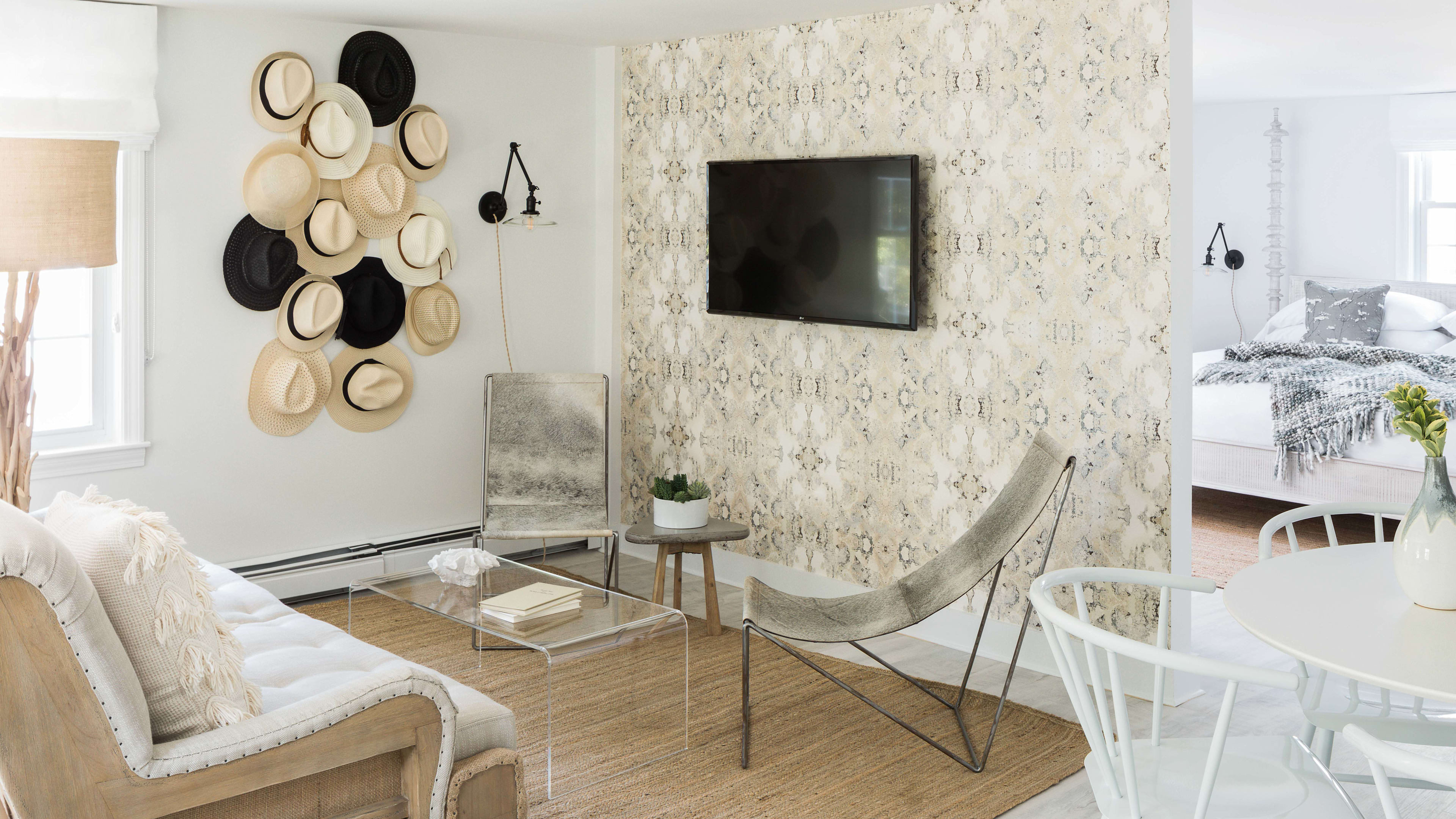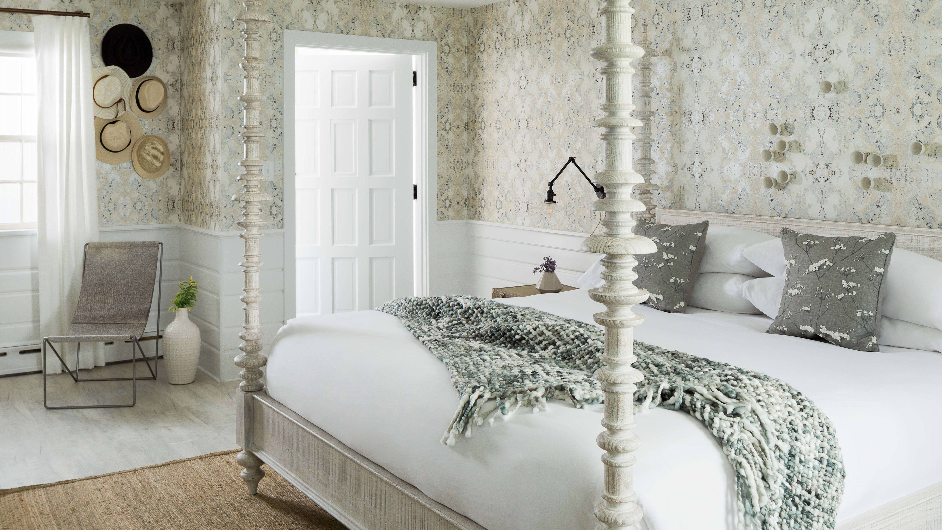 Coastal cool permeates throughout the Coonamessett, especially so in the bedrooms. Interiors are inspired by the hotel’s farmhouse pedigree, weaving in whitewashed pickled floors, wooden four-poster beds and bespoke wall hangings. Sun-streaming picture windows and a cozy fireplace make the King room a year-round favorite; the egg-shaped bath tub in the Lark Suite is big enough for two, and the Queen Suites are styled in sultrier hues of navy and charcoal, with brushed brass and dark leather details.