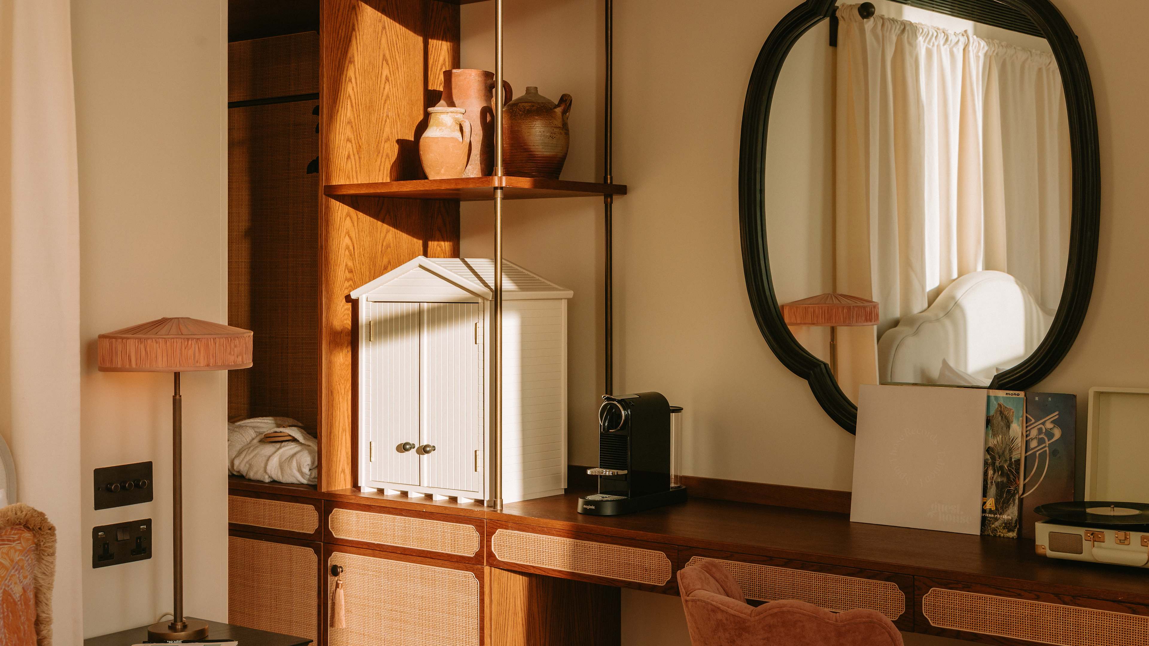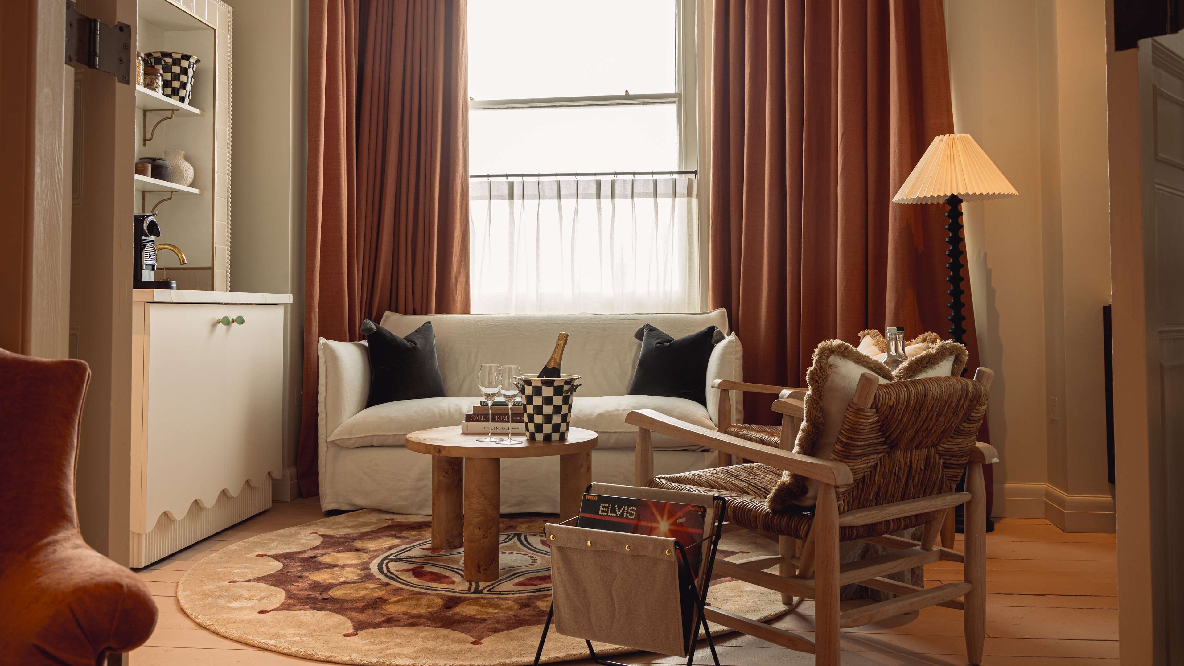 Lounges, games room, winter garden, vinyl library, pantry and terrace, and free WiFi. In rooms: air-conditioning, record player and vinyl, Bluetooth Roberts Radio, smart TV with streaming services, coffee machine (with compostable pods) and tea-making kit, mini fridge with fresh milk and water, beach bags and towels to borrow, refillable water bottle, and Frette bathrobes and slippers.
