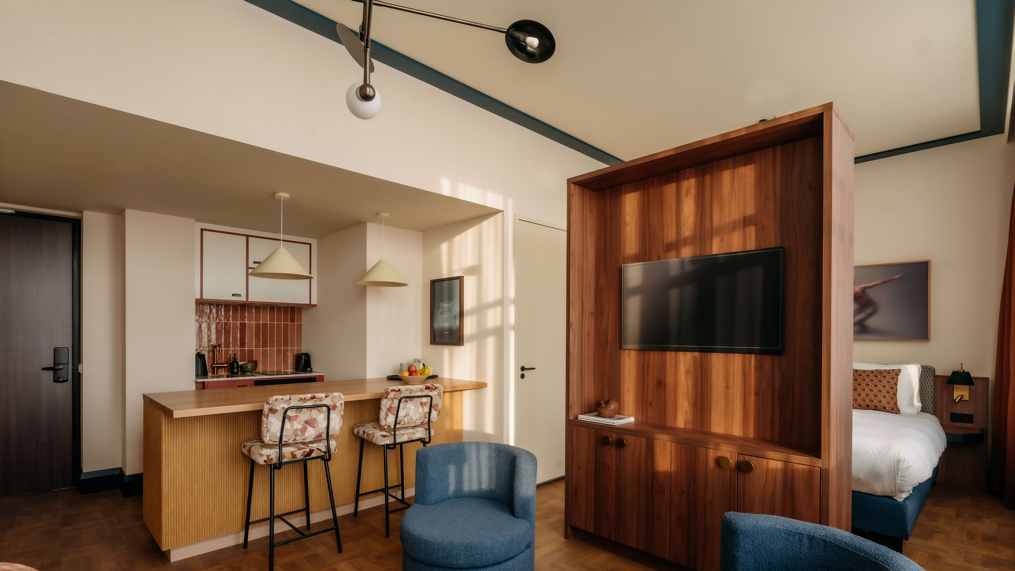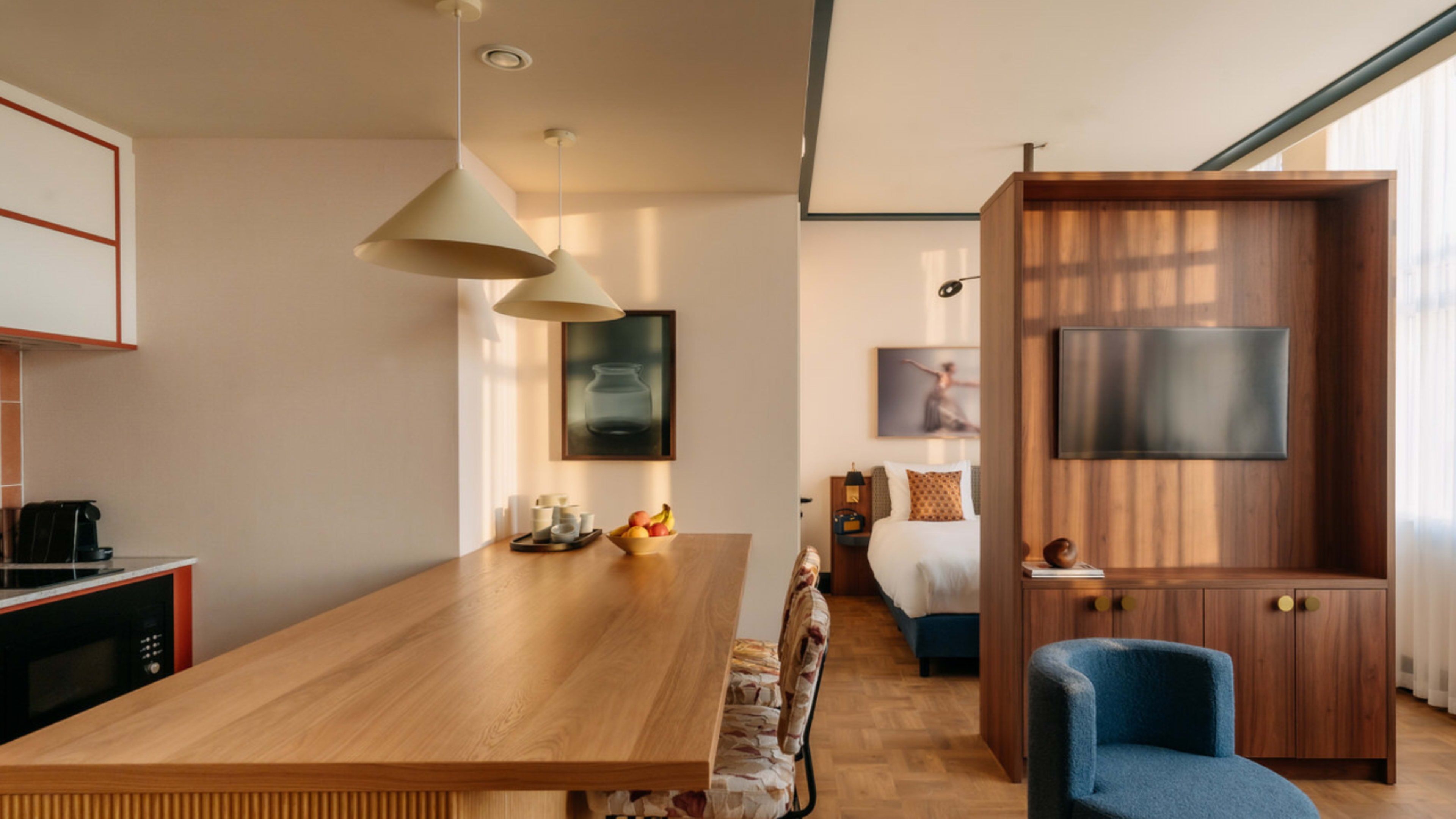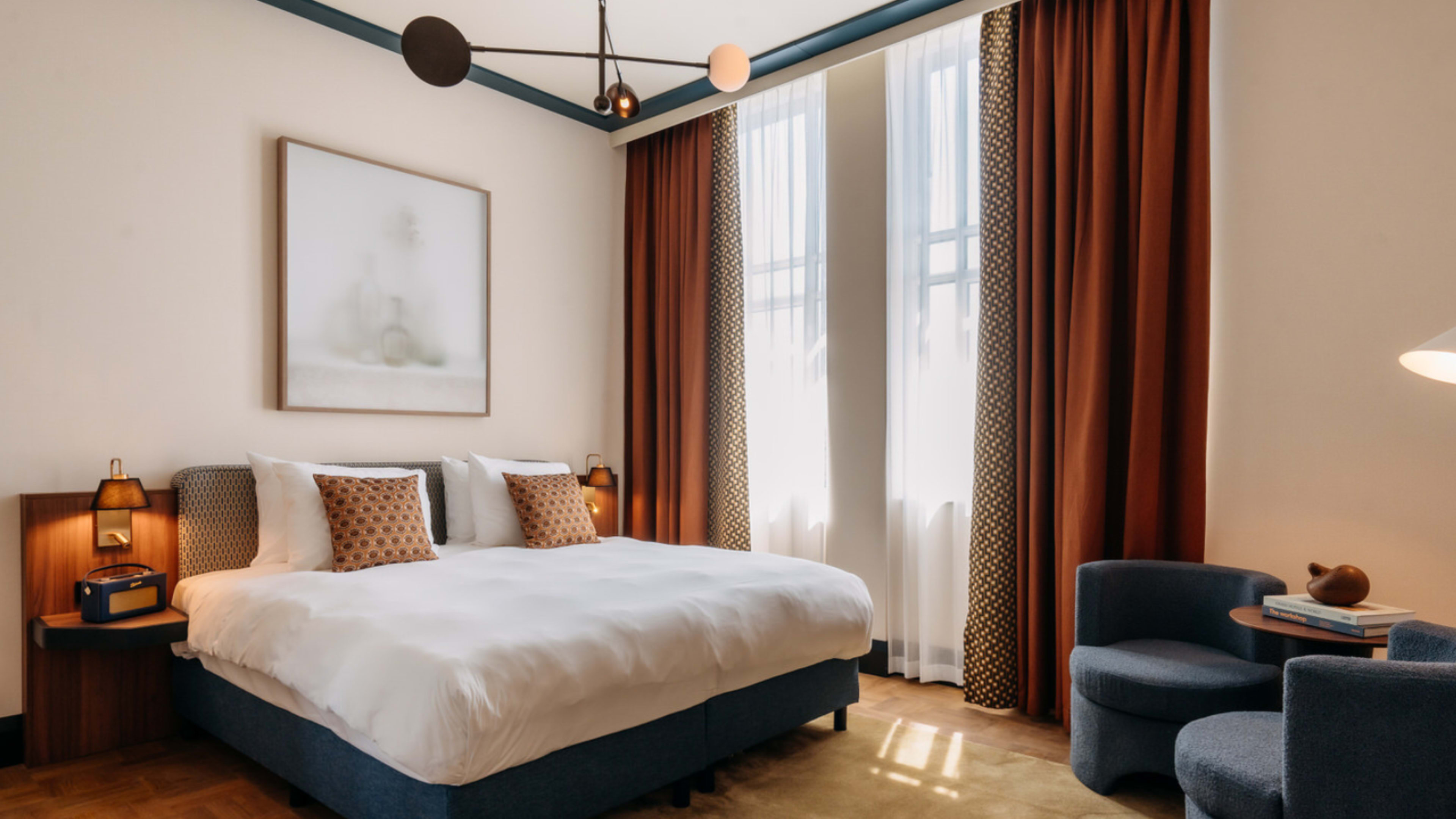 Light-filled and high-ceilinged, rooms and suites at De Plesman vary more by size and layout than decor or view, plus many have a kitchenette. We’re drawn to the open-plan studios for stays à deux; families will want to book suites with made-up sofa-beds; top of house is KLM founder Albert Plesman’s original office — the Plesman Suite — a sprawling expanse of period features, gleaming russet woods and refined, retro furnishings.