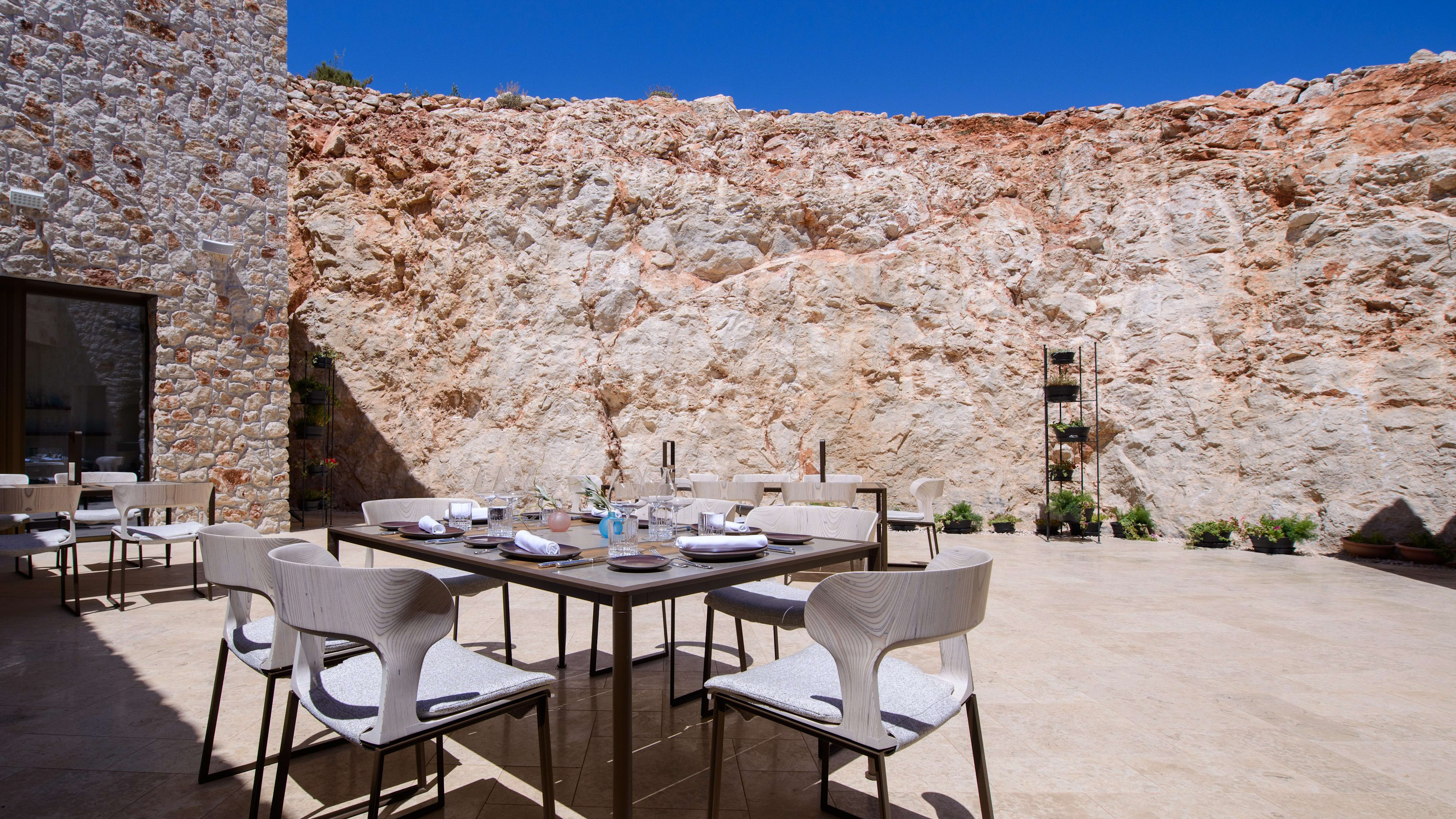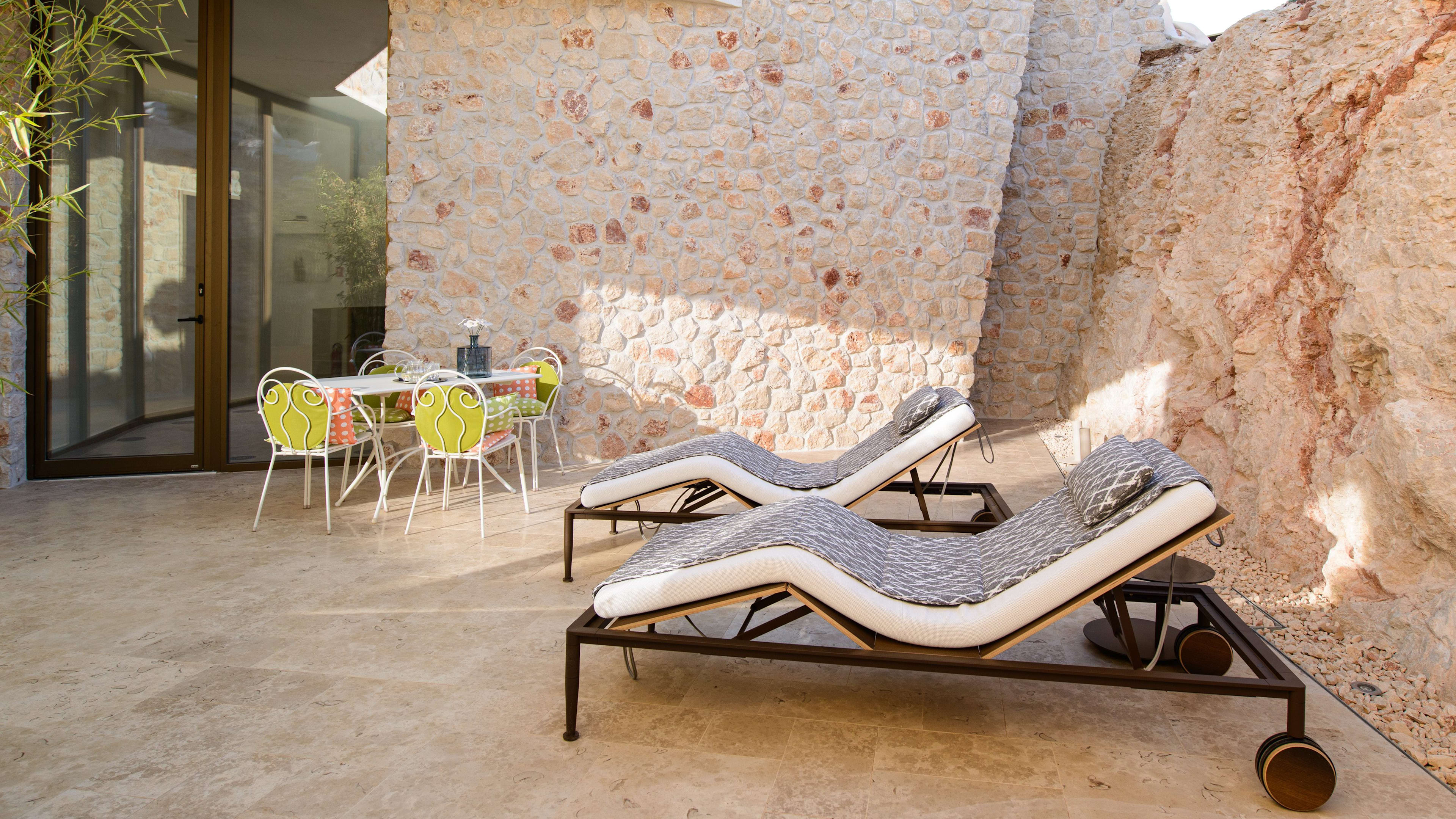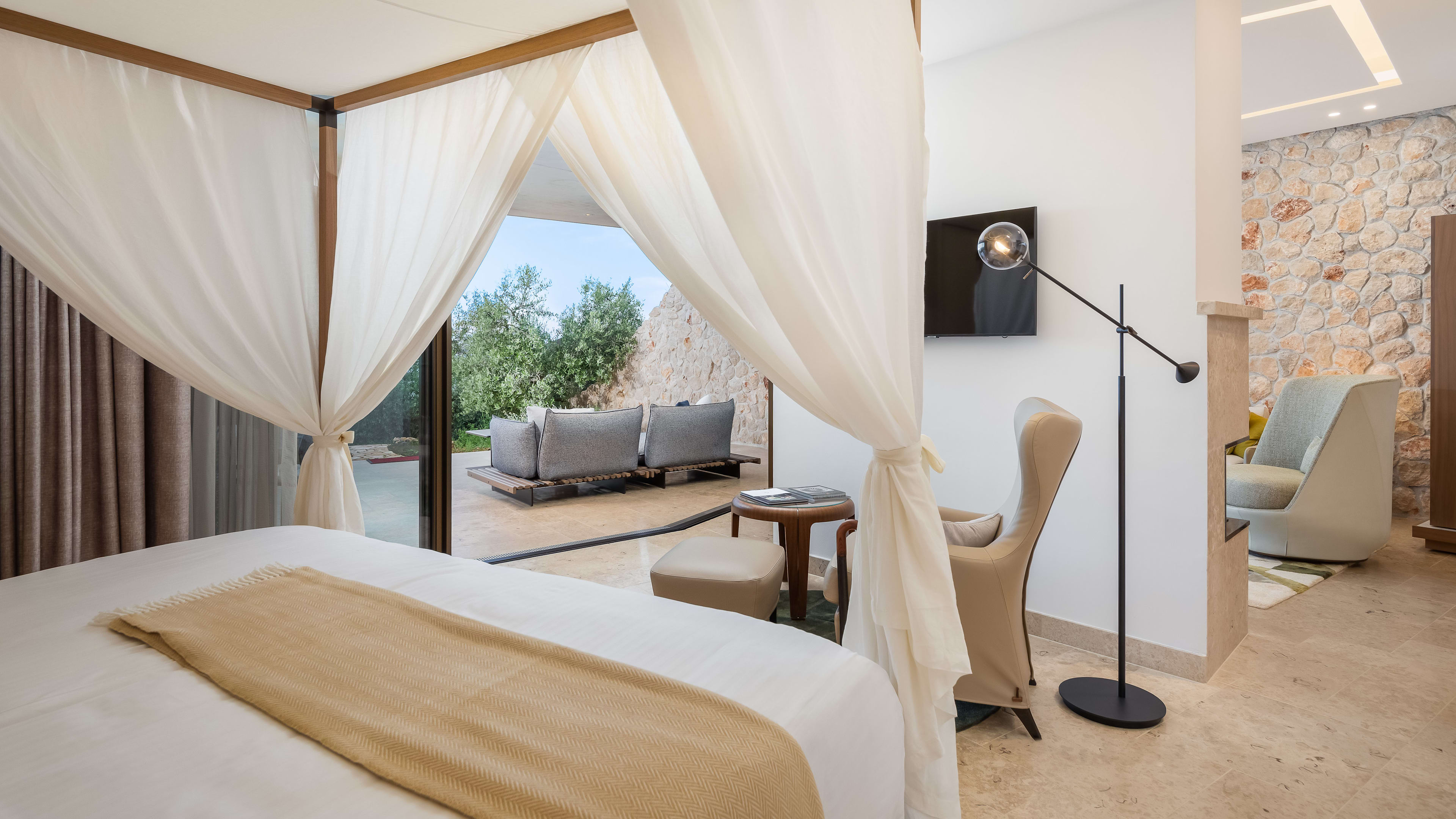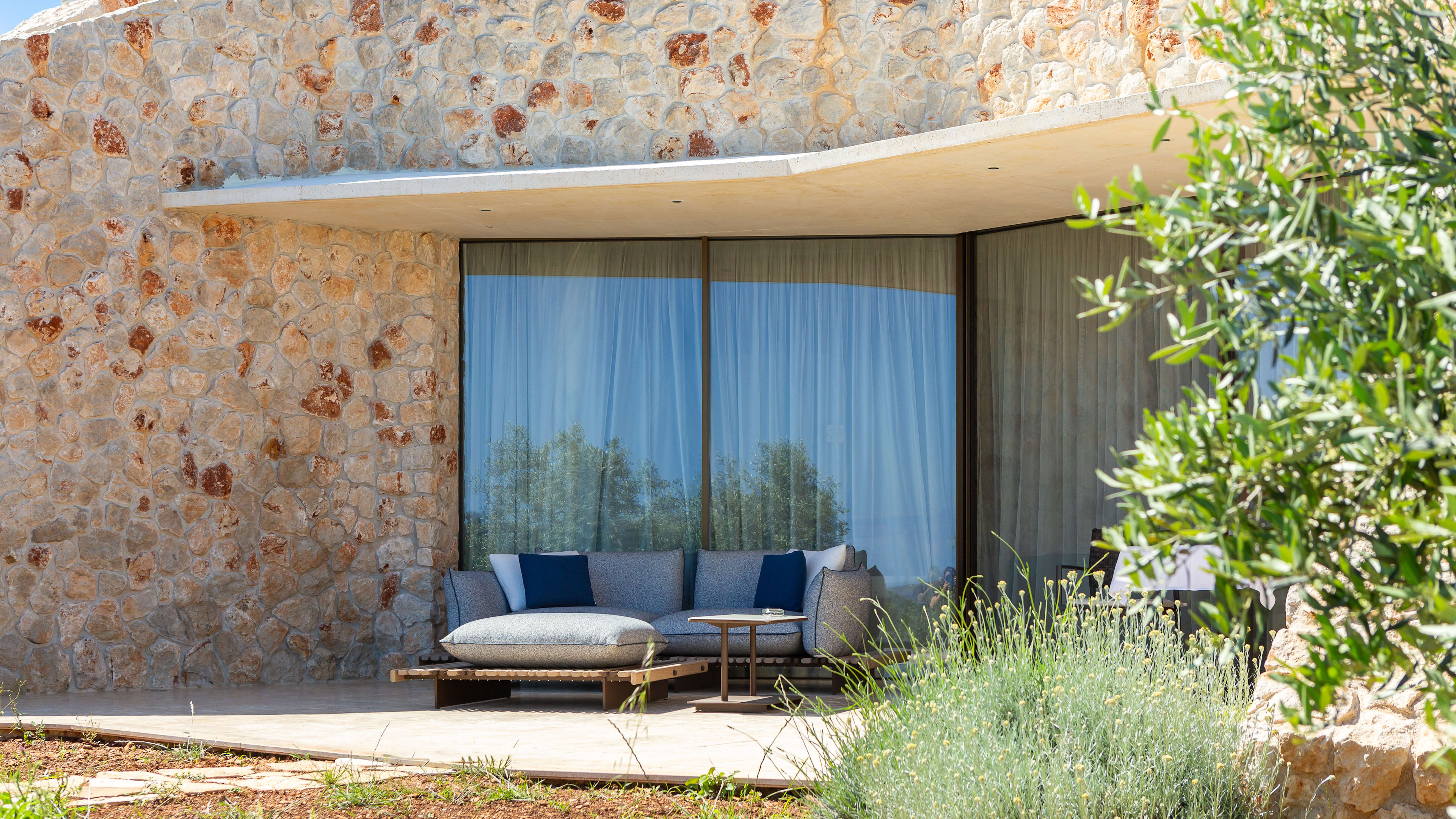 If you’d only shown us the ‘room’ category at Villa Nai 3.3, we would have rated it at suite-level for spaciousness, especially when taking into account the terrace leading out through floor-to-ceiling glass doors. But then we saw the suites, with their canopied four posters, fireplaces and glam living rooms and we were hooked. The rooms are individually decorated, but all keep to the same idea: natural pinks, beiges and terracottas, exposed stone evoking an upscale grotto hideaway, Italian furniture courtesy of Giorgetti injecting some mid-century-modern flair, and super-soft Frette towels and linens. Generously sized bathrooms all come with large soaking tubs and walk-in showers plus thoughtful extra touches, such as adjustable mirrors to suit guests of all heights.