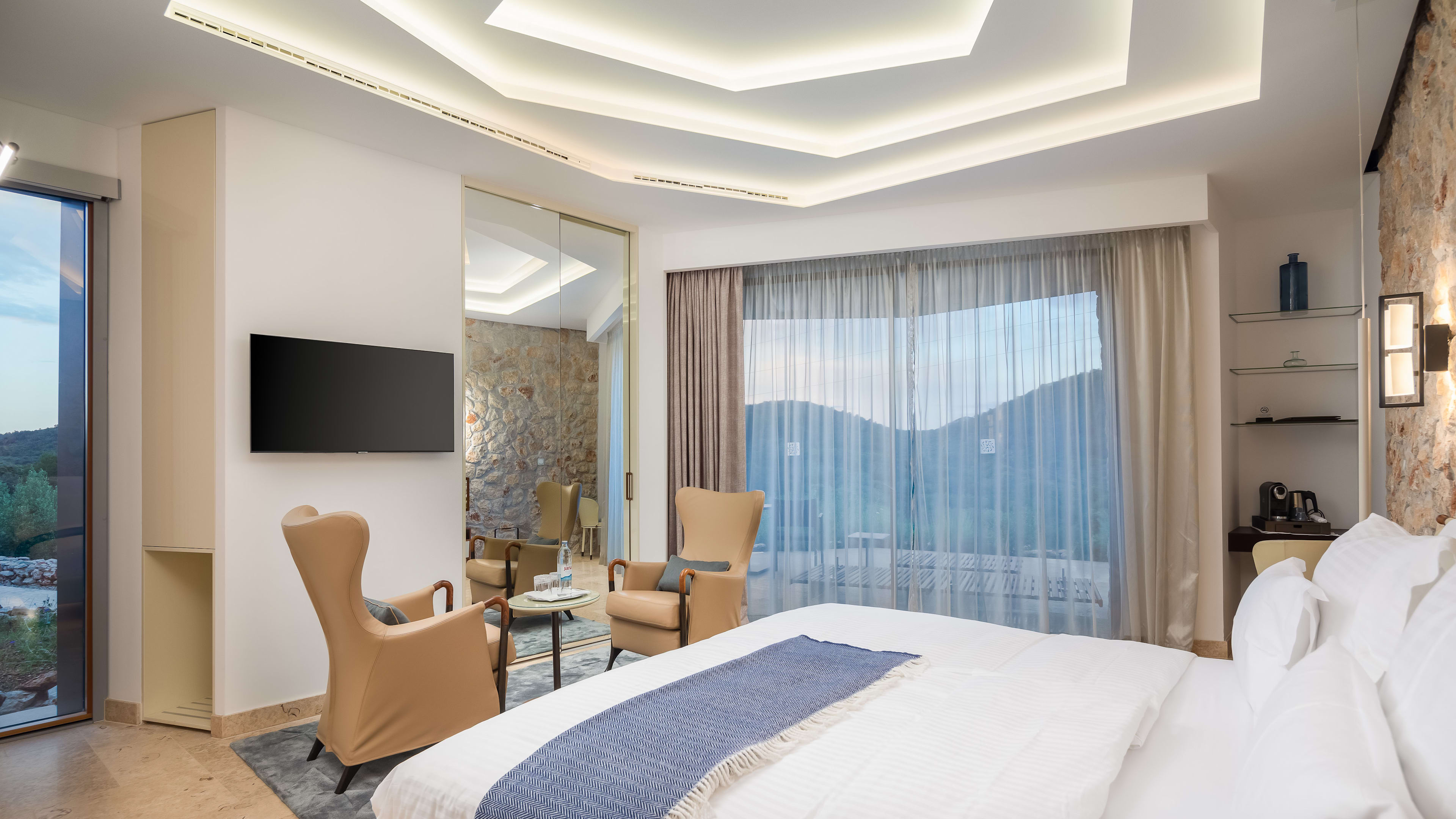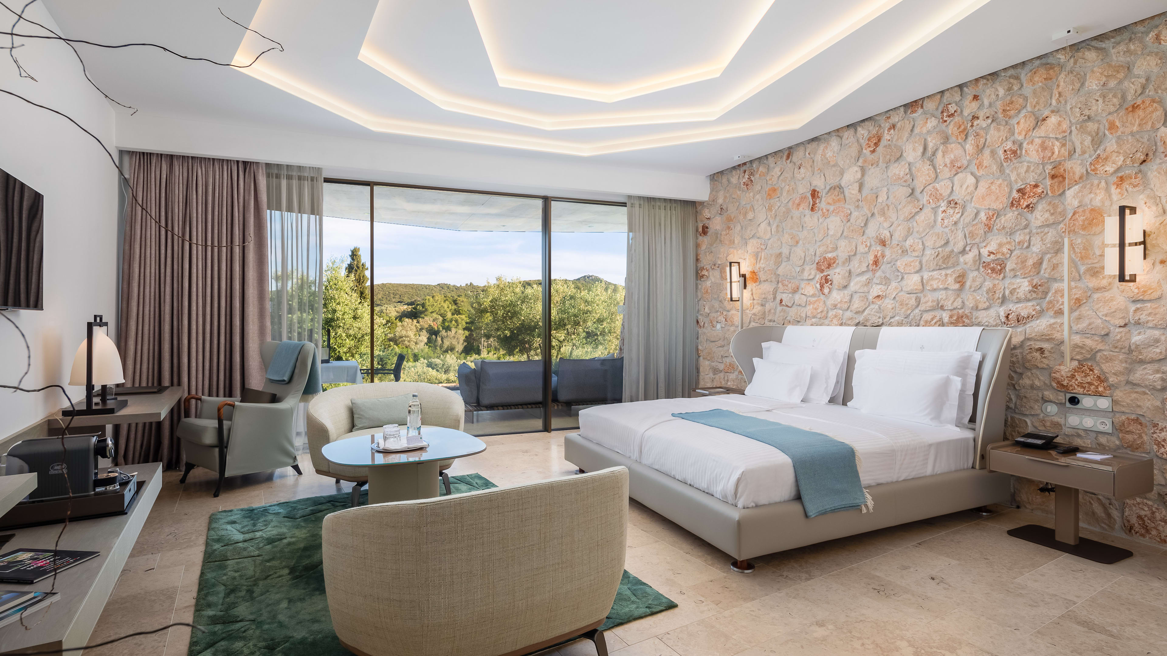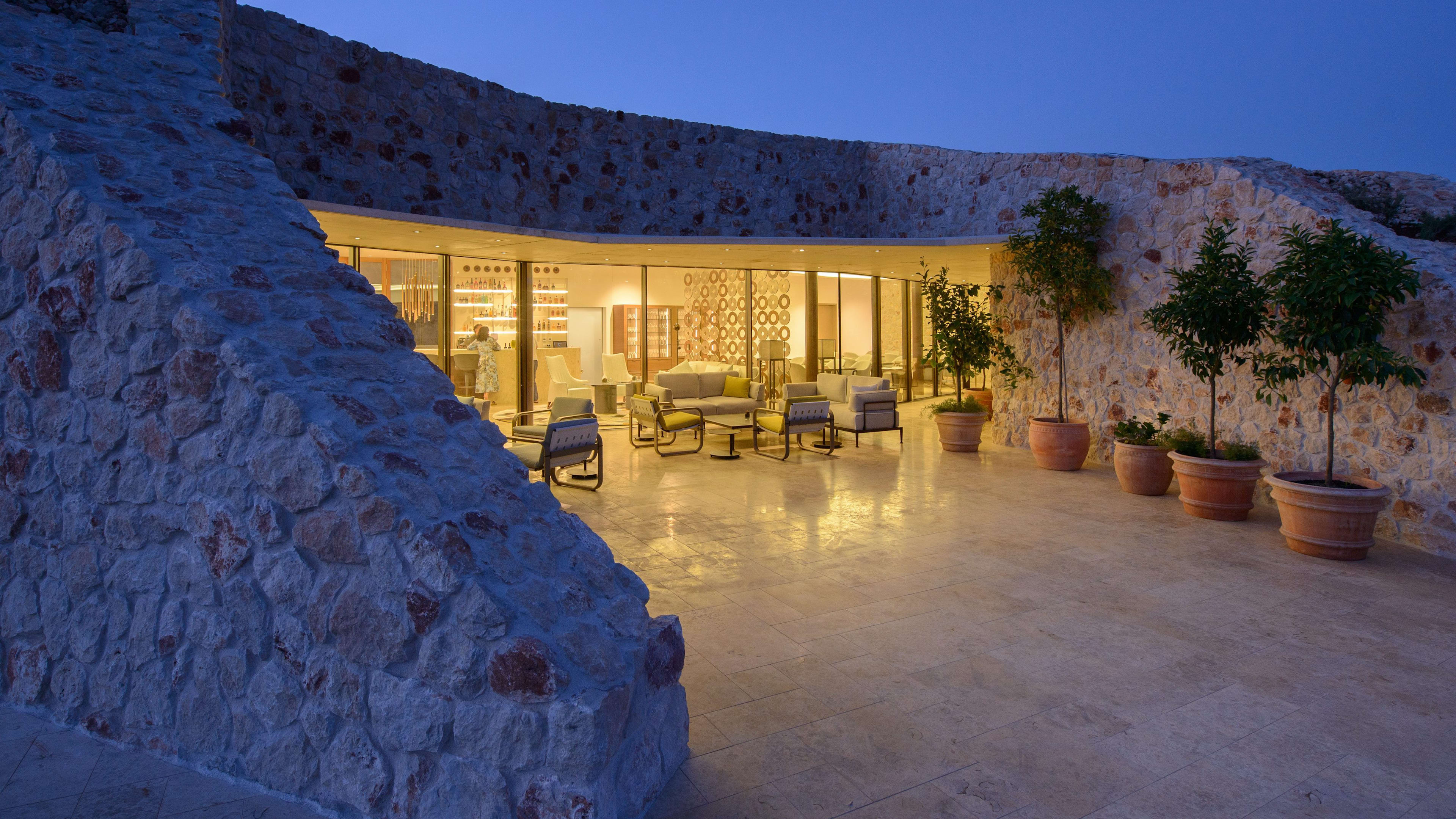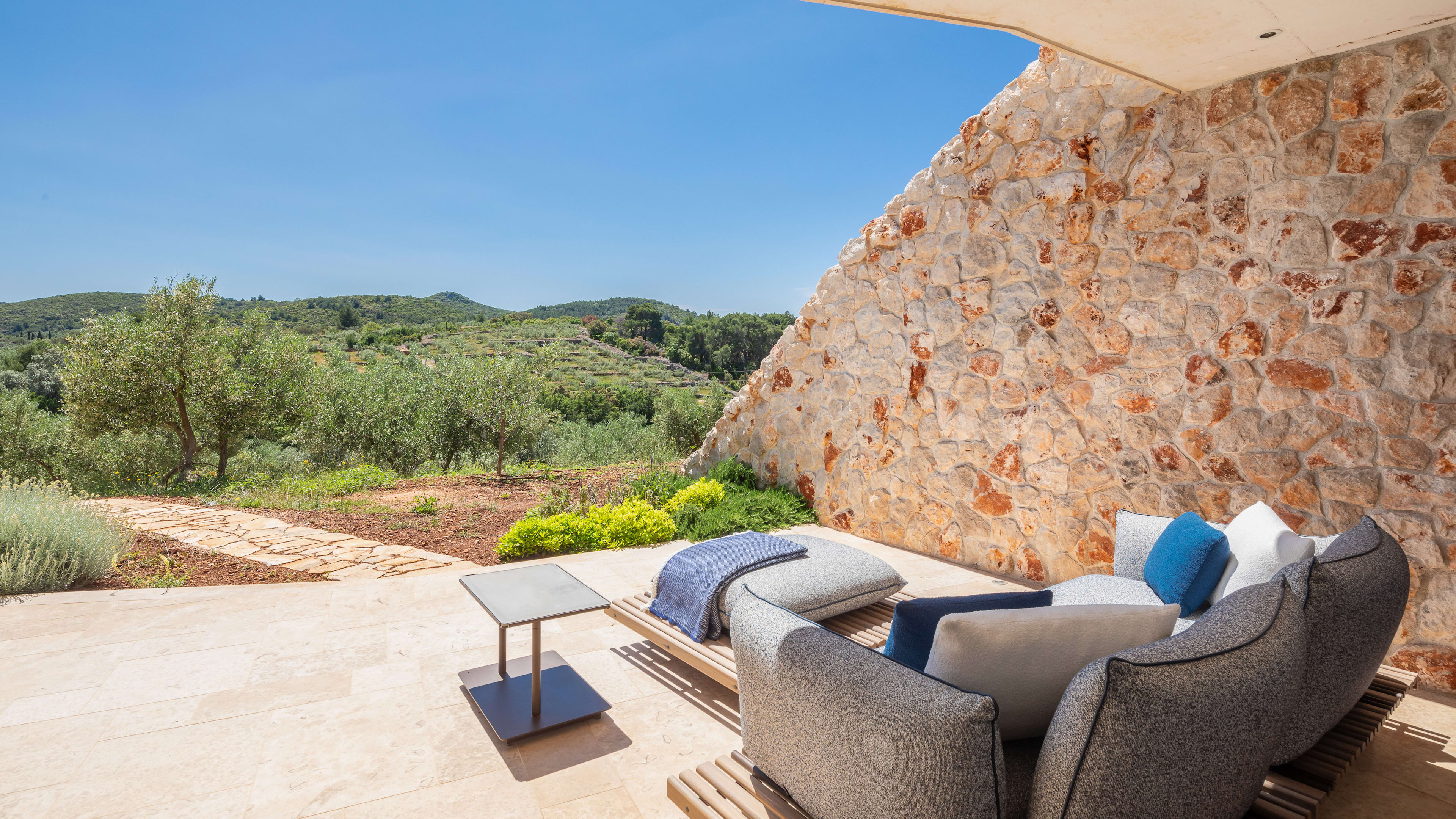 Inside the light-filled spa, you can choose a scent for your Finnish-style sauna session, then relax in the sunken saltwater pool or take a breather in the outdoor relaxation area. There’s a treatment room for all sorts of wellbeing-boosting treats, where your skin can feel the benefits of the famous olive oil and paste made from the fruits of the grove outside. Choose from Balinese and Thai massages, cold plasma skin treatments, and more. There’s a small outdoor gym area with stationary bike, elliptical machine and yoga mats for your open-air sun salutations, plus one clay tennis court.