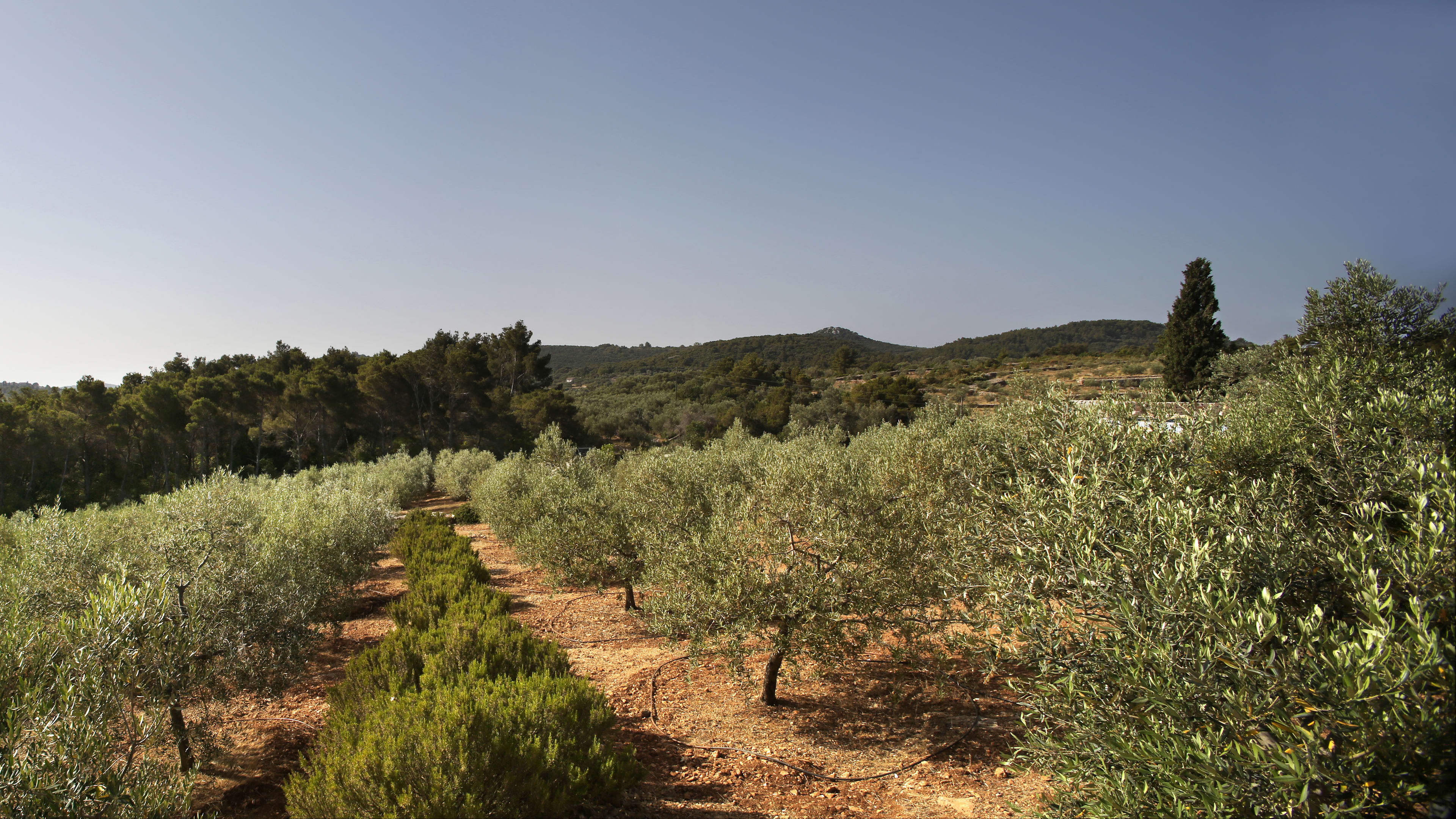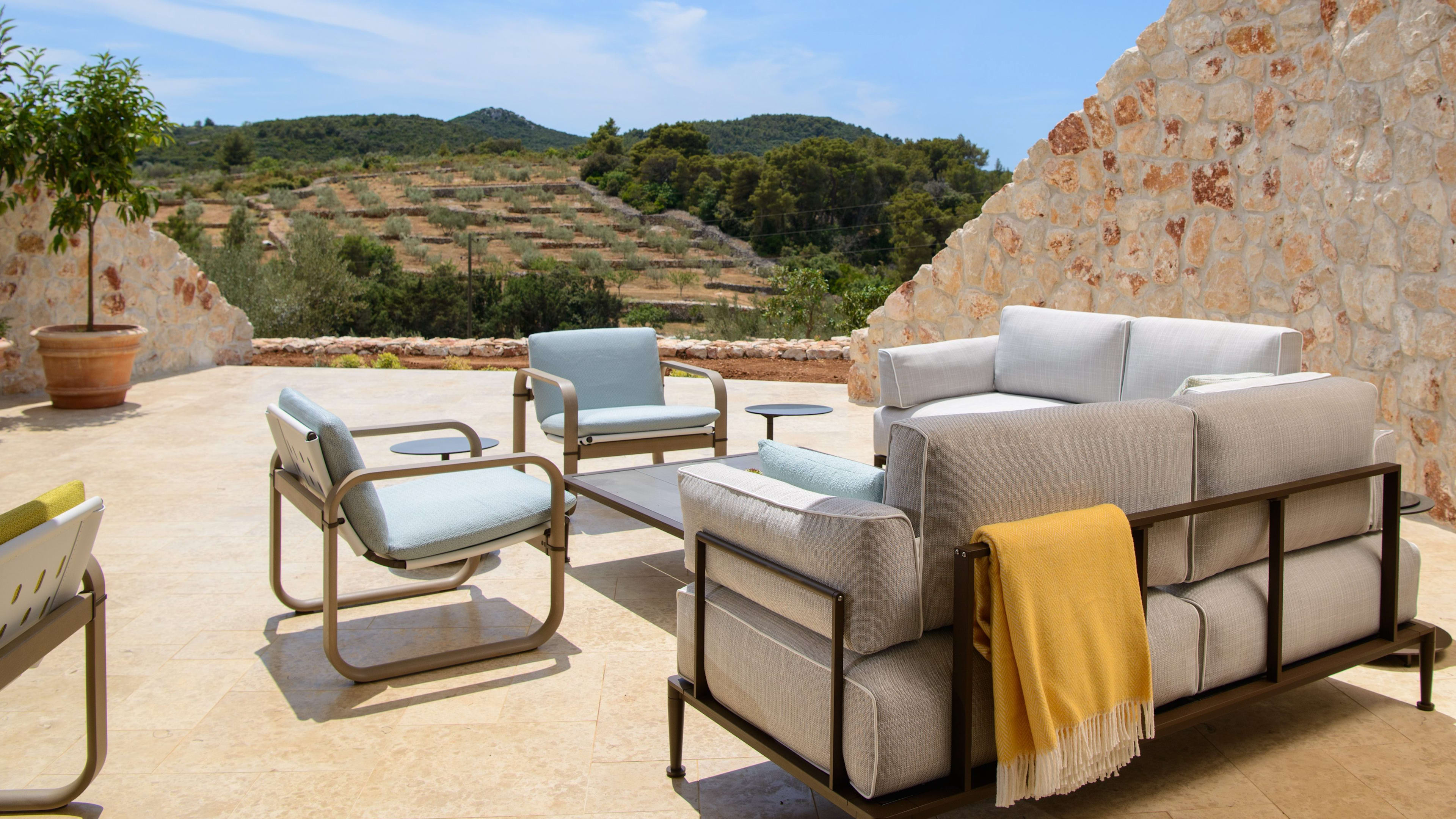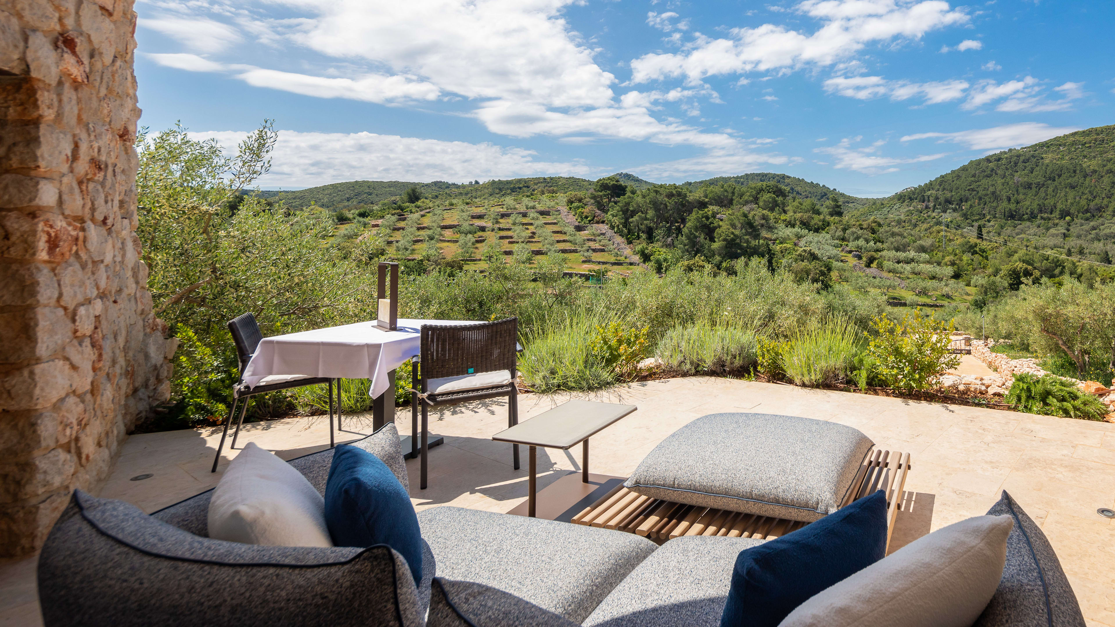 Sit out on the expansive terrace with its sweeping views over olive grove and sea. If the weather isn’t playing ball, a dining room table by the full-length windows is the next best thing.