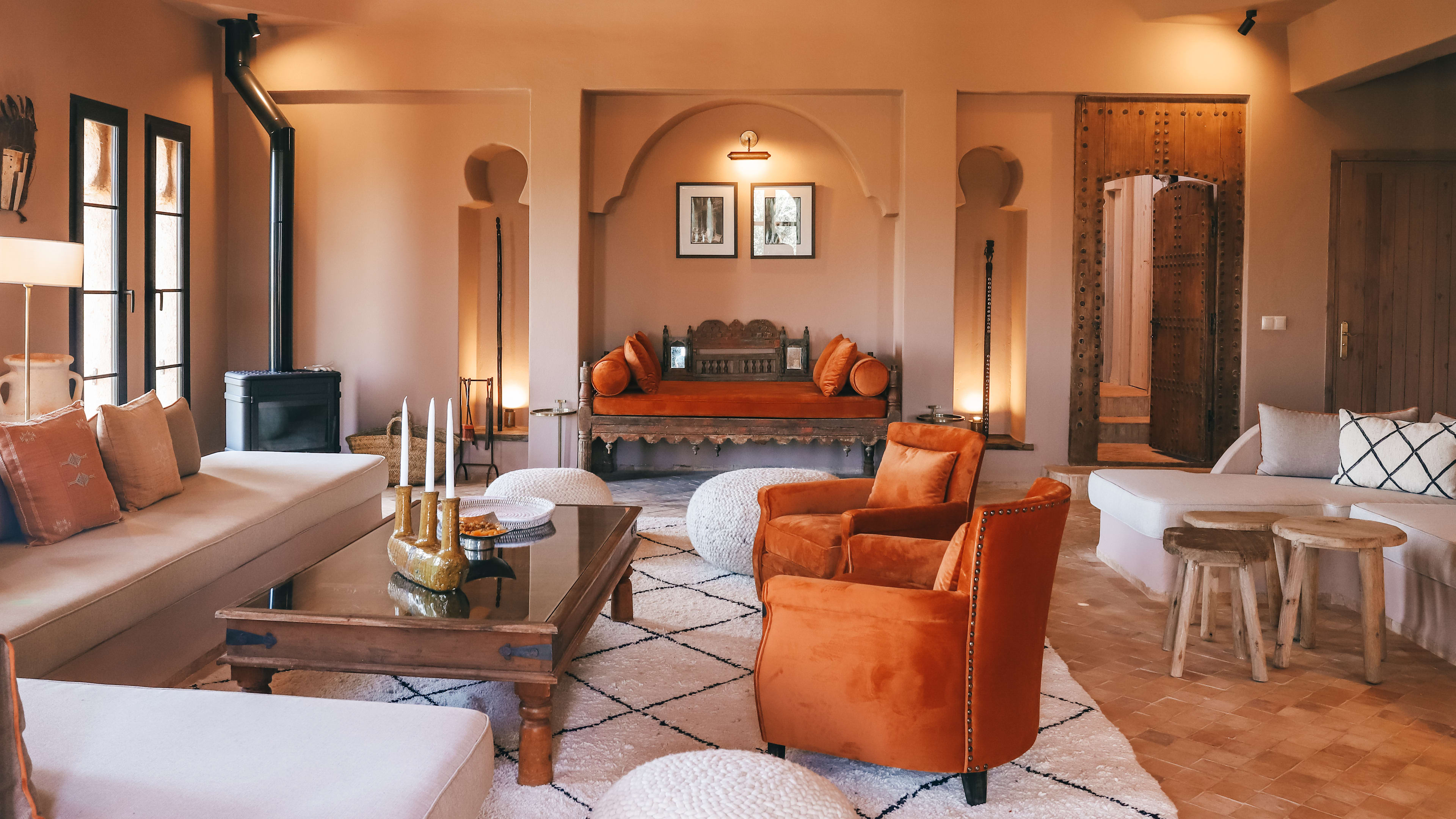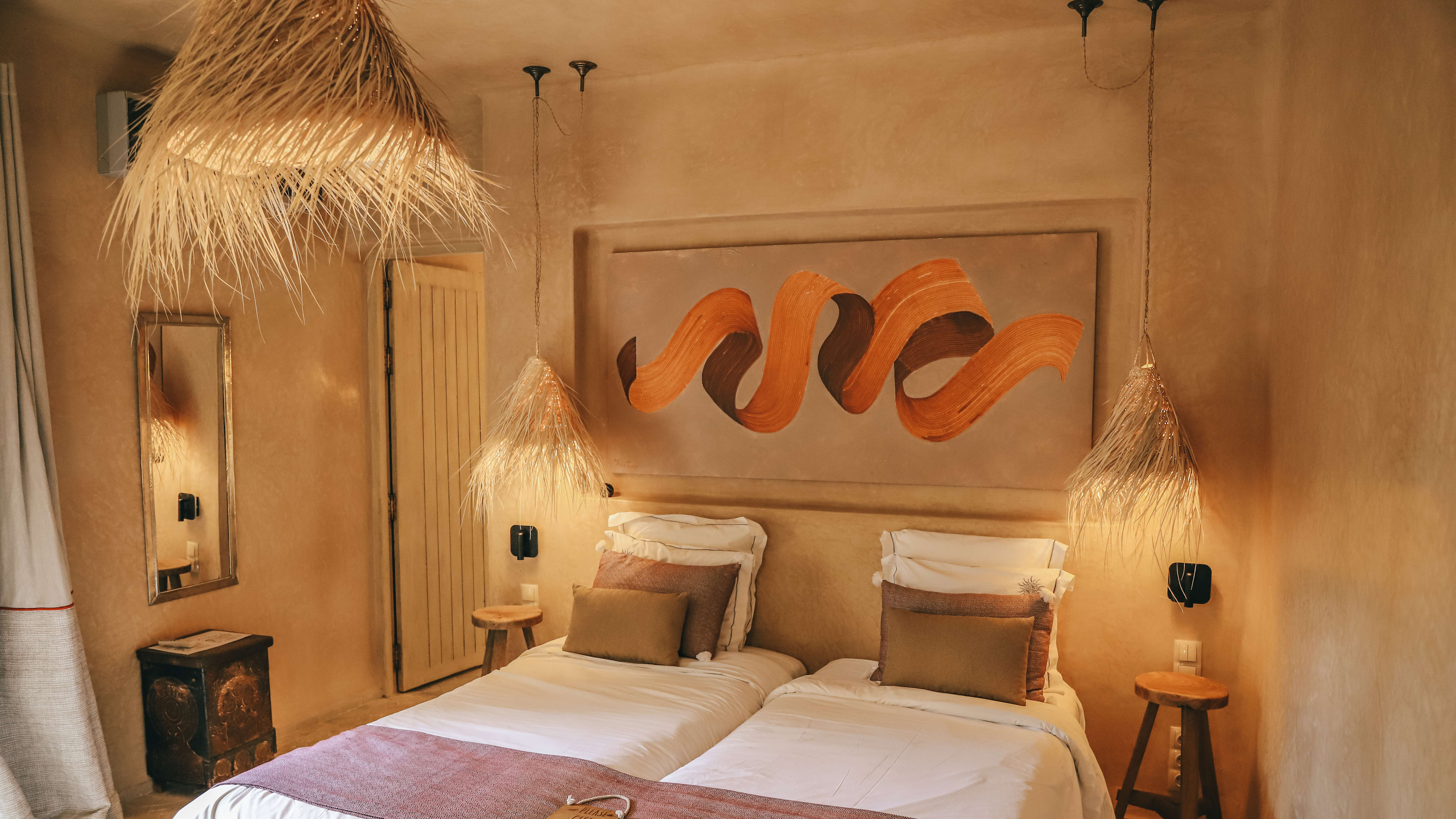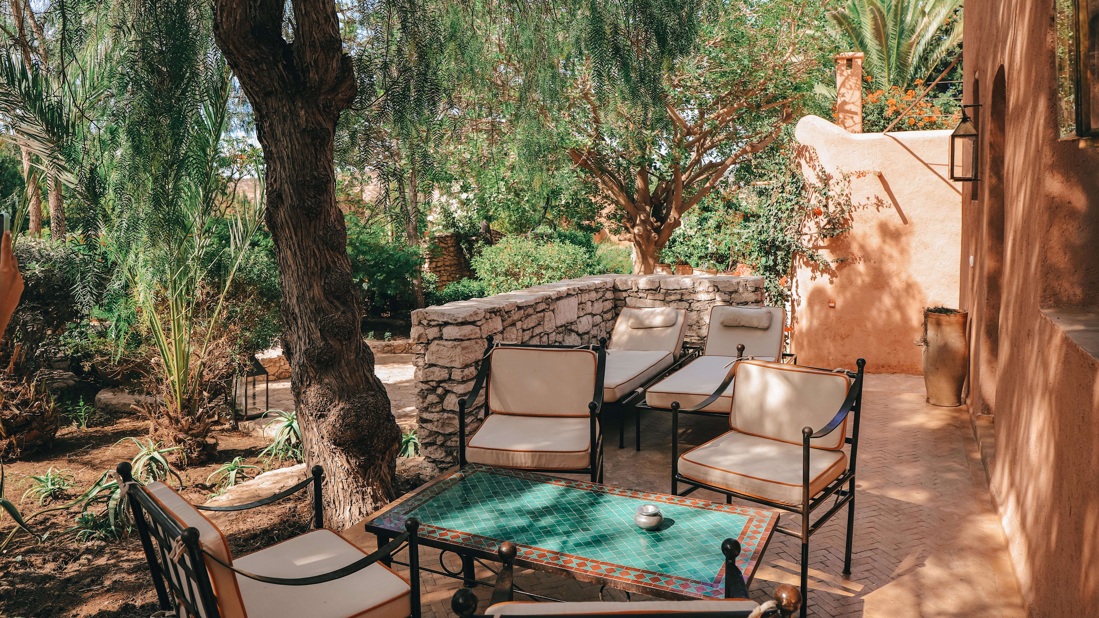 The hotel is a celebration of Maghrebin colour and craft, with zelige tiling, smooth tadelakt plasterwork, pierced metalwork and tactile Berber rugs. Rooms have a shabby-chic feel with original wooden doors, and objets trouvés and African masks on the walls; in the bathrooms, you’ll find a mini hammam kit and luxurious Balzatex linens. At the back of the main house, Choukran Room 6 is cosy and cute, with lots of sun in the morning and a shower room; Choukran Room 8 has stunning valley views. Set in two-storey houses in the lush grounds, Pacha Rooms have a private feel, with king-size beds, private outside terraces, seductive sunken baths and a corner fireplace. If you’re travelling en famille, the Mogador Suite is a two-level extravaganza with a double bedroom, another bedroom with three single beds, a living area and two rooftop terraces from which to admire the grove-dotted hills and riverbed below.