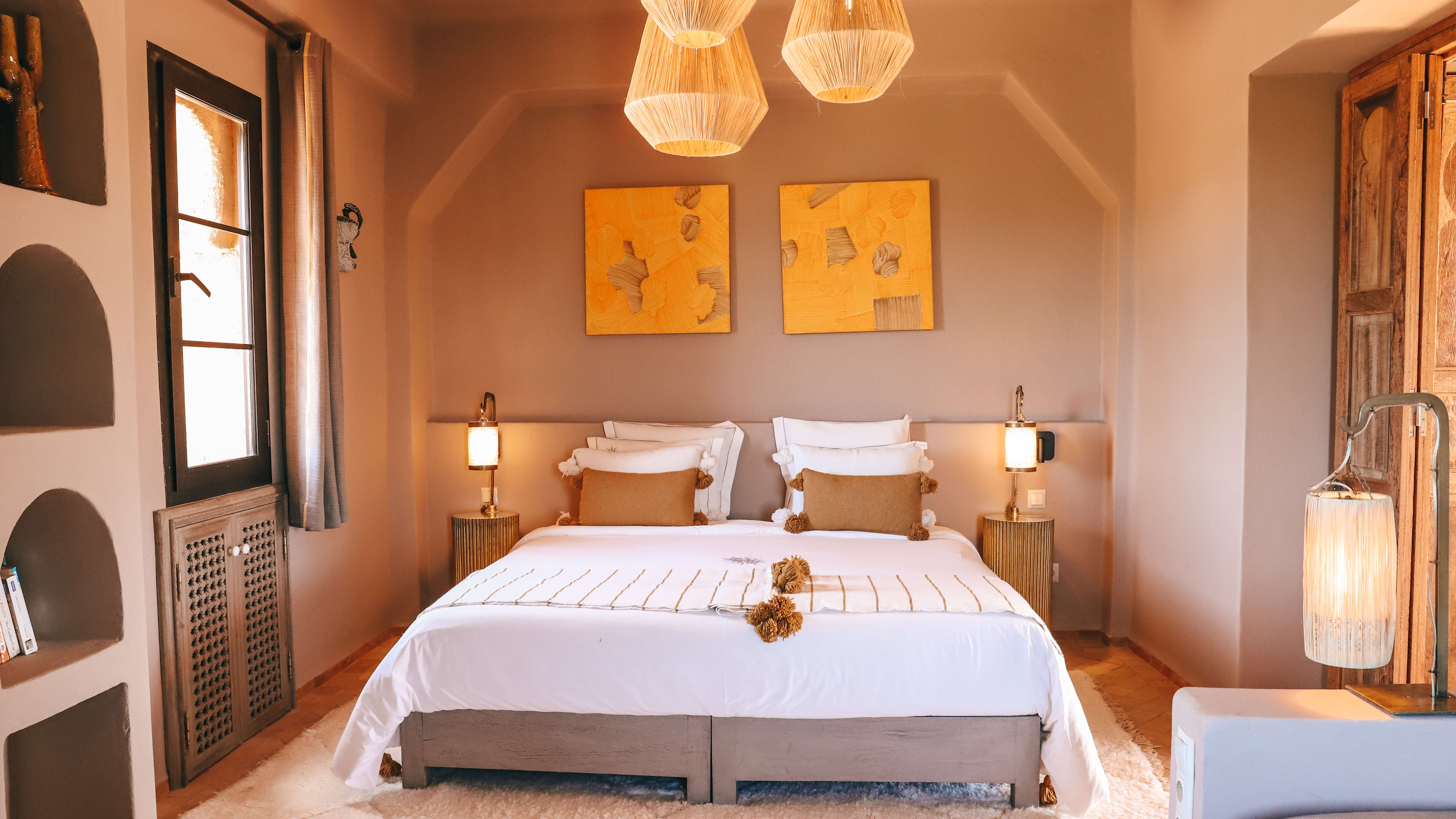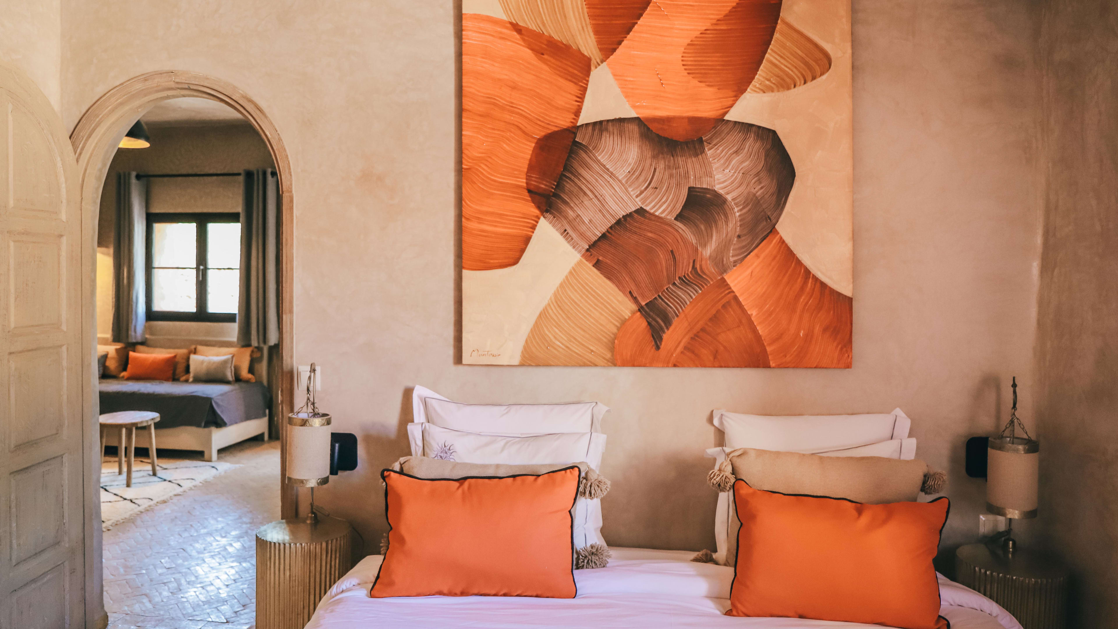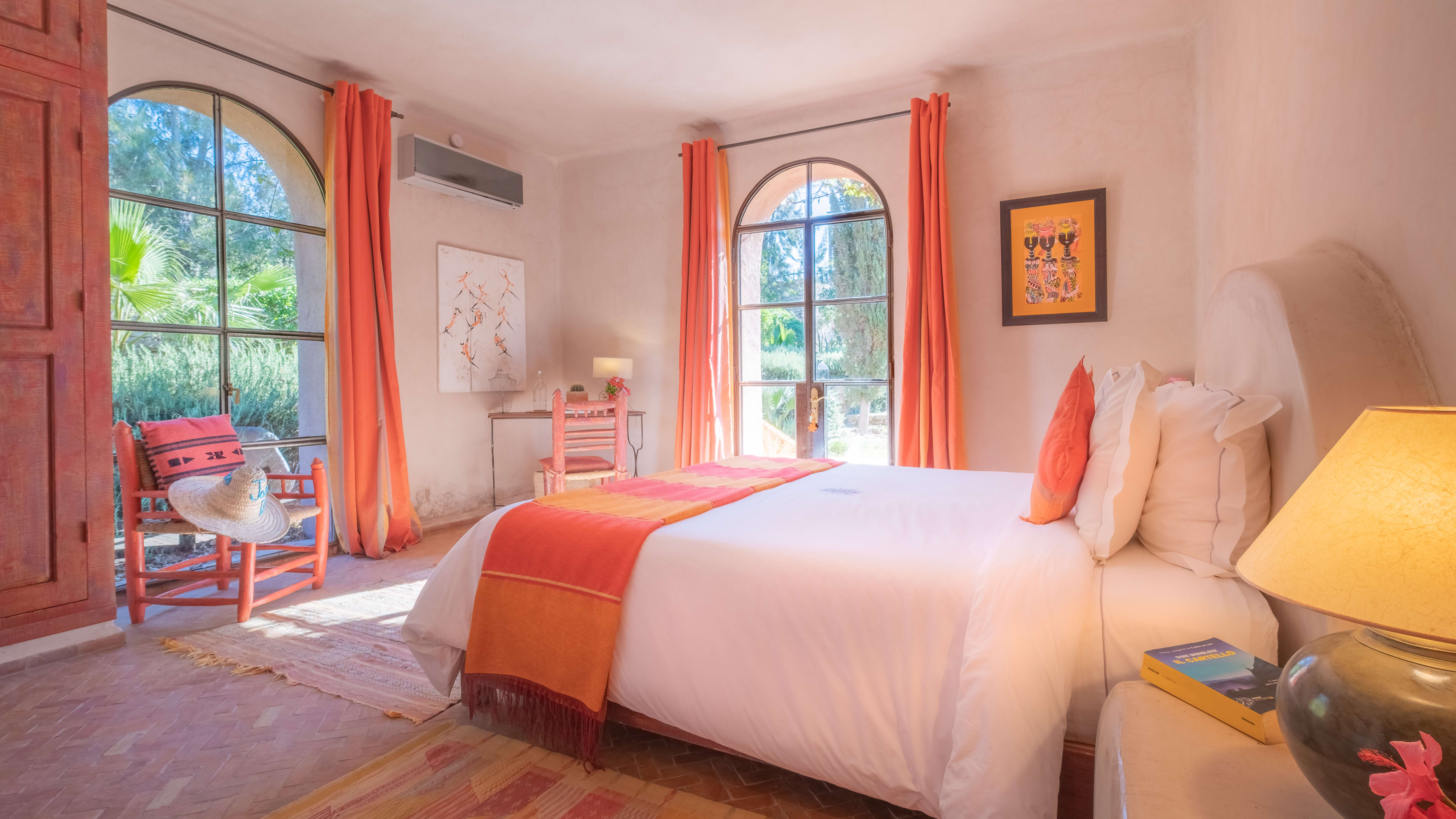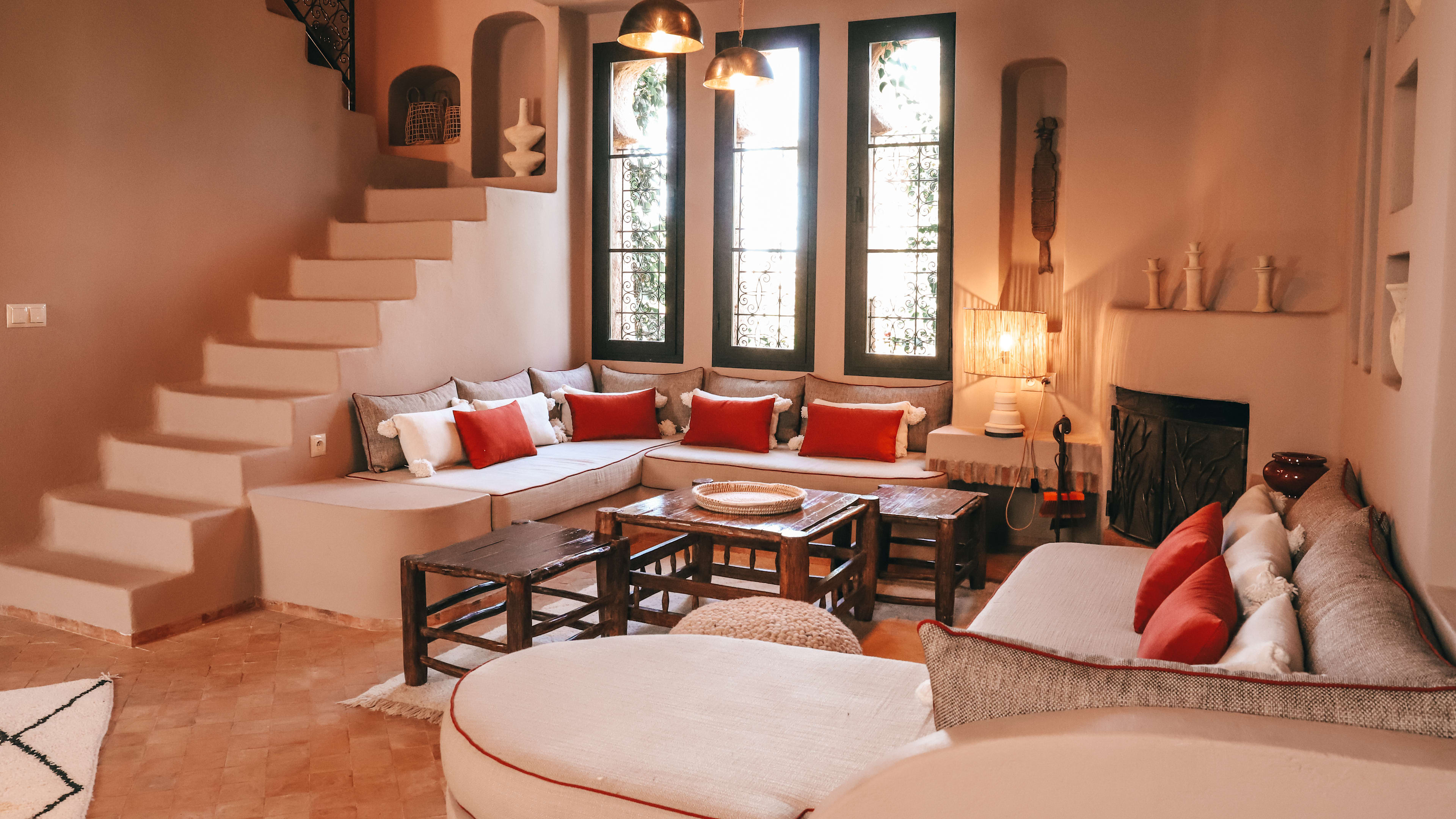 The hotel is a celebration of Maghrebin colour and craft, with zelige tiling, smooth tadelakt plasterwork, pierced metalwork and tactile Berber rugs. Rooms have a shabby-chic feel with original wooden doors, and objets trouvés and African masks on the walls; in the bathrooms, you’ll find a mini hammam kit and luxurious Balzatex linens. At the back of the main house, Choukran Room 6 is cosy and cute, with lots of sun in the morning and a shower room; Choukran Room 8 has stunning valley views. Set in two-storey houses in the lush grounds, Pacha Rooms have a private feel, with king-size beds, private outside terraces, seductive sunken baths and a corner fireplace. If you’re travelling en famille, the Mogador Suite is a two-level extravaganza with a double bedroom, another bedroom with three single beds, a living area and two rooftop terraces from which to admire the grove-dotted hills and riverbed below.