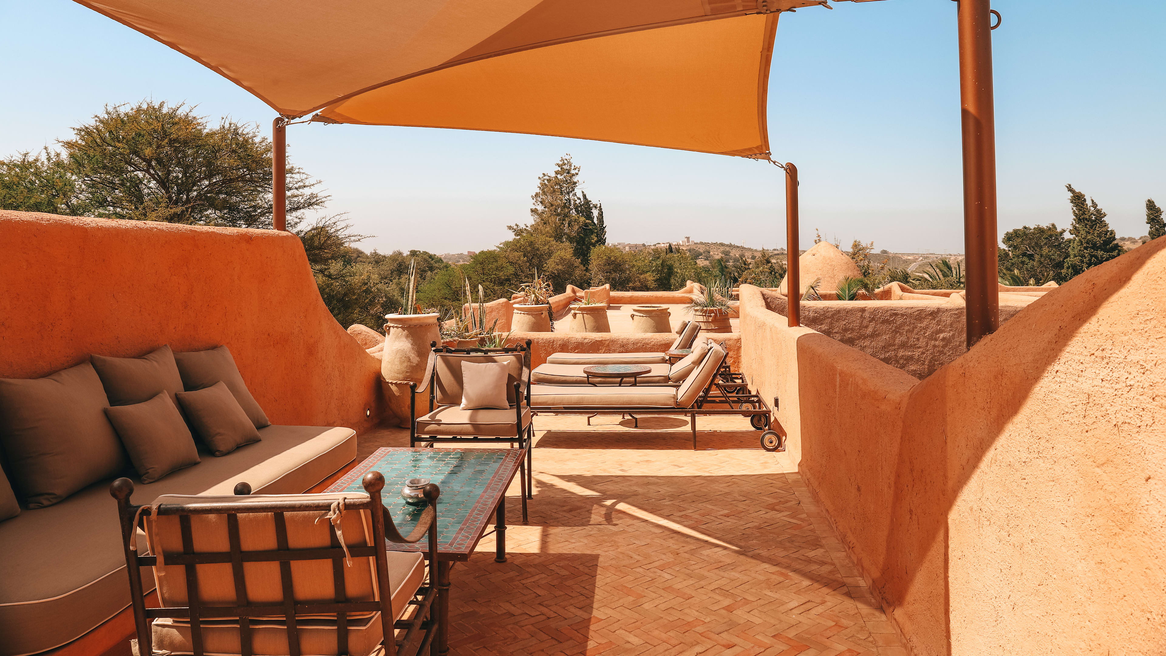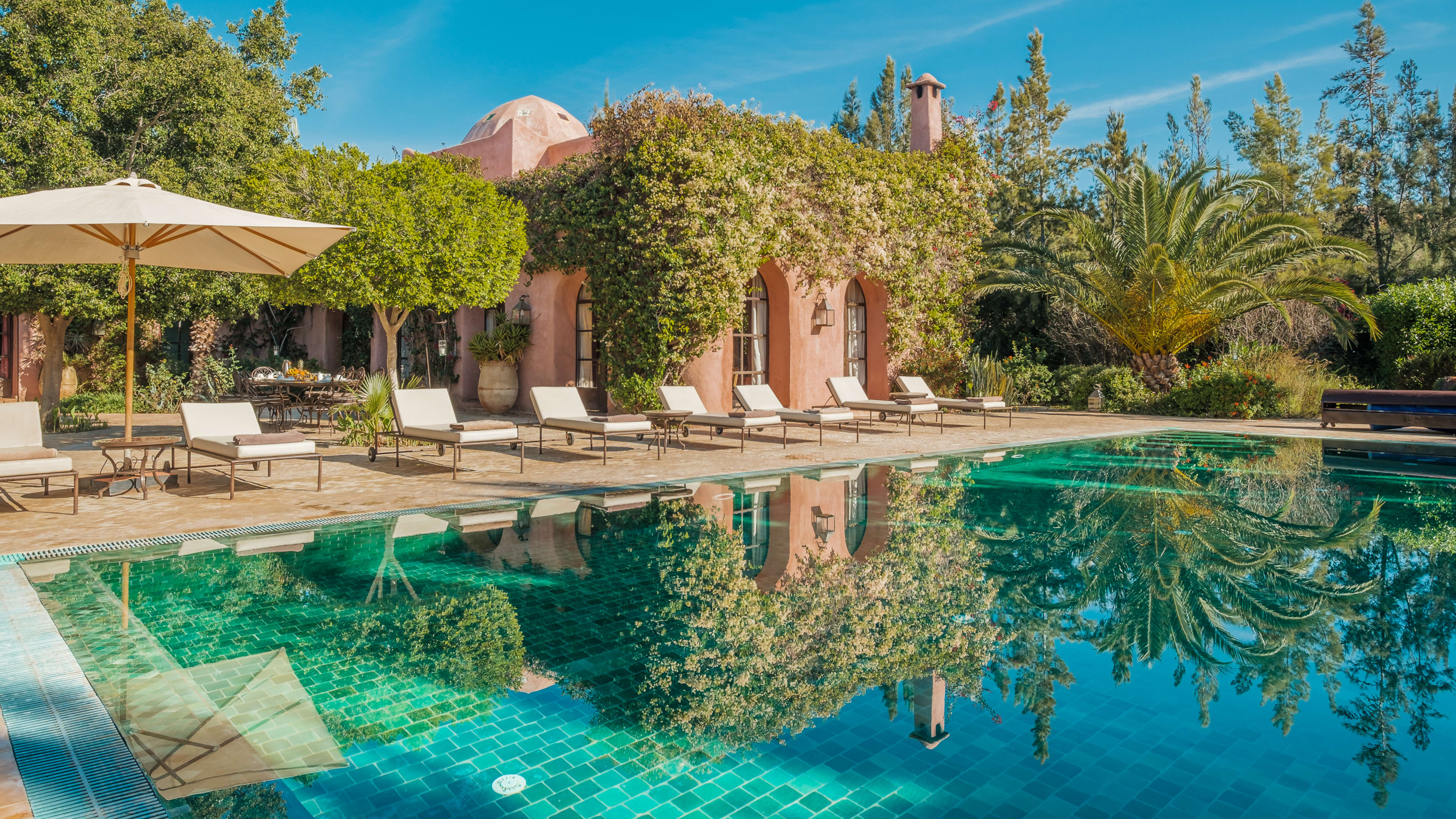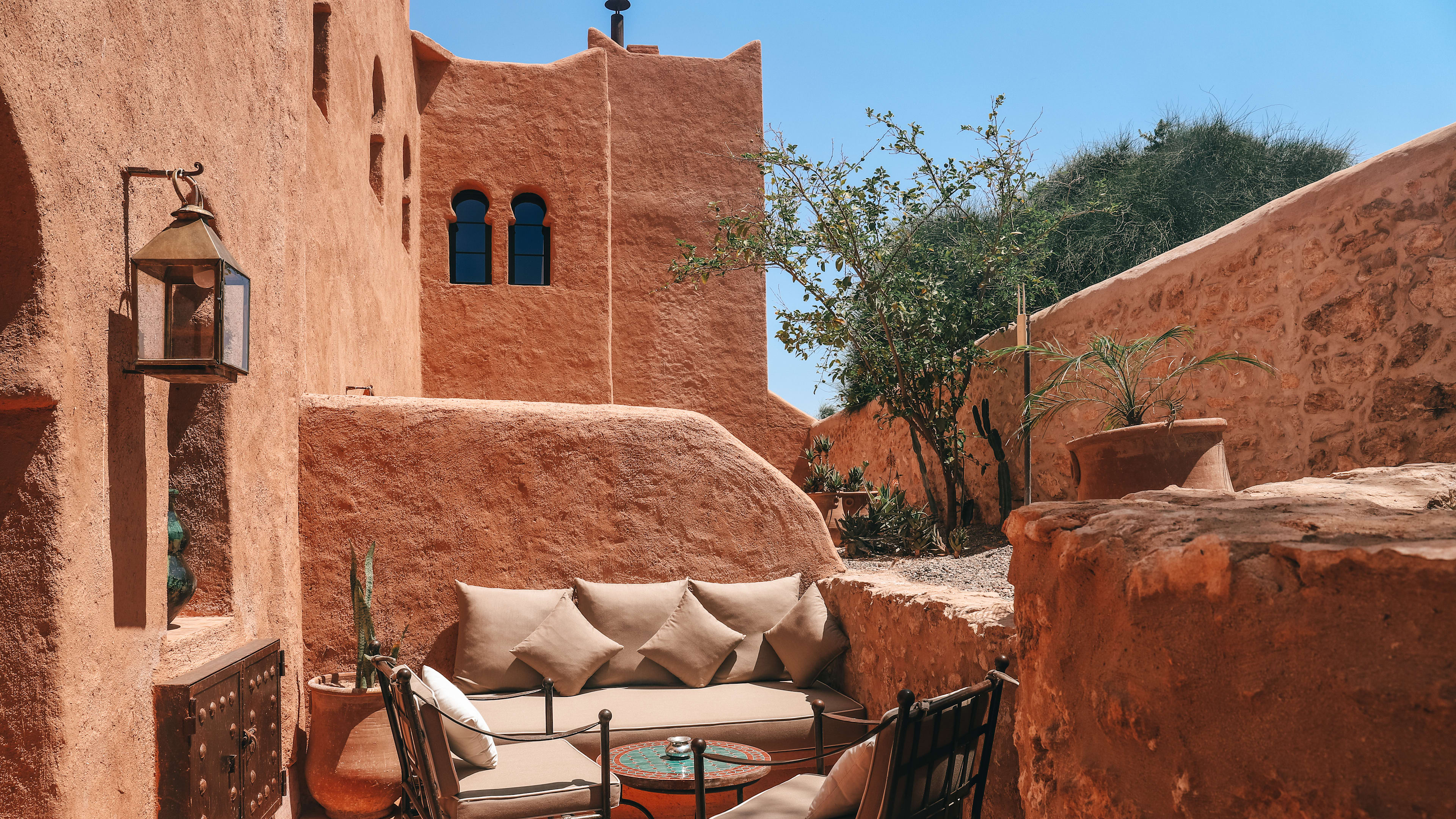 The adults-only infinity pool is a chic rectangular affair, tiled in blood-red and peacock-green zelige, surrounded by wrought iron day-bed and straw parasols. It’s heated from October to May and the perfect setting for some quiet sun-worshipping or purposeful laps. On the other side of the main house, the family-friendly pool is protected by a grove of olive and argan trees, with a shallow circular area perfect for babies, and some changing rooms nearby.