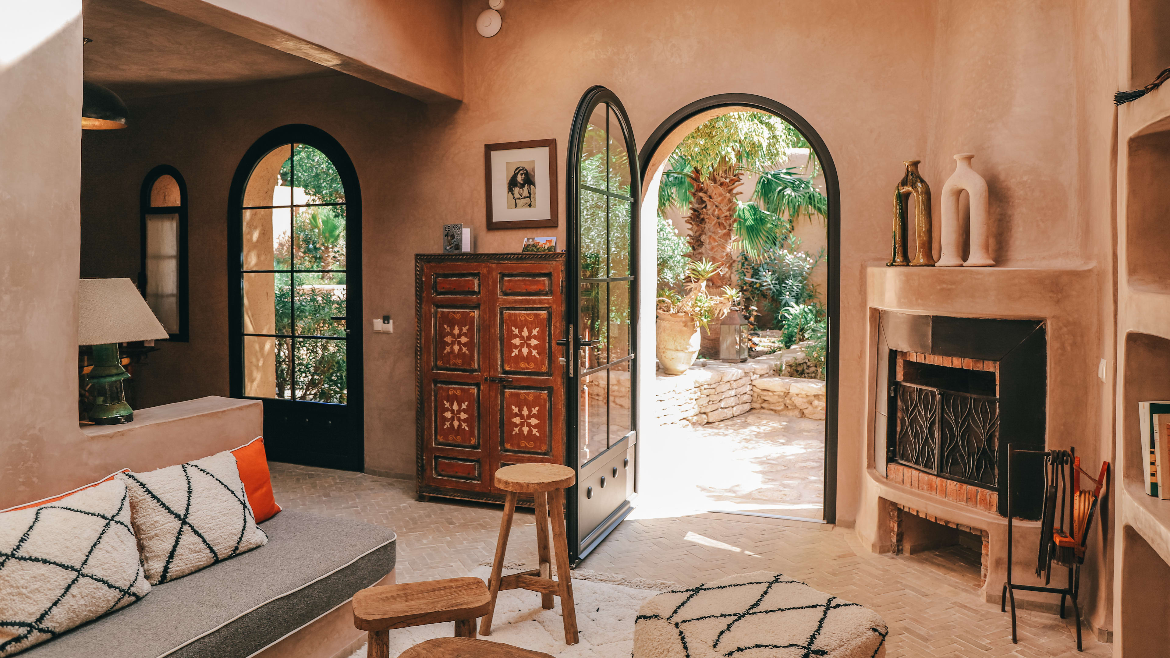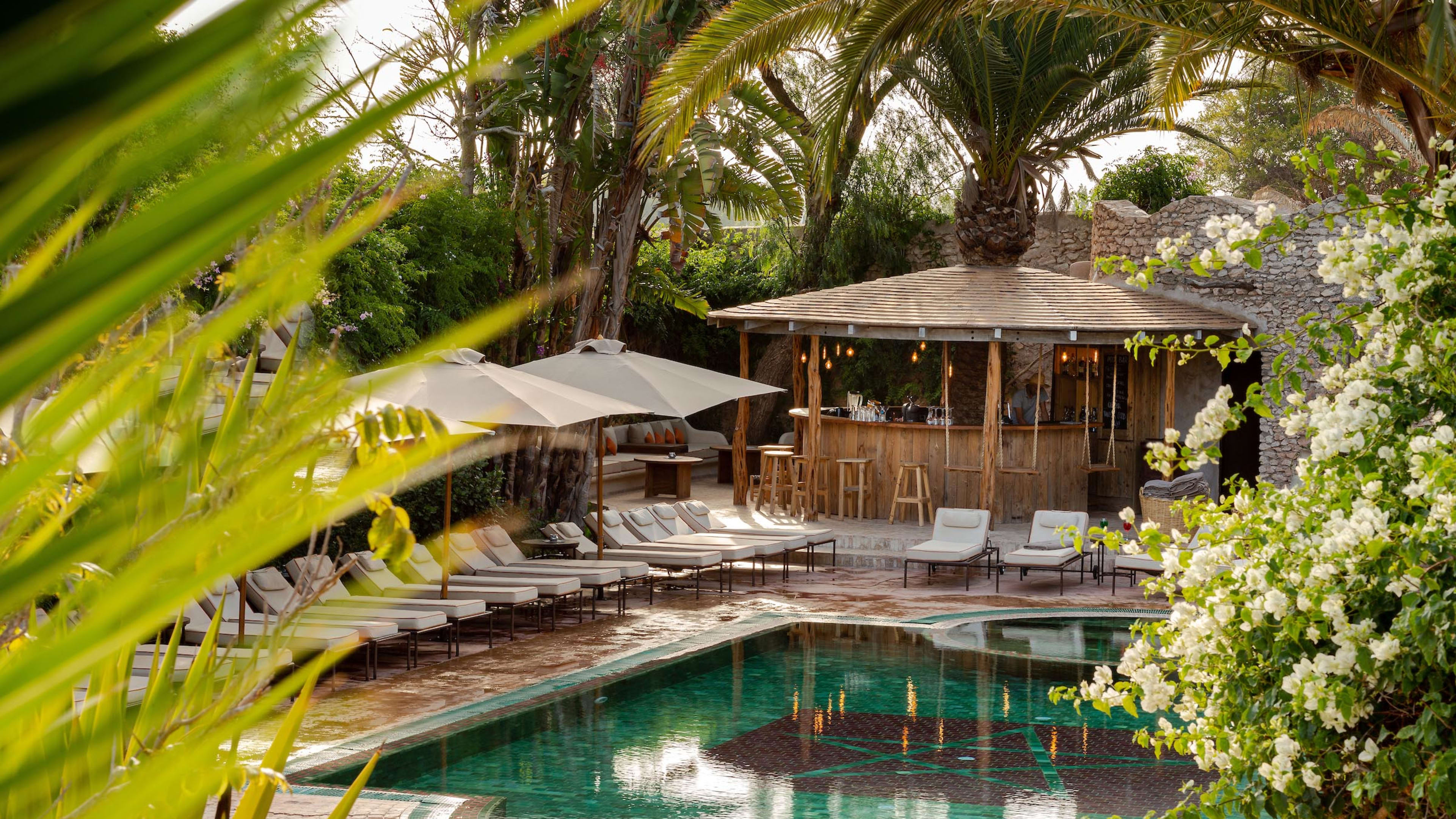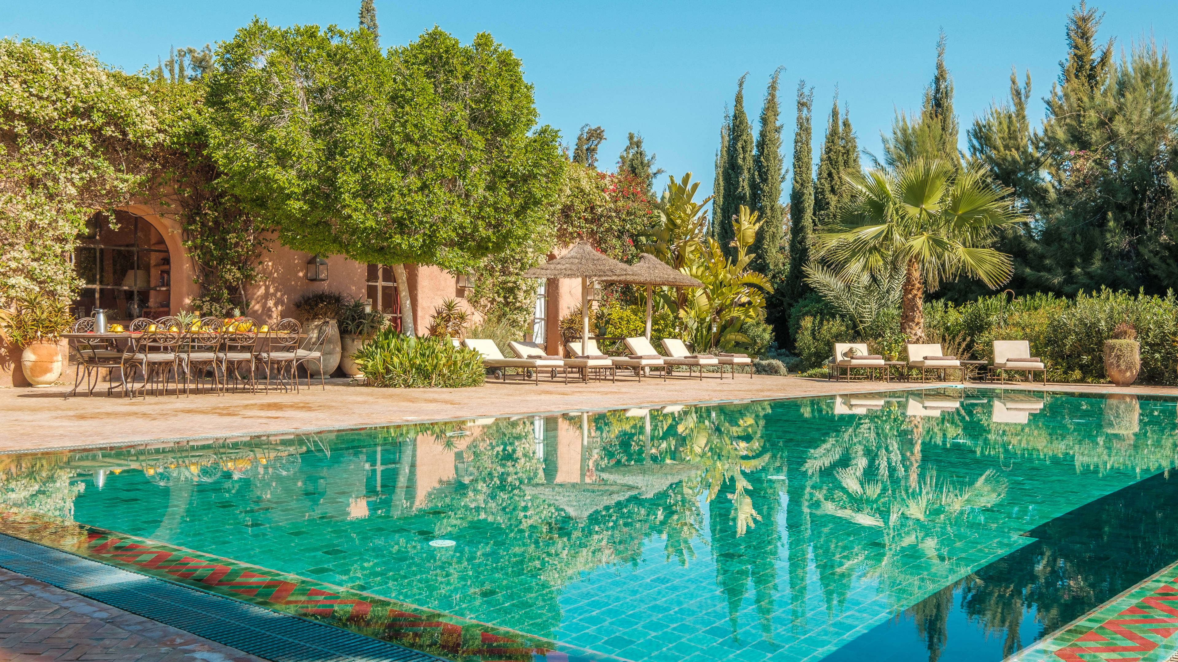 The adults-only infinity pool is a chic rectangular affair, tiled in blood-red and peacock-green zelige, surrounded by wrought iron day-bed and straw parasols. It’s heated from October to May and the perfect setting for some quiet sun-worshipping or purposeful laps. On the other side of the main house, the family-friendly pool is protected by a grove of olive and argan trees, with a shallow circular area perfect for babies, and some changing rooms nearby.