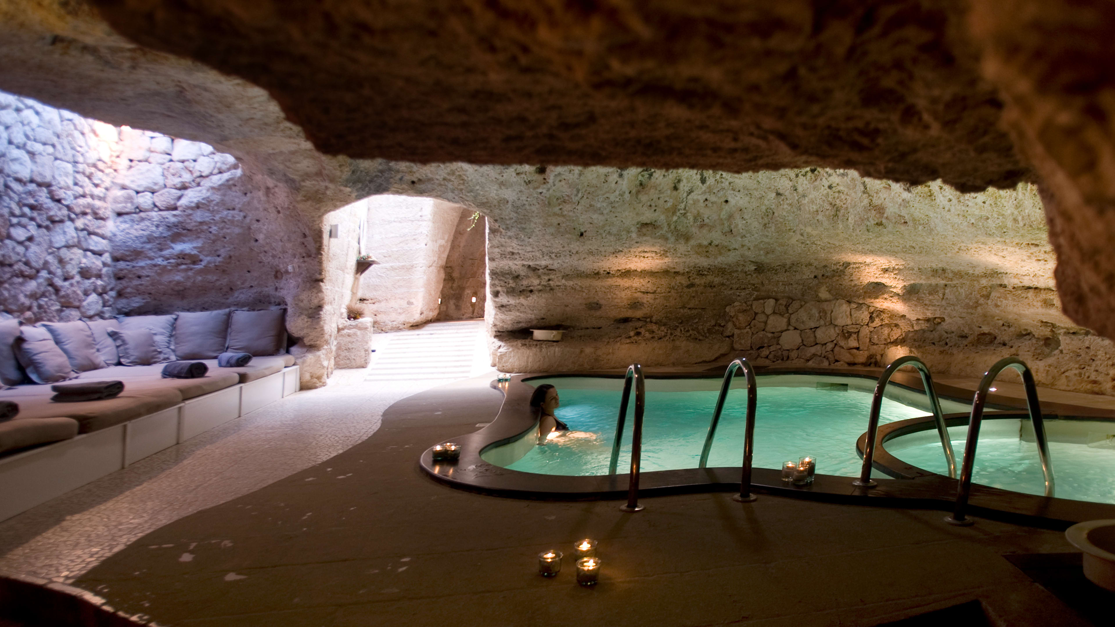 As calming as the hotel’s white-washed walls are, you’ll feel extra zen down in the natural caves of the Aveda spa. The hotel puts their own twist on traditional treatments by using natural products from the estate, such as their extra virgin olive oil for massages or olive leaves for detox scrubs. Back above ground, there’s a glass-fronted gym which overlooks groves of olive trees, plus a pilates and yoga tent in the ancient garden during the summer.