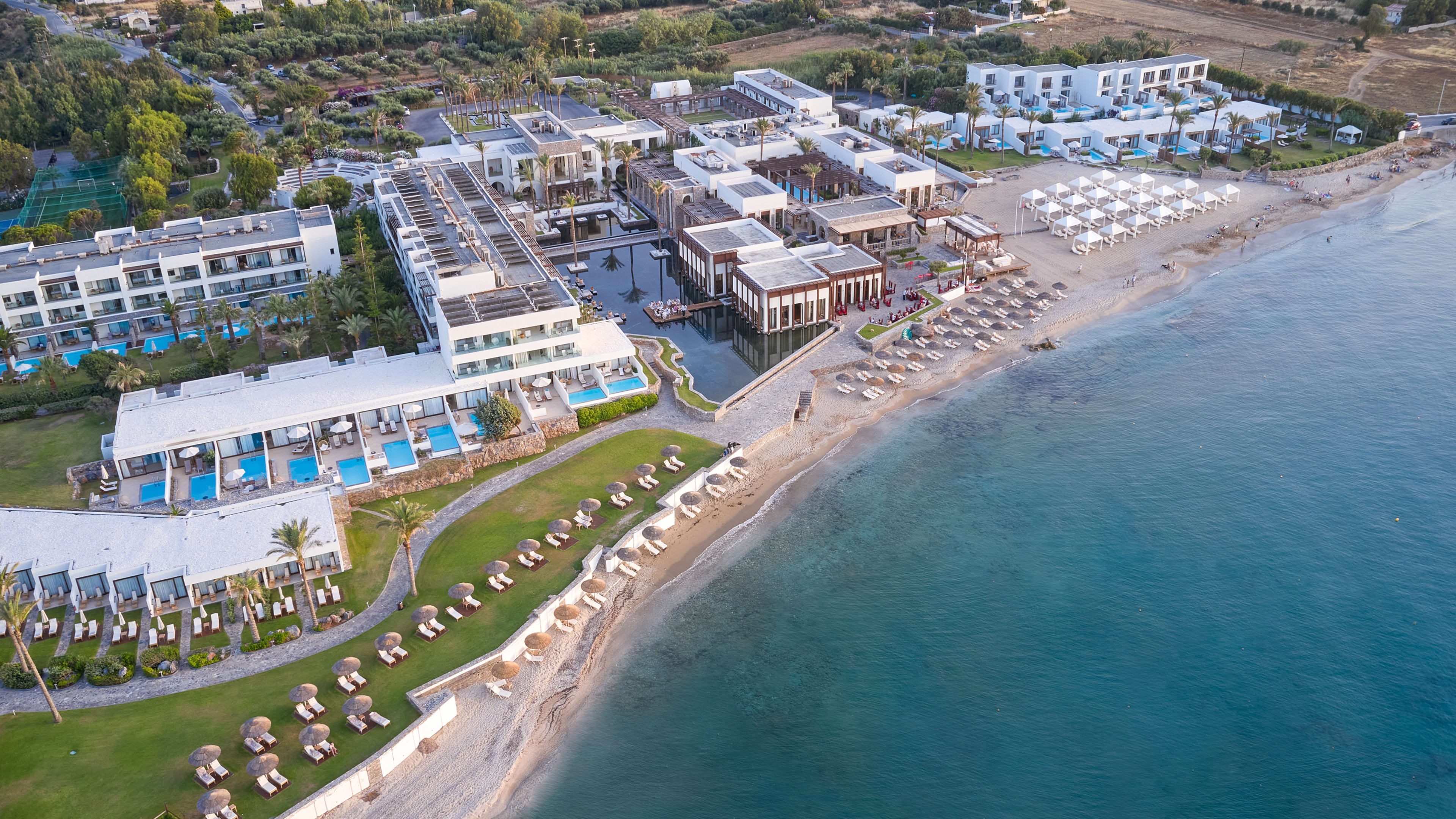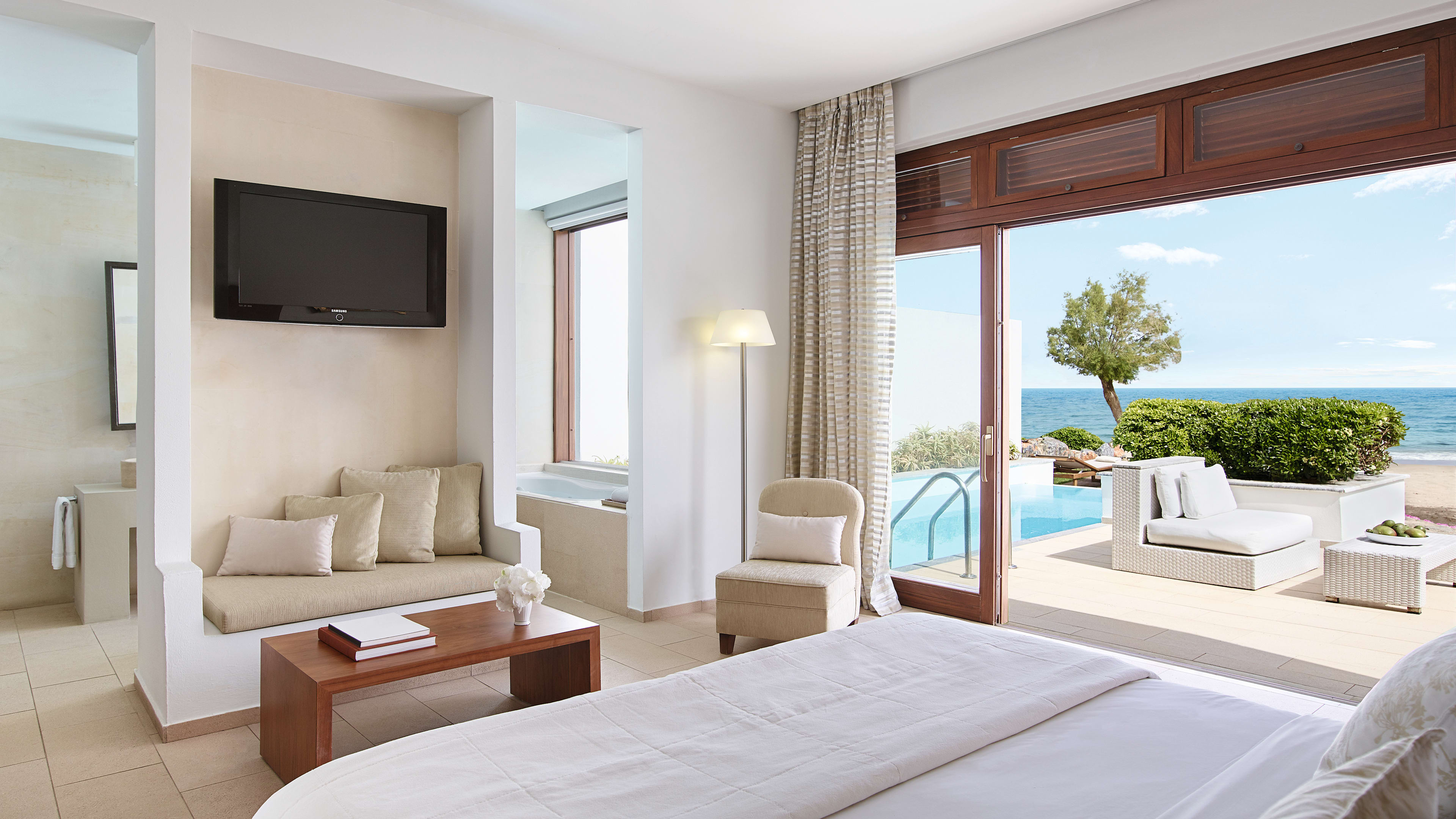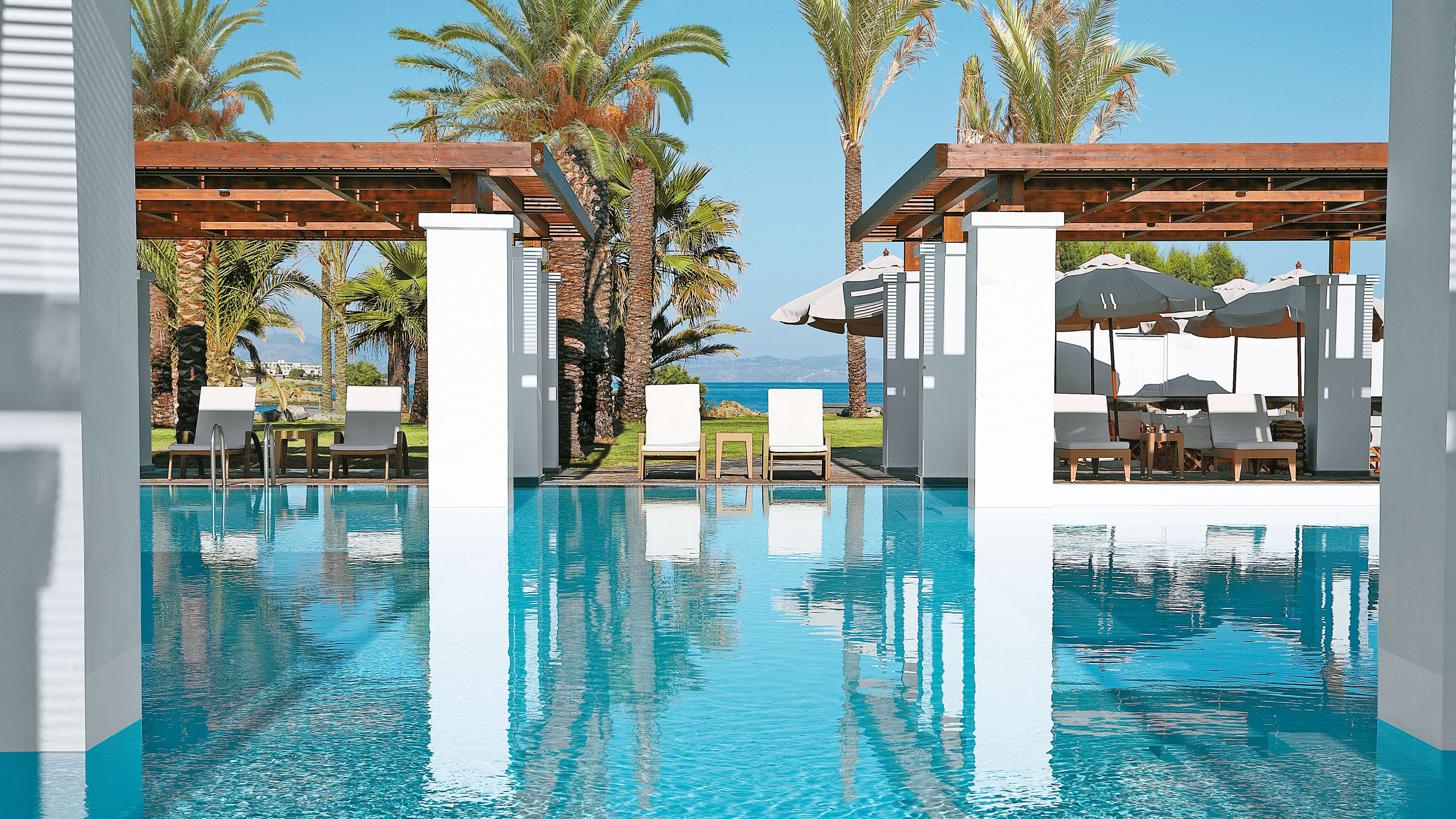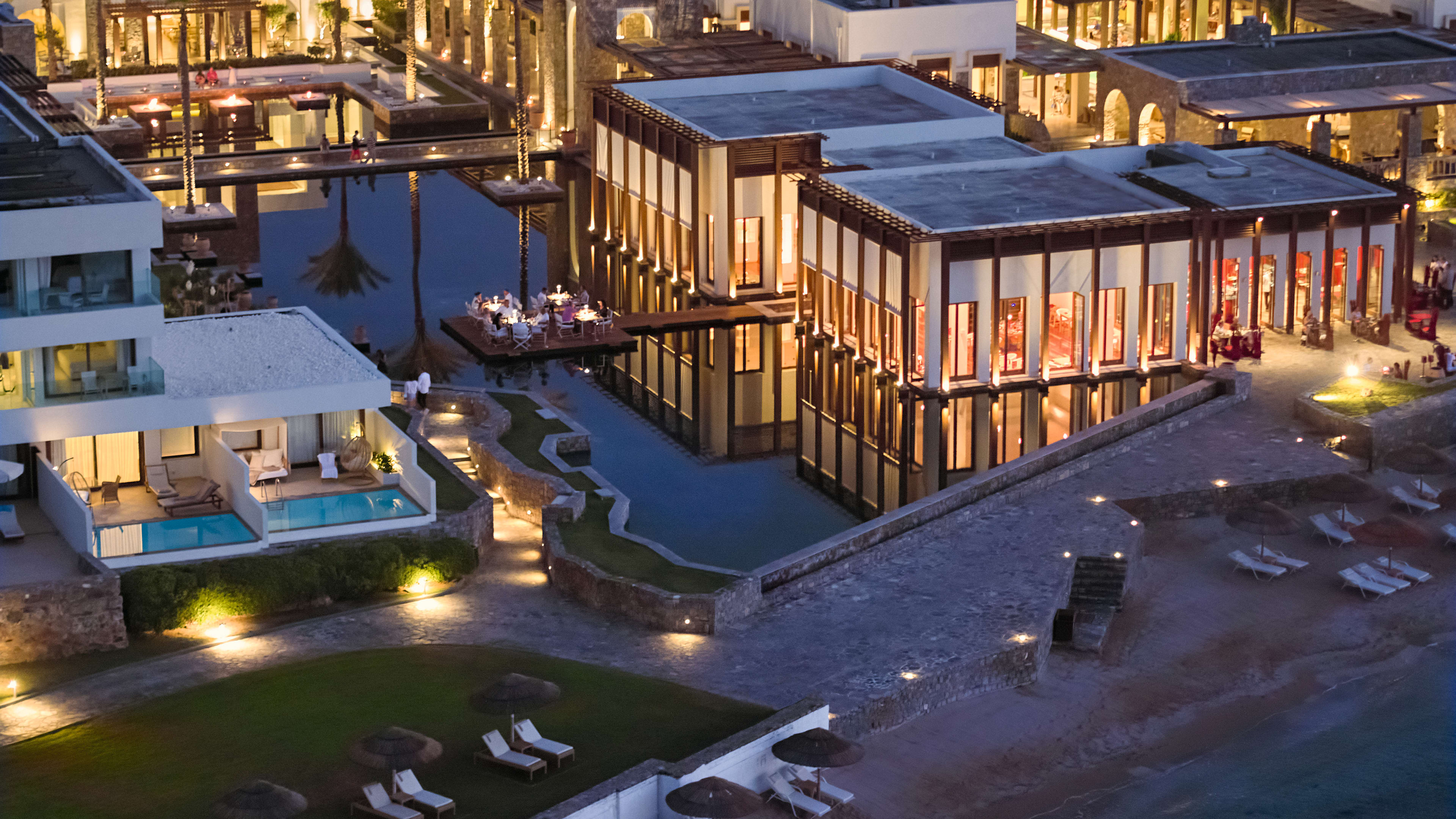 24-hour concierge, beach, spa, salon, gym, sauna and three swimming pools (including an Olympic-size one), seven restaurants, two bars, kids’ club, gardens with tennis courts, playground, golf club, boutique shops, free WiFi throughout, private car park with valet parking, DVD library. In rooms: flatscreen TV with built-in DVD player, CD player, minibar, fridge, tea- and coffee-making facilities, and Eau de Grece bath products. Villas also have a pillow menu, beach bag and a wine cooler.