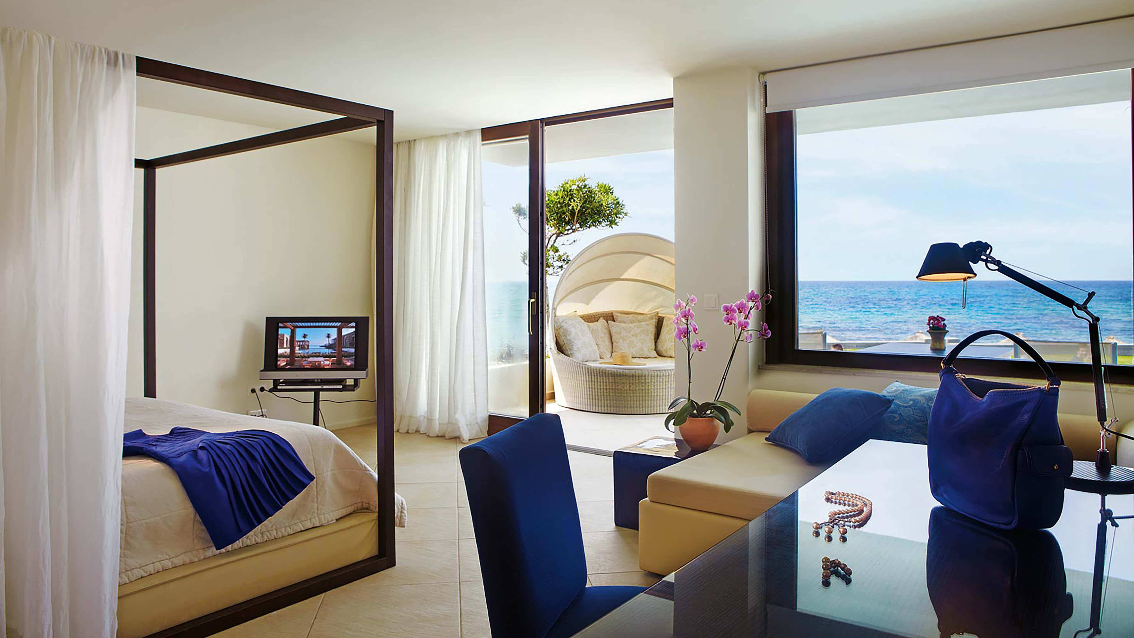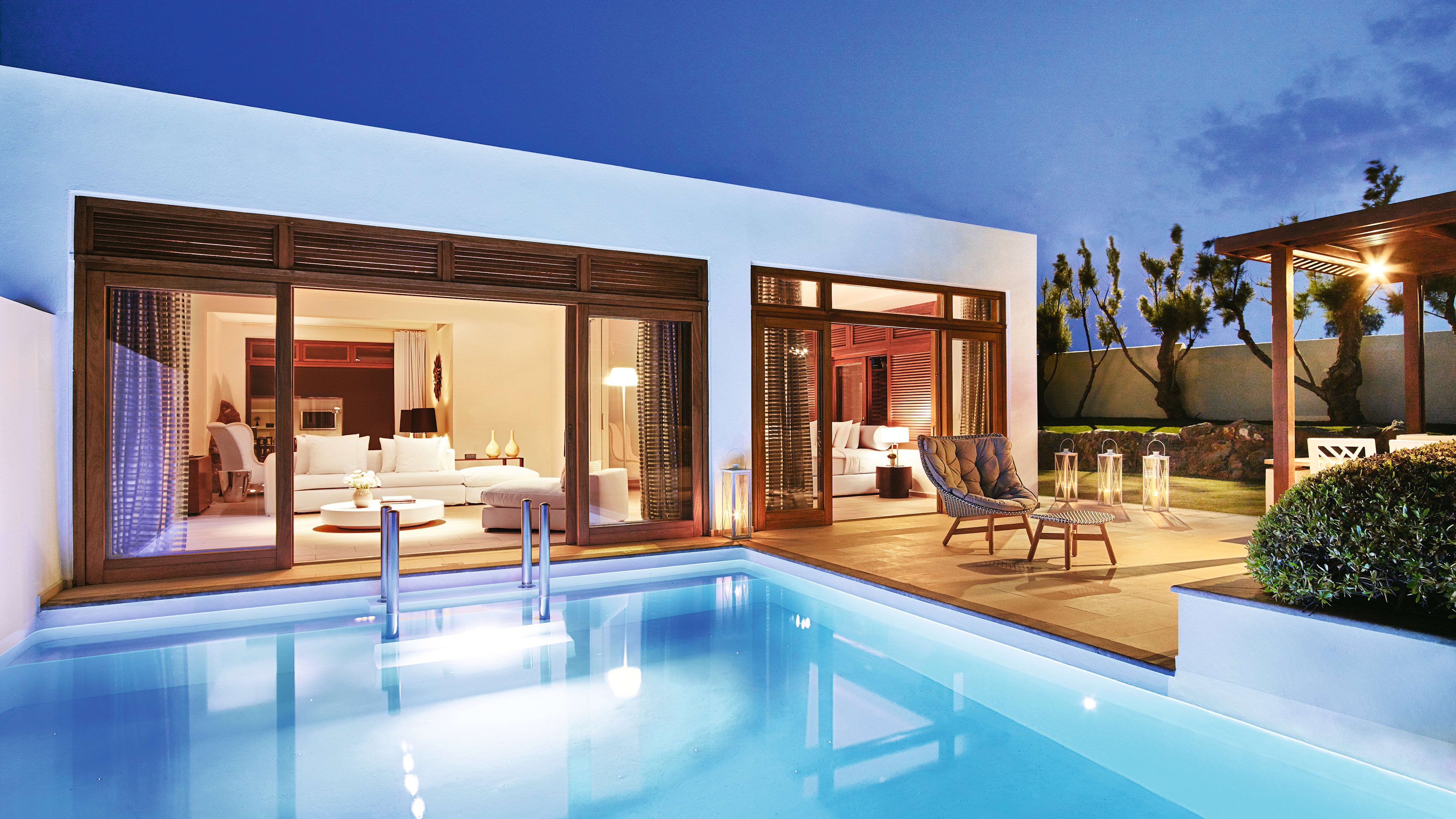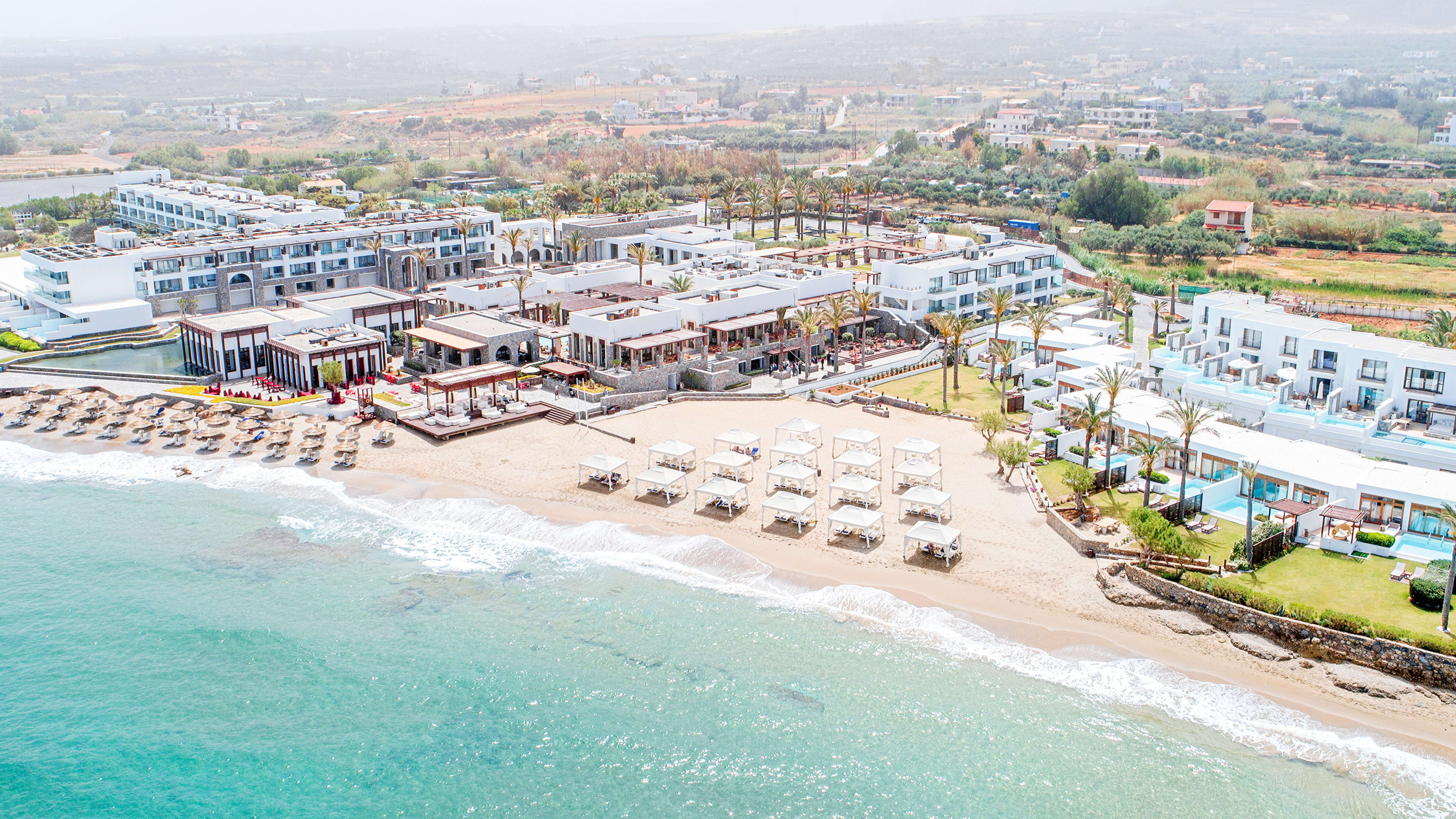 24-hour concierge, beach, spa, salon, gym, sauna and three swimming pools (including an Olympic-size one), seven restaurants, two bars, kids’ club, gardens with tennis courts, playground, golf club, boutique shops, free WiFi throughout, private car park with valet parking, DVD library. In rooms: flatscreen TV with built-in DVD player, CD player, minibar, fridge, tea- and coffee-making facilities, and Eau de Grece bath products. Villas also have a pillow menu, beach bag and a wine cooler.