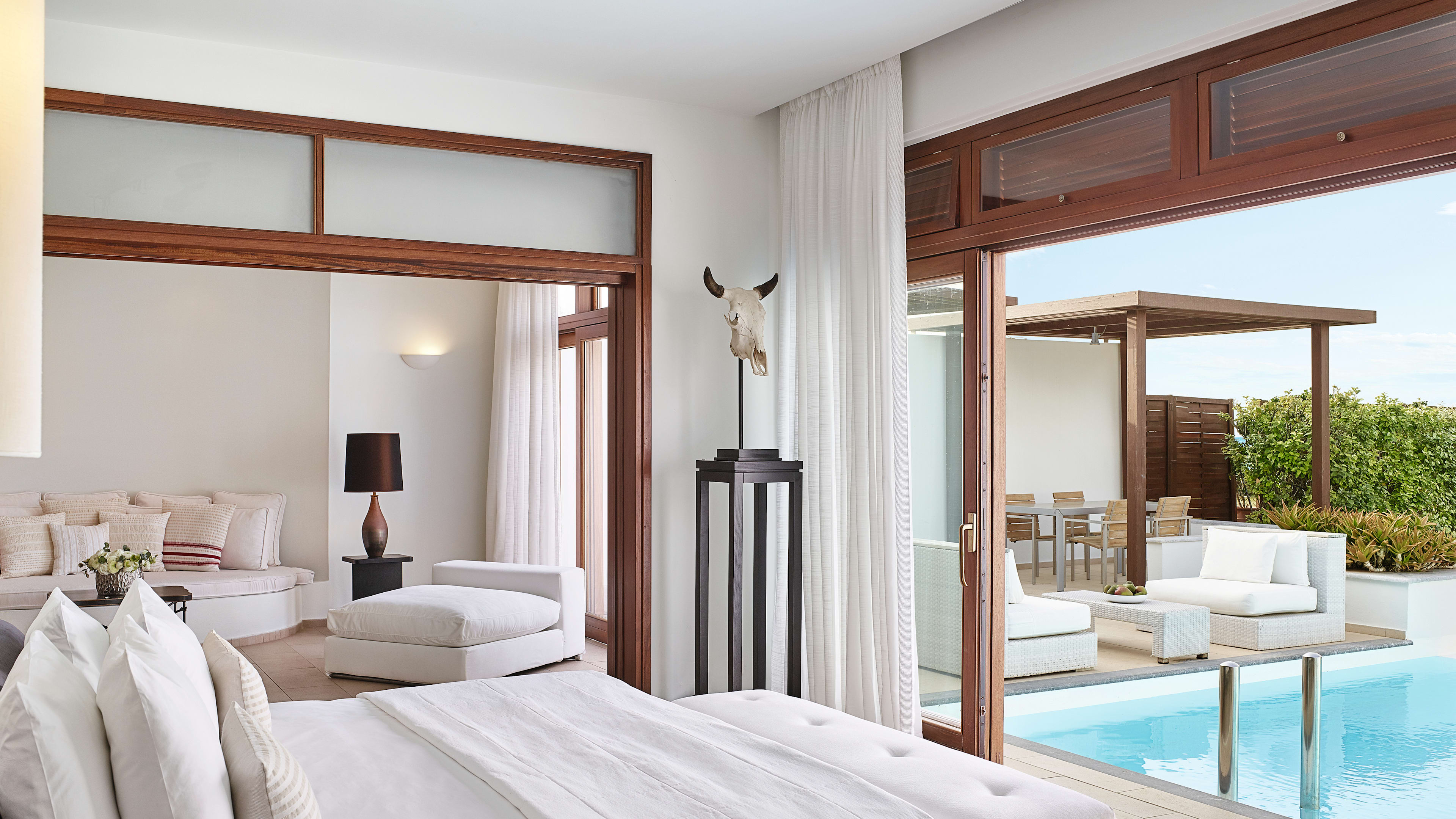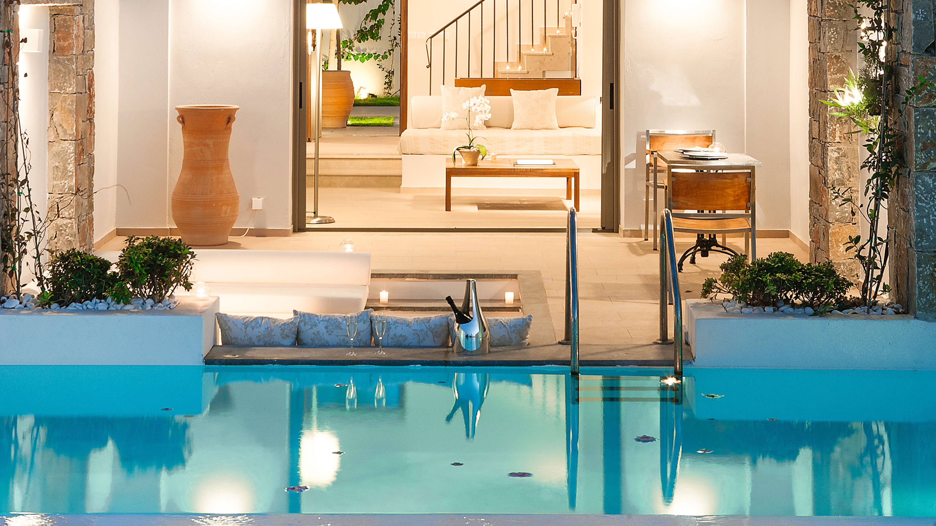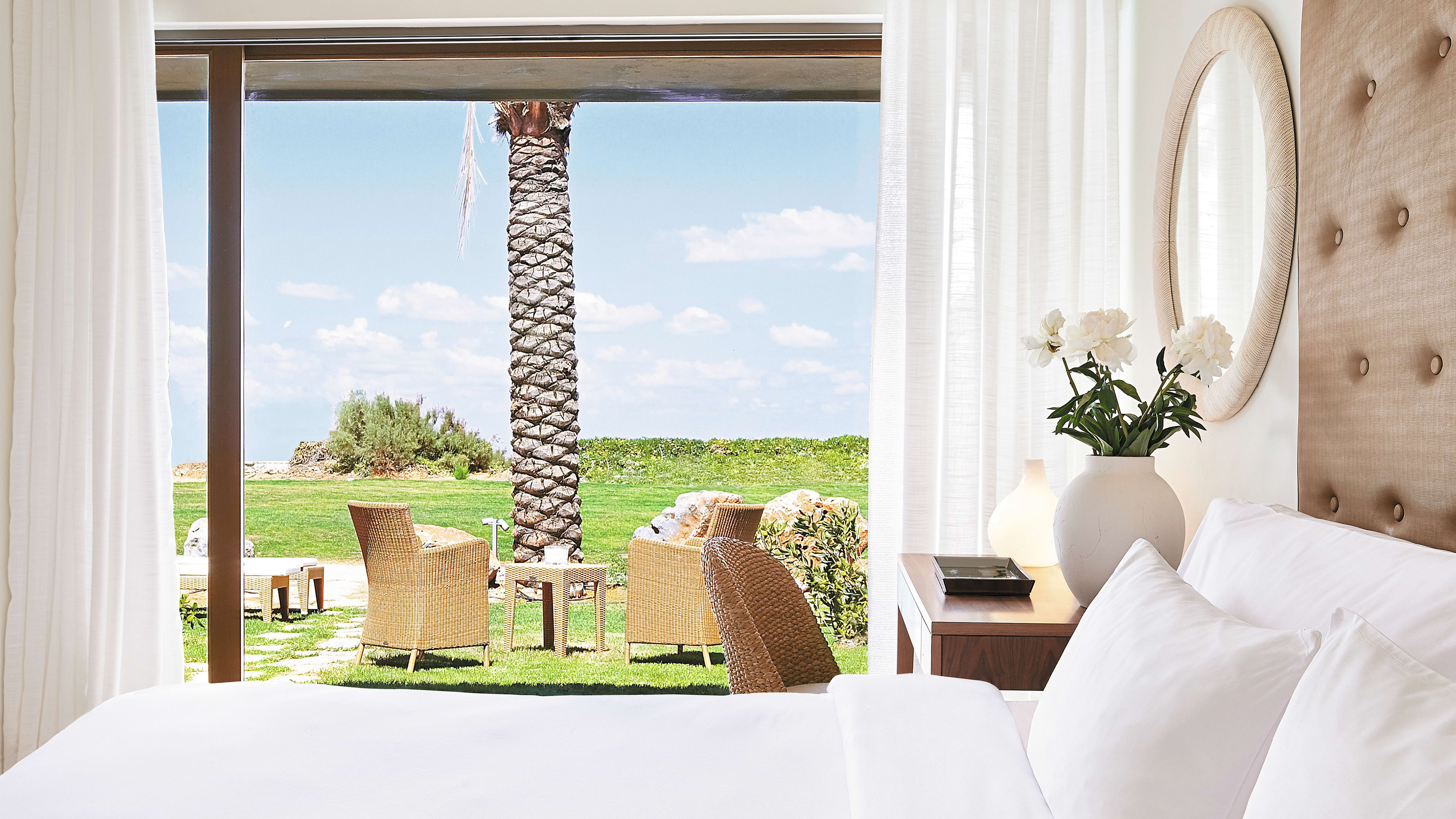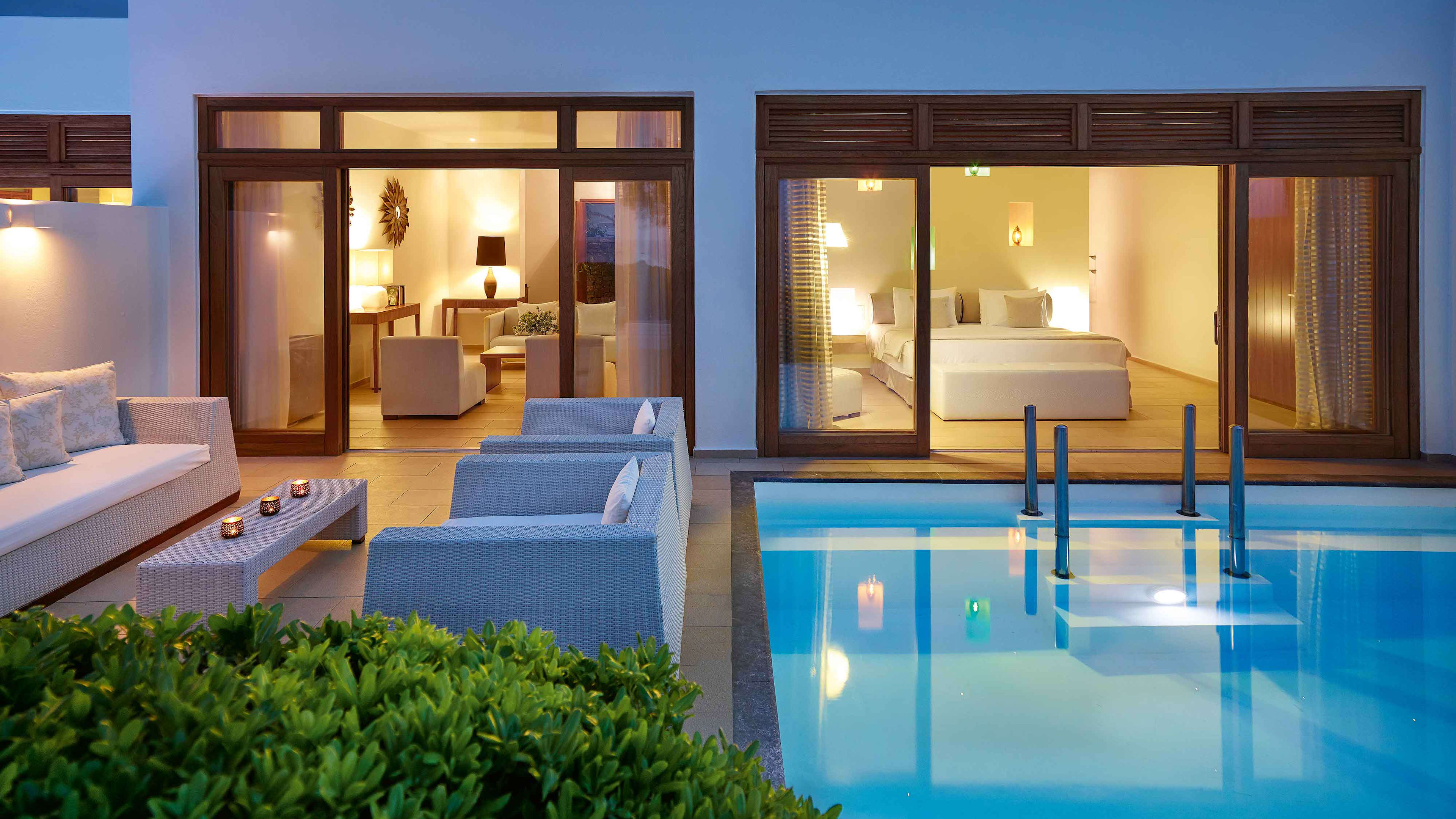 24-hour concierge, beach, spa, salon, gym, sauna and three swimming pools (including an Olympic-size one), seven restaurants, two bars, kids’ club, gardens with tennis courts, playground, golf club, boutique shops, free WiFi throughout, private car park with valet parking, DVD library. In rooms: flatscreen TV with built-in DVD player, CD player, minibar, fridge, tea- and coffee-making facilities, and Eau de Grece bath products. Villas also have a pillow menu, beach bag and a wine cooler.
