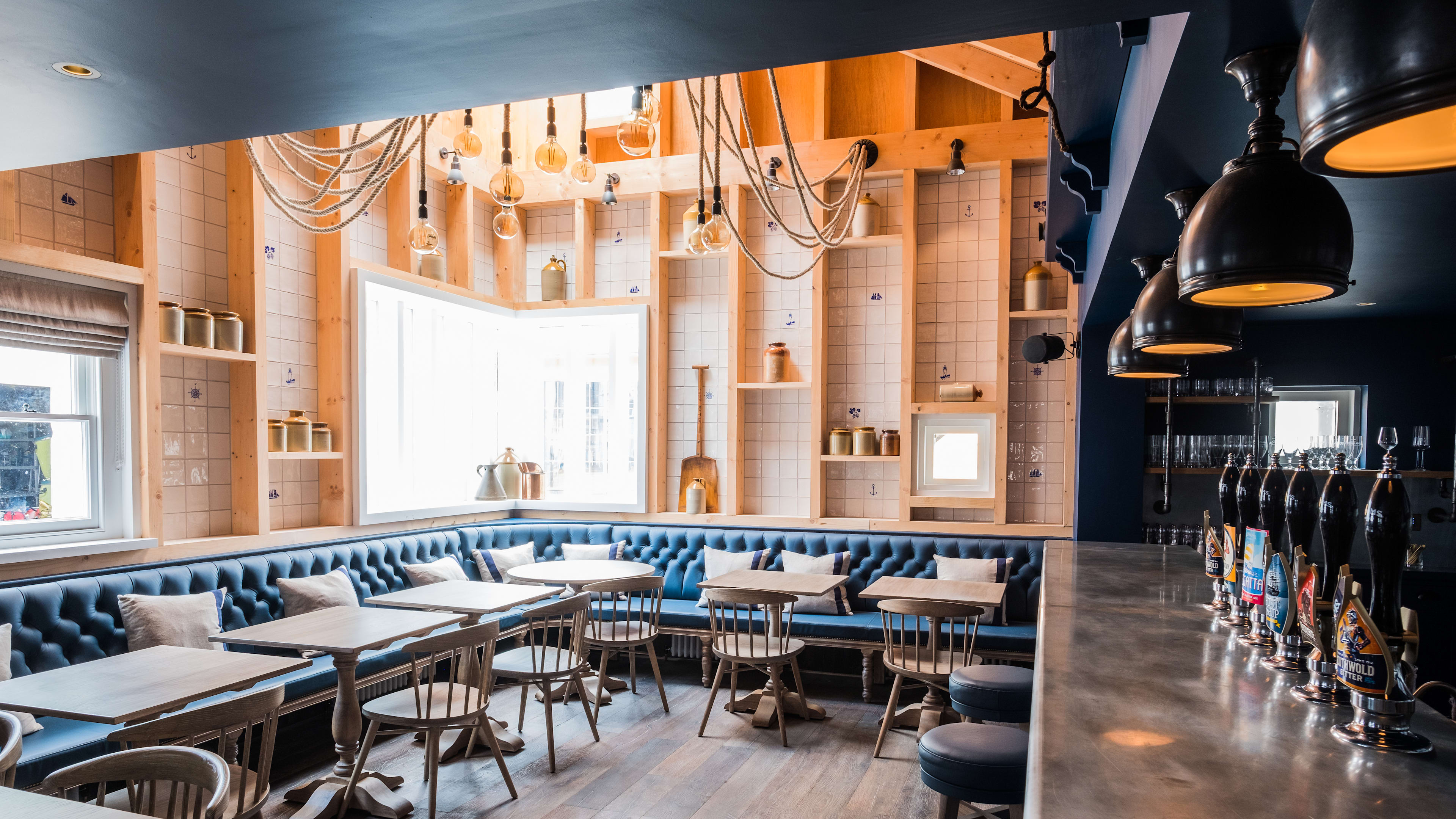 With brewing and distilling happening right on the doorstep, we think it’s fair to say that the Tap Room is the hotel’s heart – in spirit at least. The bar is the most maritime-influenced room in the hotel, complete with dark blue banquettes, bulbs hanging from thick ropes and white tiles emblazoned with nautical symbols. Things are just as impressive behind the bar, too, with 12 gleaming taps dispensing Adnams beer and all of the distillery’s offerings arranged across the shelves. The food is less formal here but cooked with just as much love; try the battered monkfish with triple-cooked chips or the ribeye steak, best paired with the Argentine Malbec.