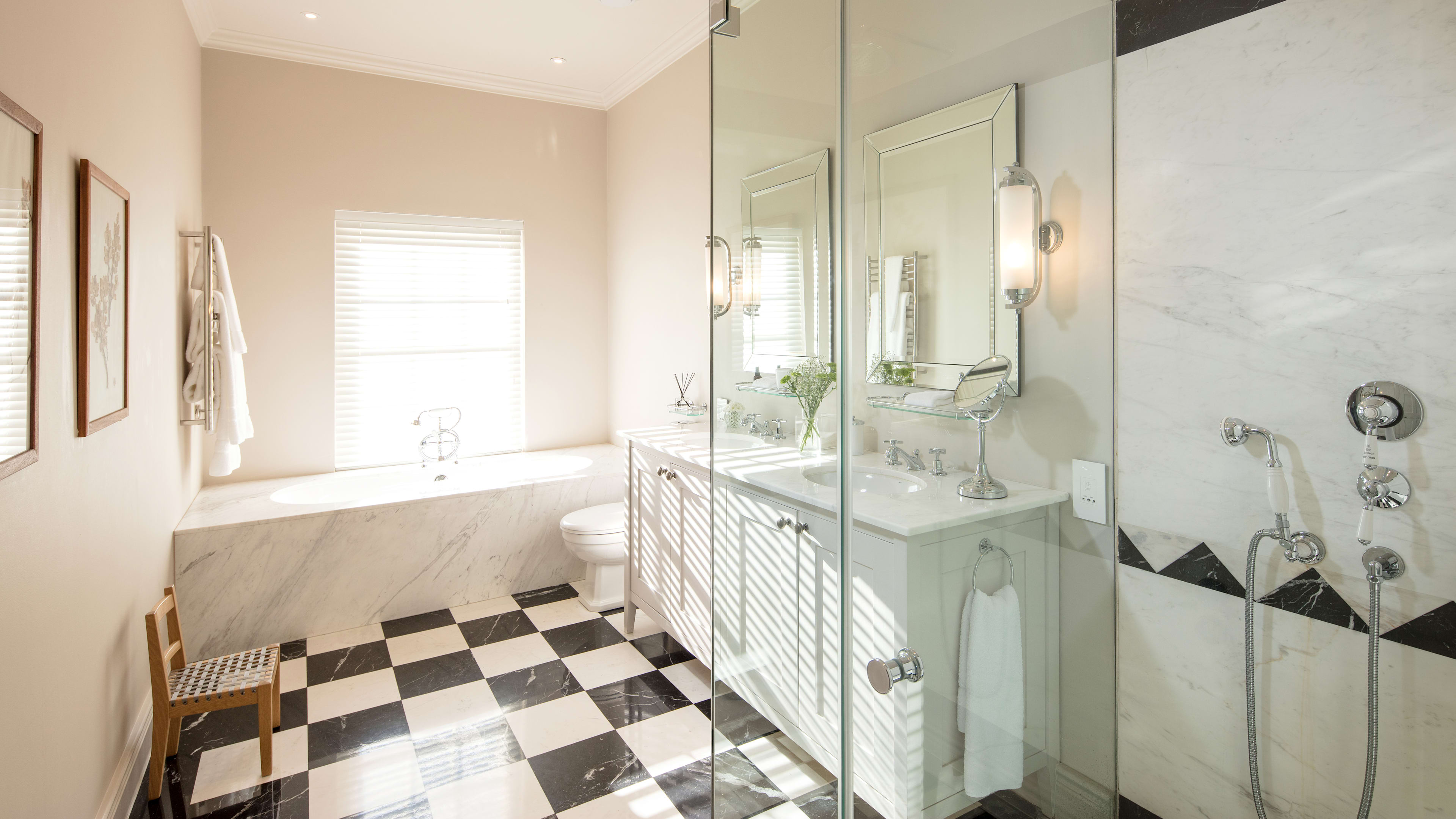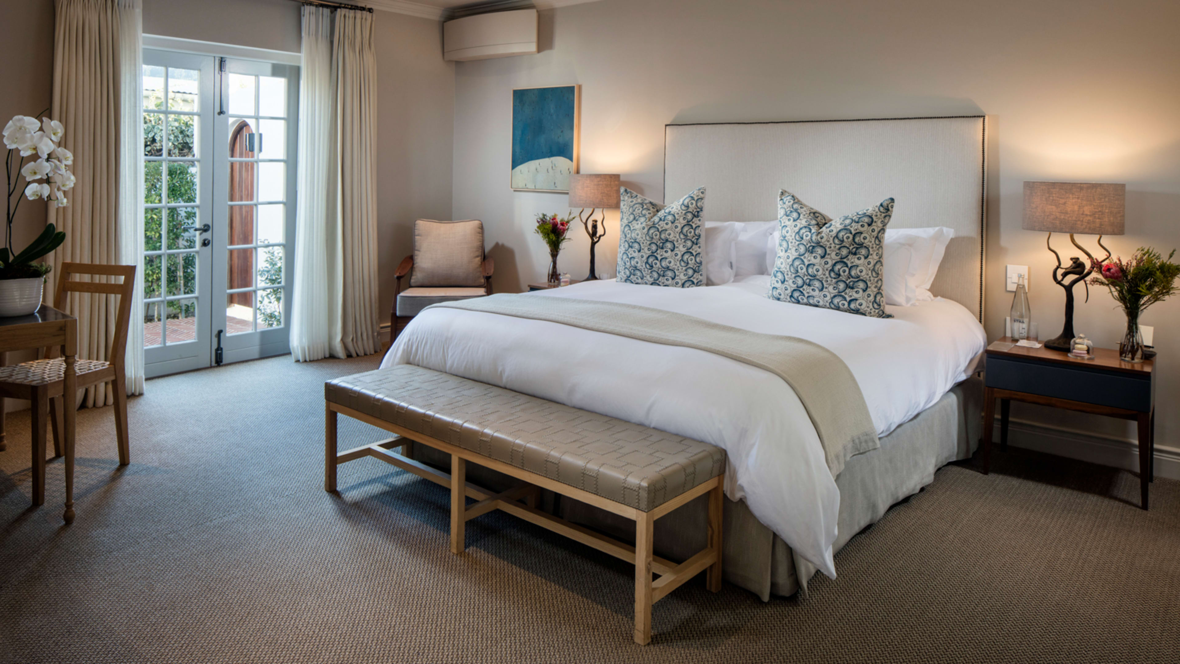 There’s a quiet luxury to rooms here: carpets are sisal, shades are kept to the soothing end of the colour spectrum, furnishings have a polished mid-century feel, linens have upped thread counts, and bathroom floors are heated. Those with private terraces are covetable, and if you crave a mountain view a couple of hideaways on the upper floor have a view over Franschhoek’s mighty peaks.