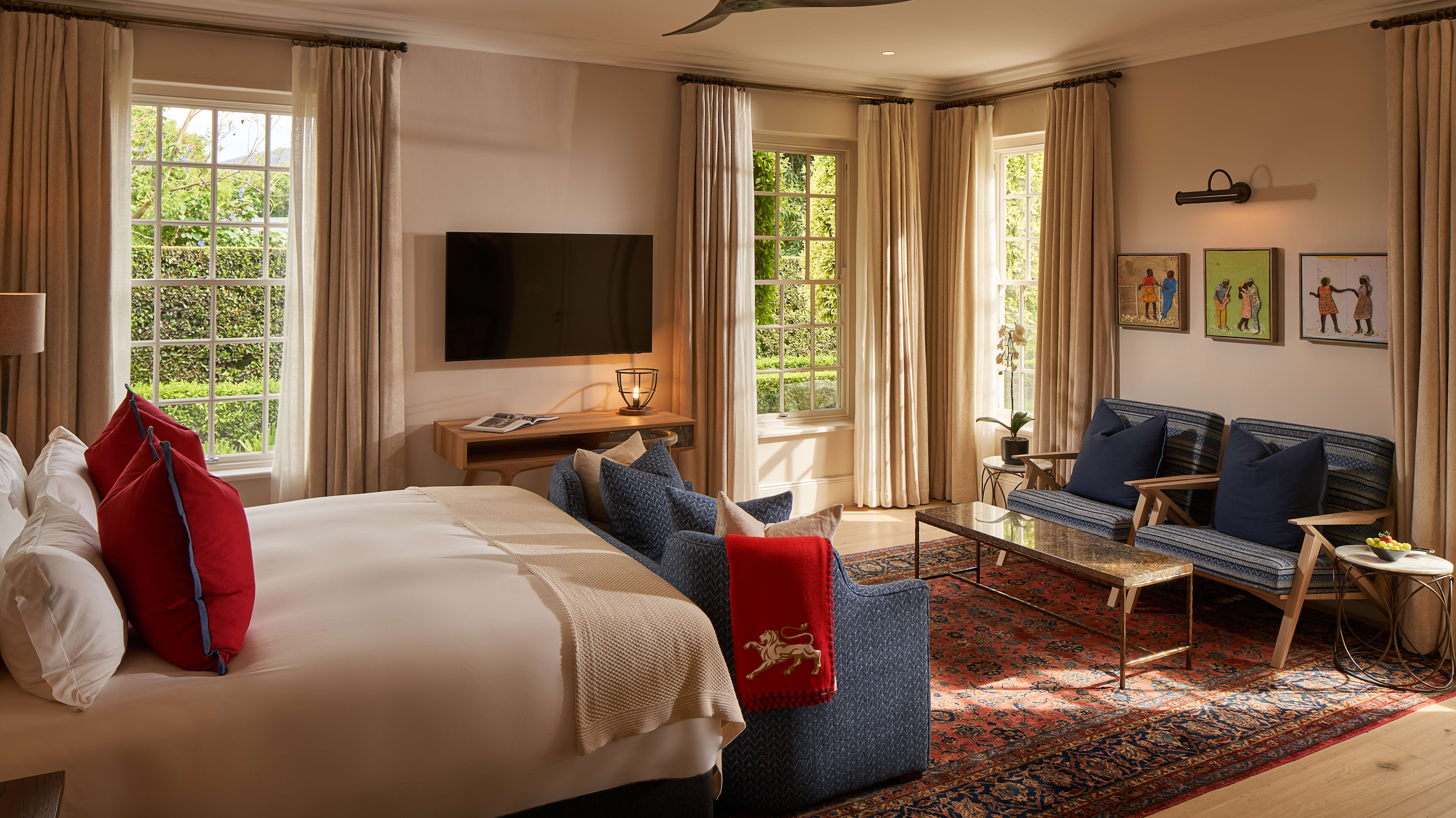 A stay at Leeu House might feel like you’ve sojourned to the country, such are its mountain views and sense of space (it’s actually three properties, purchased by owner Analjit Singh to allow for a pool, gardens and one hell of a view), but you’re actually on Huguenot Street, one of Franschhoek village’s main drags, putting you within walking distance of its top-drawer dining, indie boutiques and – most importantly – the launching point for the Wine Tram. From here there are eight hop-on, hop-off routes to choose from, chugging along to noted wineries such as Grande Provence (for oyster, hummus or nougat pairings), Mont Rochelle (for syrahs and cab savs), Franschhoek Cellar (for wines, chocolates and cheeses) and Rickety Bridge (for panna cotta pairings and a non-alcoholic flight). But, we must insist on a stop at Pigcasso, where you’ll not only get to sample fine wines, but also meet a very fine swine with excellent artistic abilities, and maybe see her in action. It might be a good idea to line your stomach a little pre-tram, so take the ‘chocolate experience’ at Huguenot Fine Chocolates close by, nibble and sip your way around Franschhoek Village Market (picking up handicrafts as you go), or stop by the beautiful Babylonstoren farm and shop to pick up picnic fixings, wander the intricately laid out gardens, and meet the resident animals (oh and, go on, have some wine while you’re at it). The Huguenot Memorial Museum outlines Franschhoeak’s fascinating history and the influence the French refugees had on the region. And to exercise your ‘nose’ in another fashion, sniff out the First South African Perfume Museum – follow up by having a custom scent made at Kumanov Perfumery. And, after all that imbibing, a hike in the glorious Mont Rochelle Nature Reserve or a spin on a bike from Franschhoek cycles will sort out any sore heads.