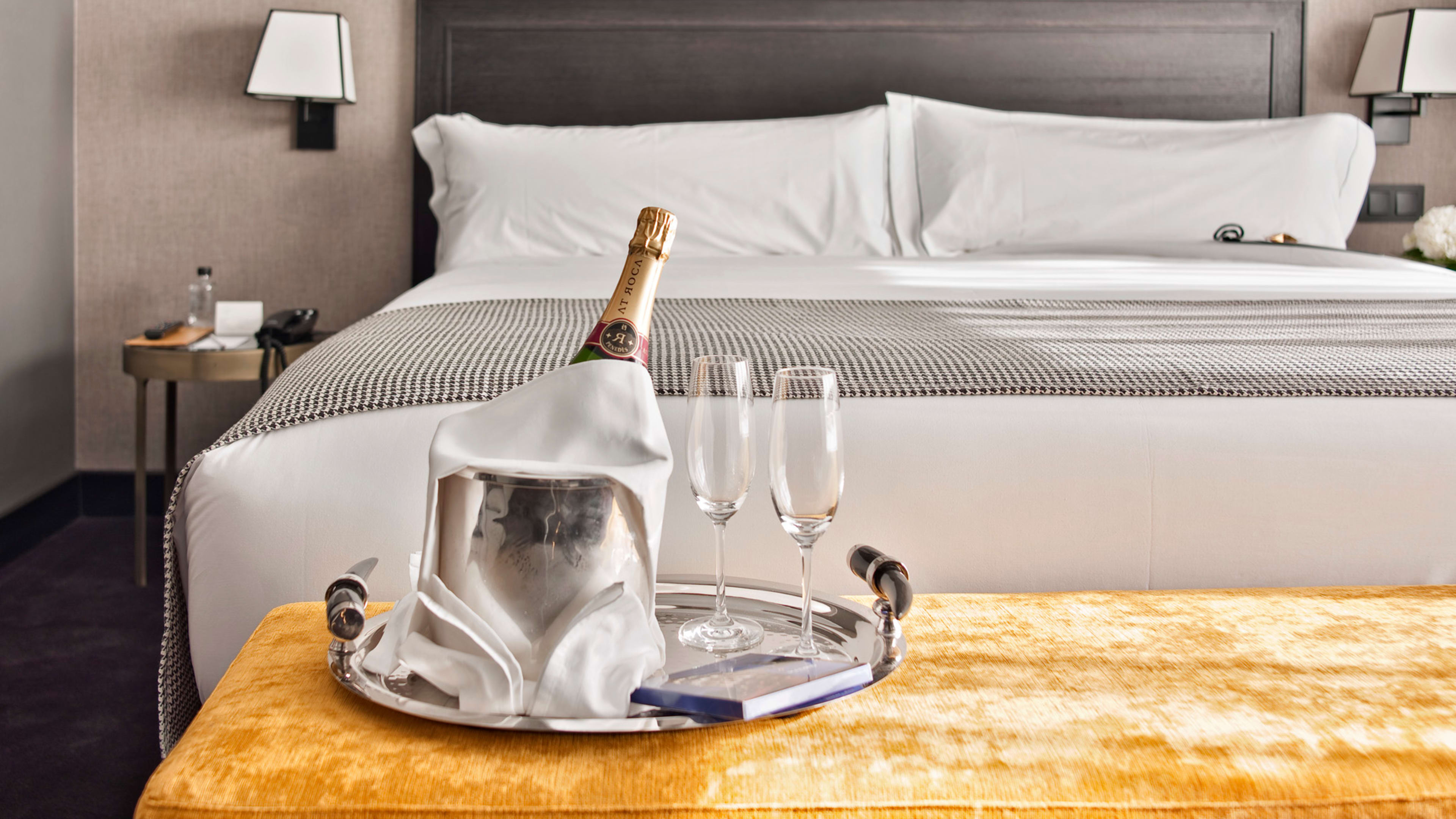 Classic sandwiches, Spanish staples (tortilla, manchego and ham) and comfort dishes such as carpaccio, lasagna and goat-cheese pizza can be ordered in-room around the clock.