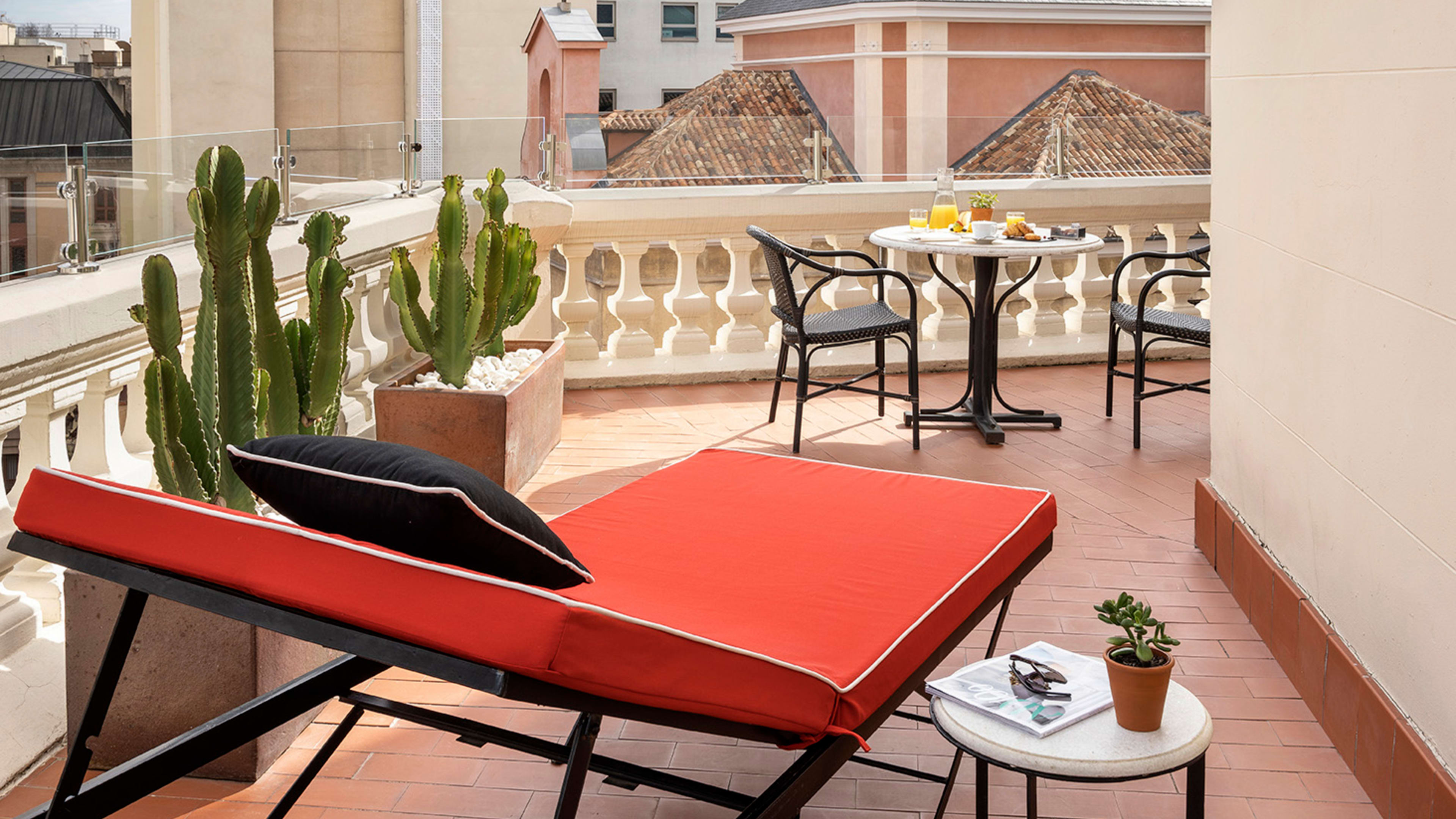 With outdoor showers and 20 scarlet sunloungers fanned out around a babbling fountain, the seventh-floor solarium is a view-blessed spot to soak up the rays.
