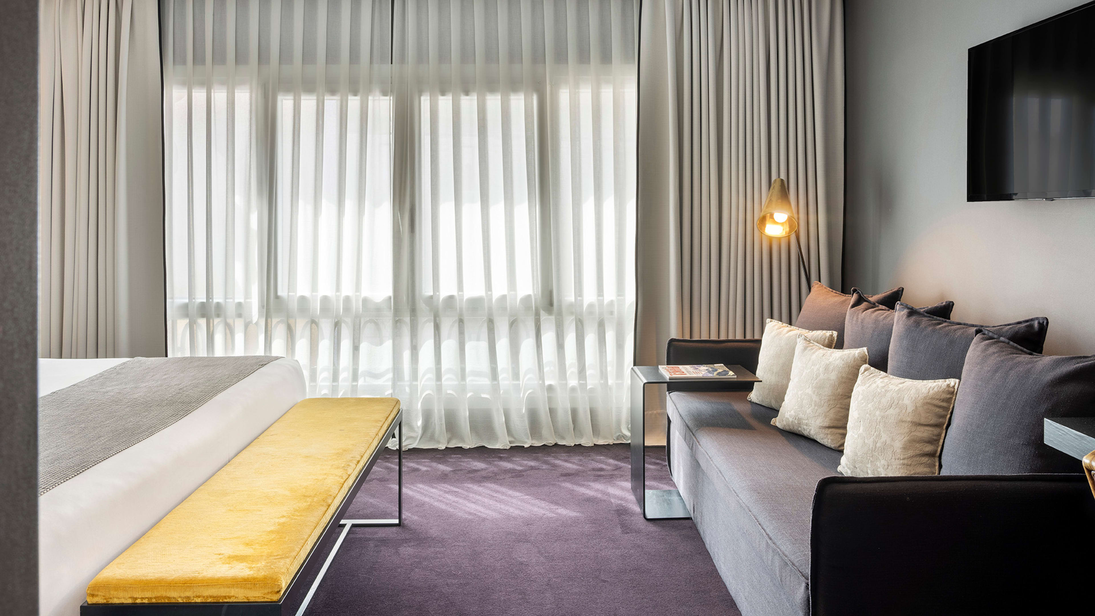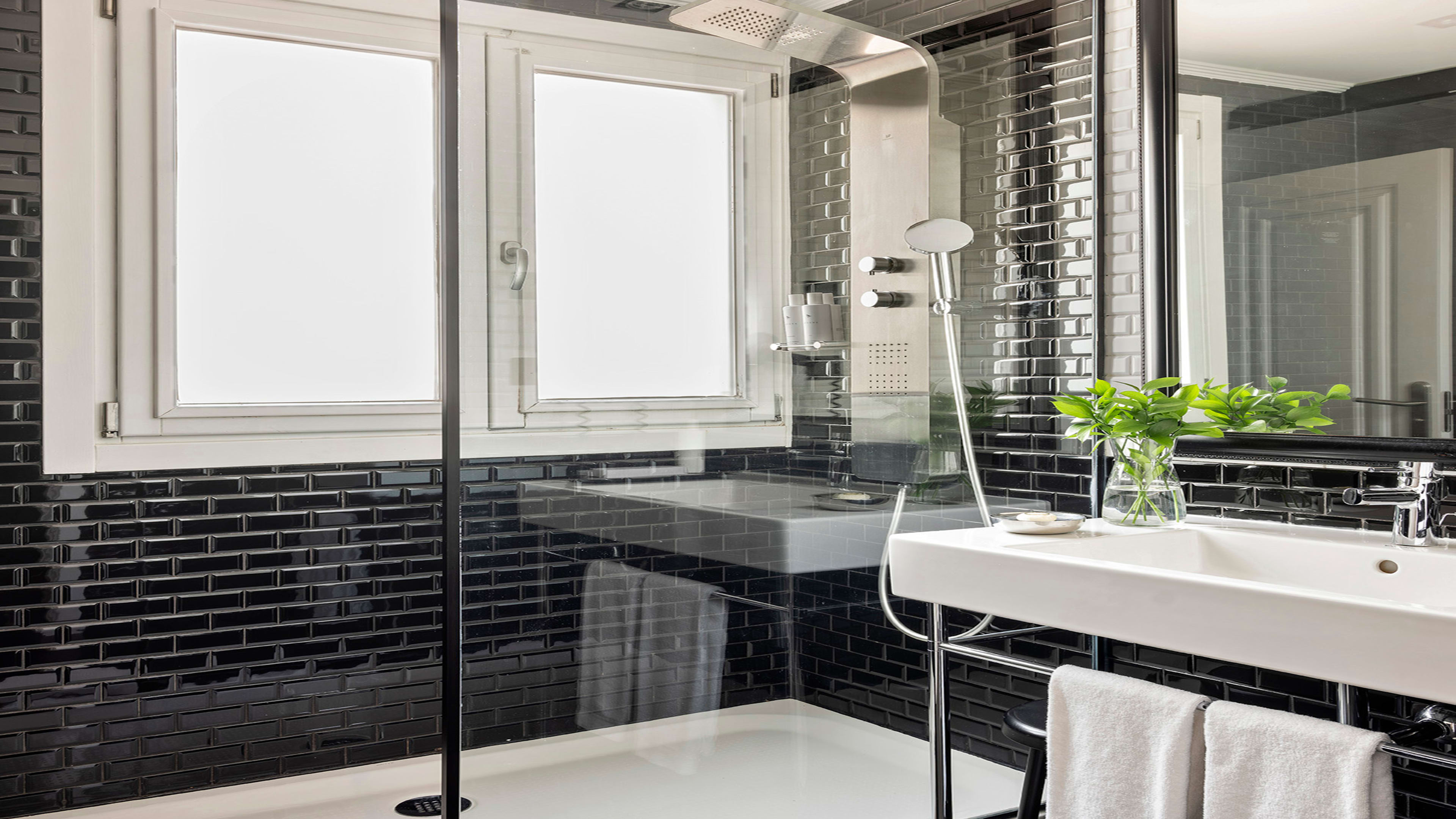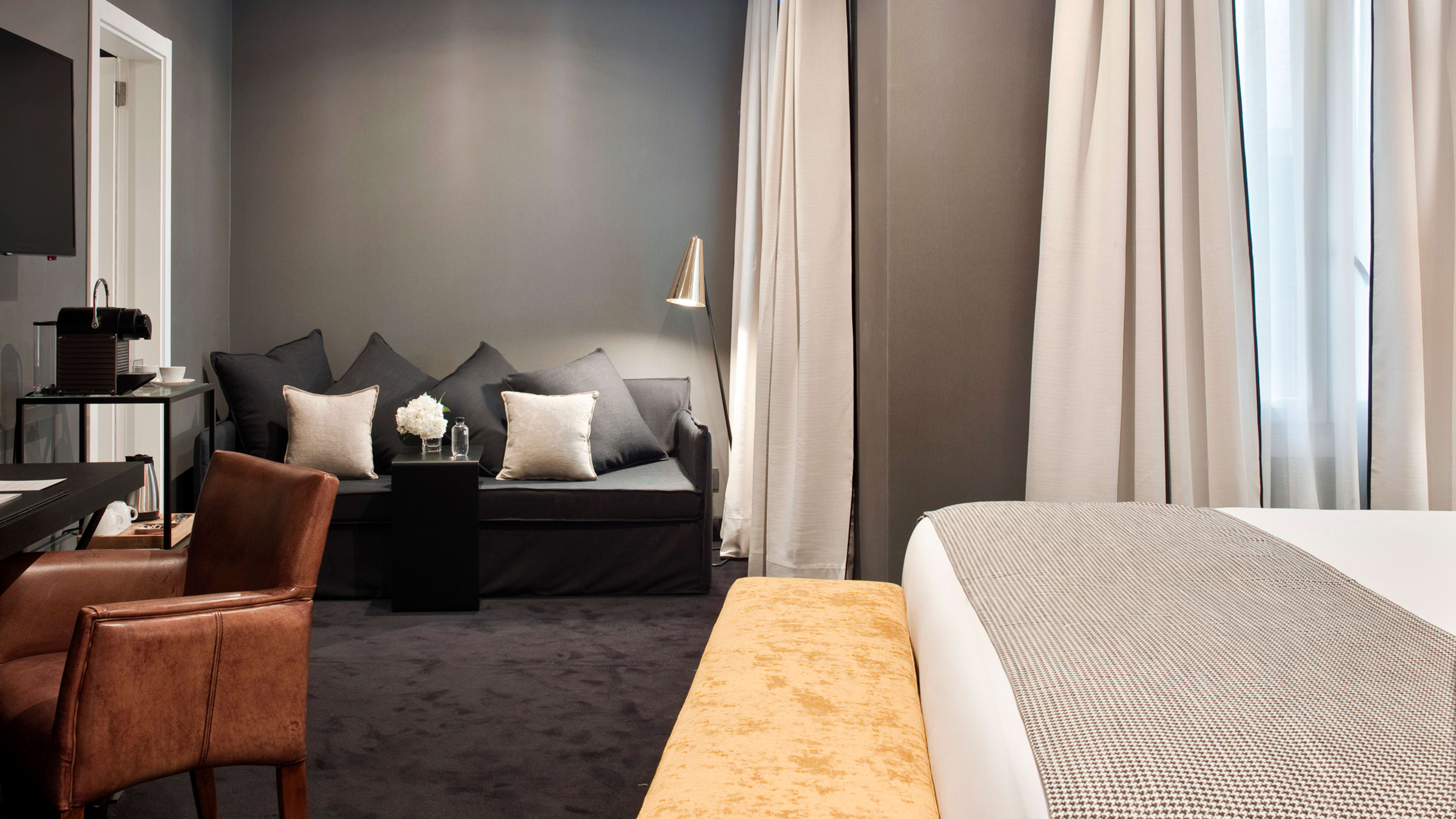 Decorated in a monochrome palette, rooms have a sophisticated, masculine edge, with glossy black-tiled bathrooms, brass accents and leather lounging chairs. Room 423 may be the smallest in the house, but it has a spacious bathroom. Deluxe Room 601 has sweeping city views. If you’re staying a while, book a suite on the fifth floor: they have inviting reading nooks and showers equipped with massage jets.