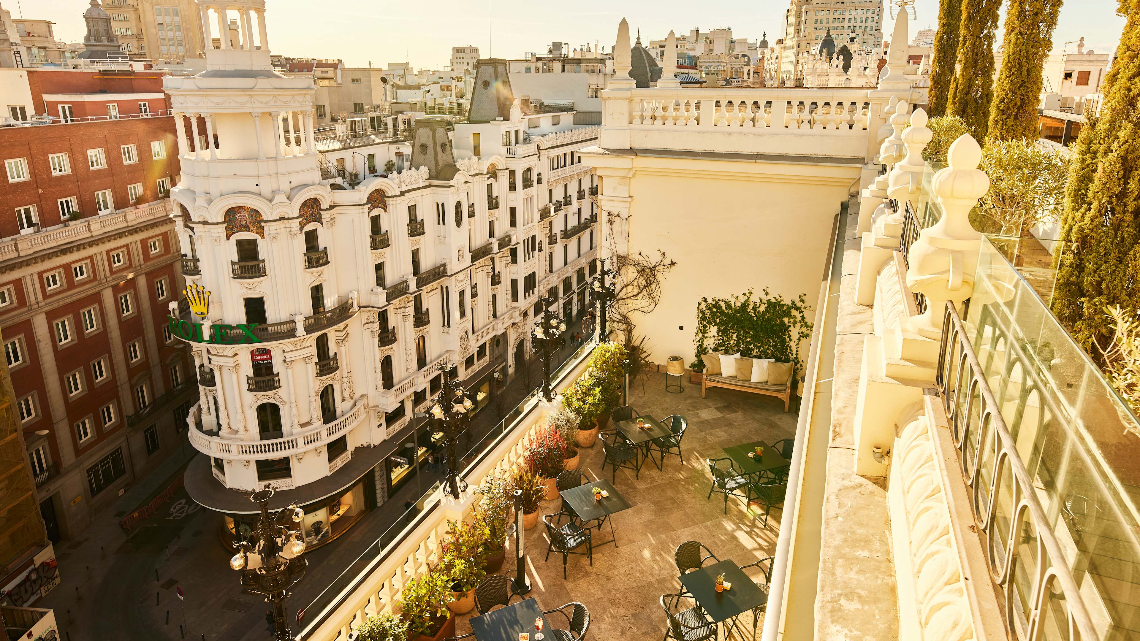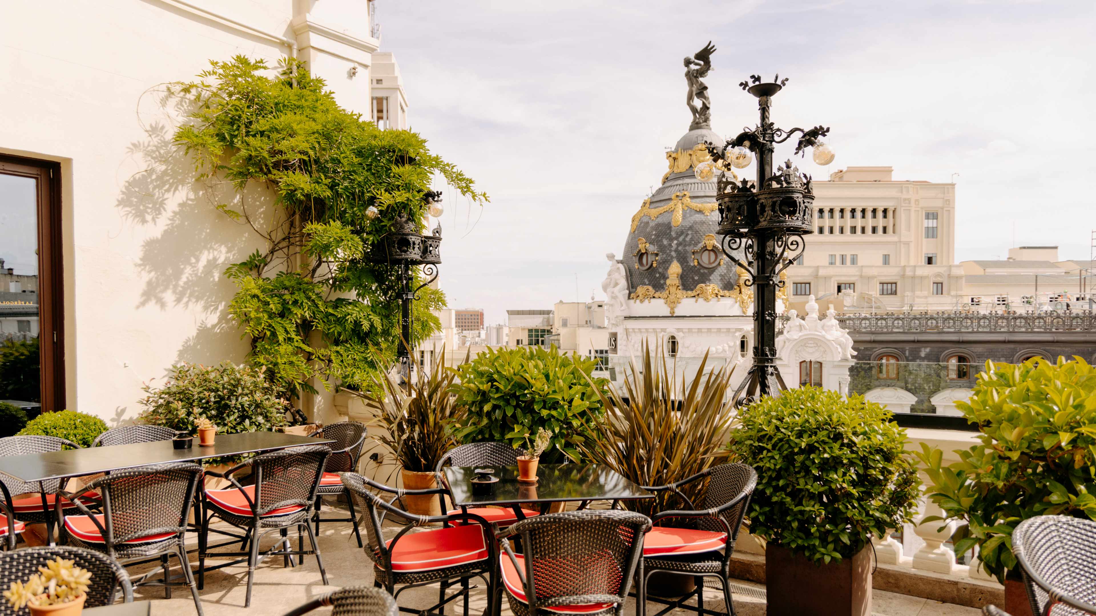 A bright, elegant stretch of marble floor and rich velvet seating, Ático looks out over the city from its sixth-floor perch. With two Michelin stars to his name, chef Ramón Freixa knows a thing or two about modern Spanish cuisine. Split between finger food and unpretentious mains, the menu is a testament to his culinary skill and love of Iberian produce: book ahead for a chance to sample fig-and-foie-gras éclairs, monkfish tacos and moreish croquettes. For tapas-like snacks, desserts and cocktails, ascend to La Pérgola, a window-walled space on the sixth floor. Rattan furniture, hanging greenery and a thatch-covered ceiling lend the room an organic finish, and every table overlooks the gilded tower of the Metropolis building.