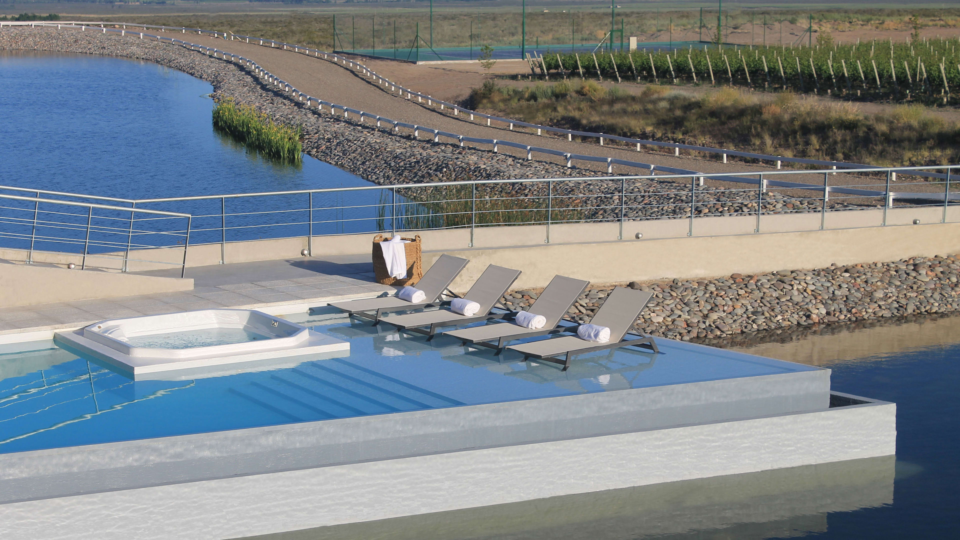 The unheated outdoor pool looms over the lagoon on a concrete platform. The hotel sits along one side and sunloungers are scattered about, but swim to the infinity edge and you’re immersed in timeless Mendocenean terroir. It’s large enough for lazy laps, and a Jacuzzi bubbles away to one side.