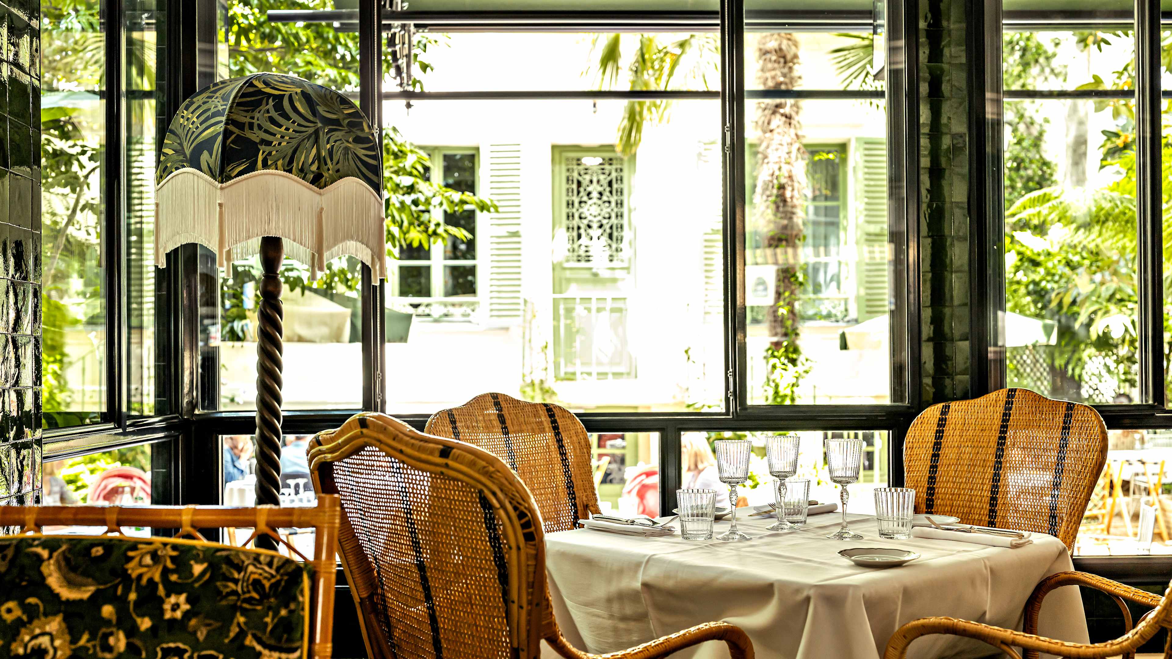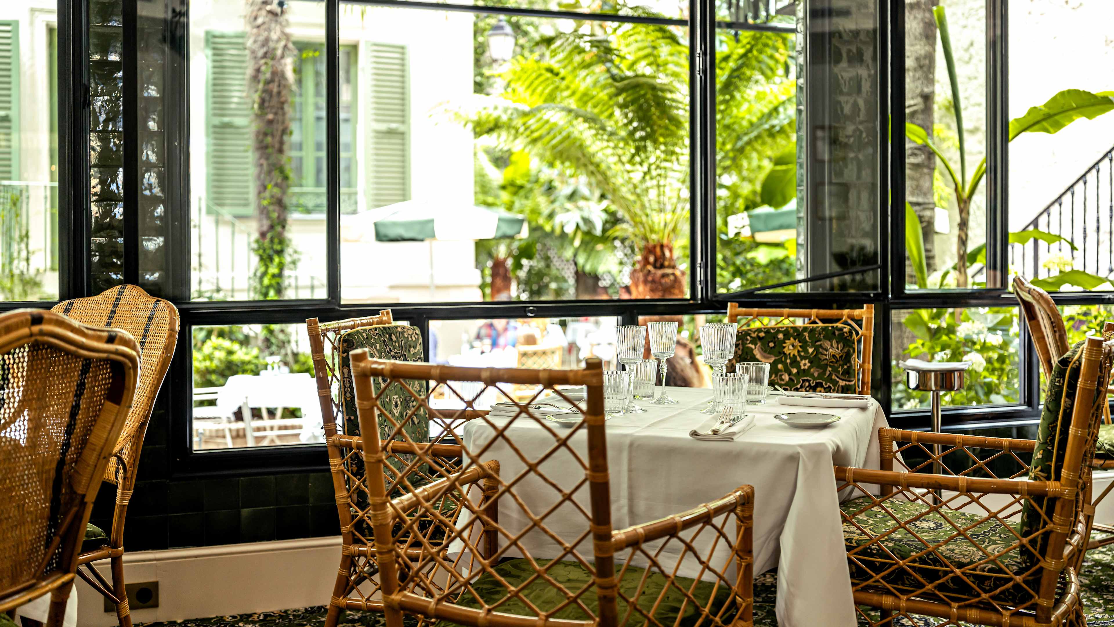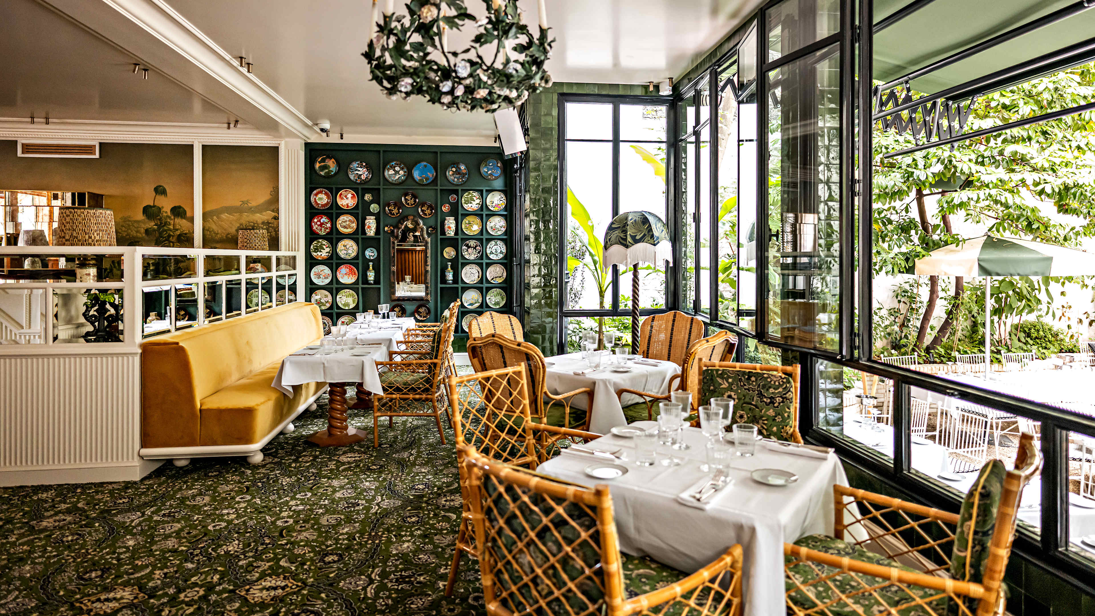 L’Eldorado’s restaurant offers the rare opportunity to dine amid palms, hydrangeas, roses and wisteria in its secret (but not for long) garden. The indoor dining space is rather flowery too, with its botanical prints and mural wallpapers, colourful plates on display and vine-entwined chandeliers; and large windows bring the outside in as well. The service might be silver and the wait staff well-attired, but dining is fairly casual, with small plates (eggs mimosa, trout rillettes, oysters, seasoned snails…) and more substantial – largely sea-to-plate – eats: sea-bass fillet in parsley sauce; sole meunière; vol-au-vents stuffed with clams, asparagus and lemon; beetroot tartare, plus fillet steak with dauphinoise potatoes, lemon-y chicken and mushroom-stuffed omelettes. To follow, think mille-feuille, clafoutis, coupes and glaces.