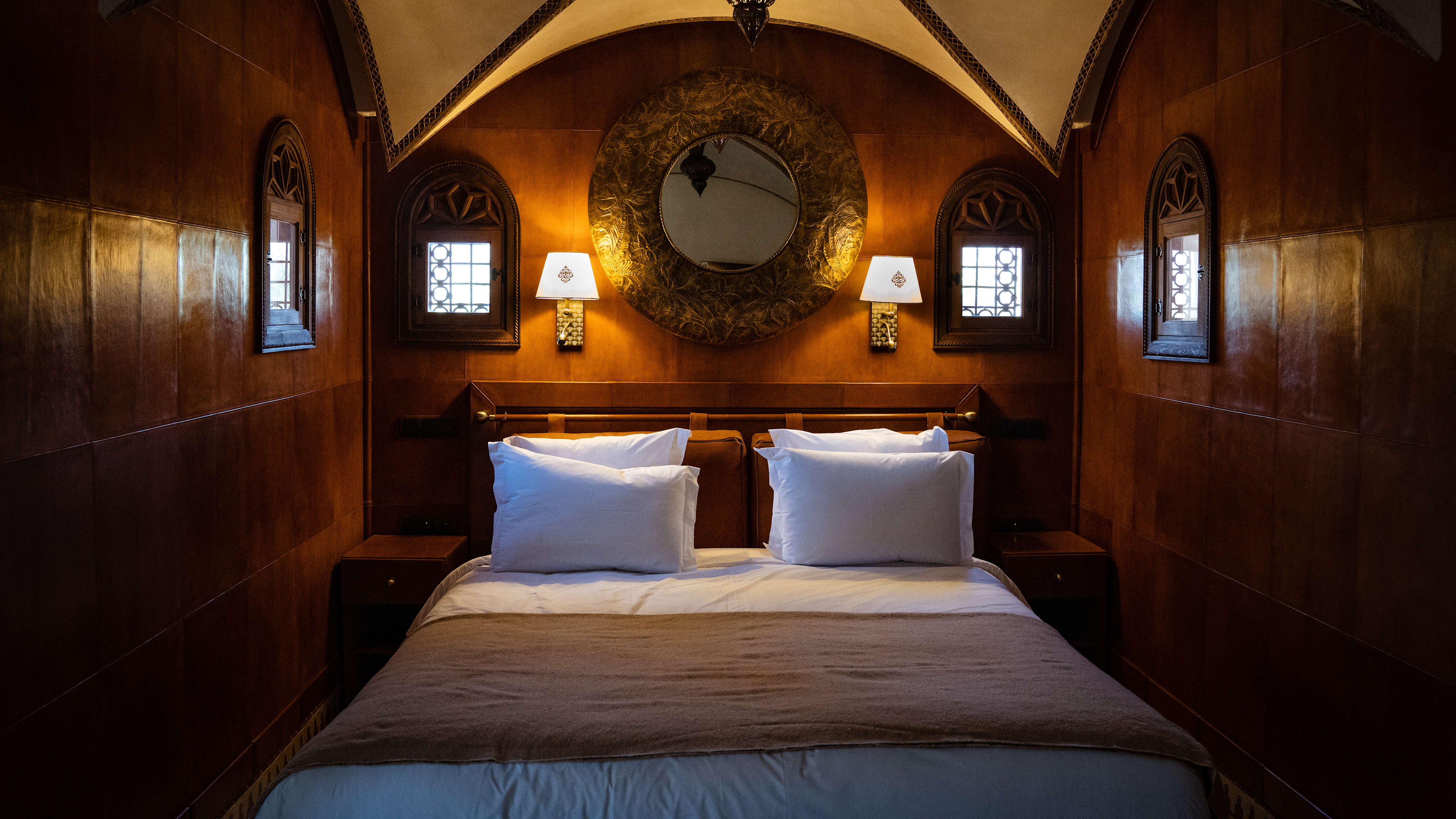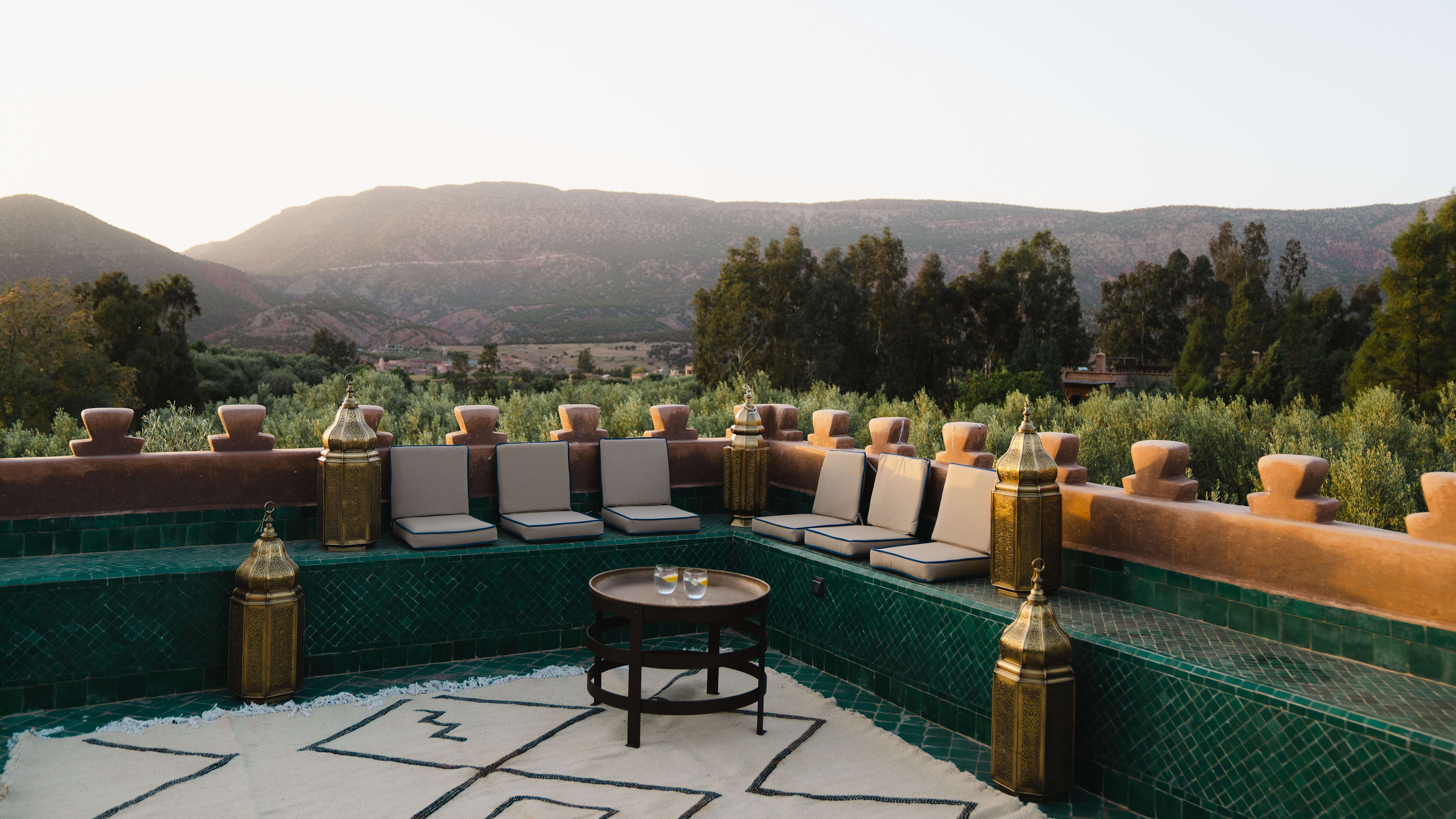 Rainbow sprites dance over the sultrier brick, leather and wood interiors of art deco bar Les Zwaks, as sunlight shines through its stained-glass windows. You don’t need any embellishment of the mischief and magic here: with a lost-in-time feel and a drinks list healthily weighted with local and international wines and classic cocktails (plus signatures such as the Olinto Mule with saffron-infused vodka; Marrakech Negroni with star anise, cloves and cinnamon; or raspberry mojito), there’s fun and flirtation afoot. Follow the trail of emerald-green tiles that shine like dragon skin to the roof terrace, where the Toubkal National Park and Moroccan royals’ vast protected hunting grounds make for incredible scenes whichever way you look.