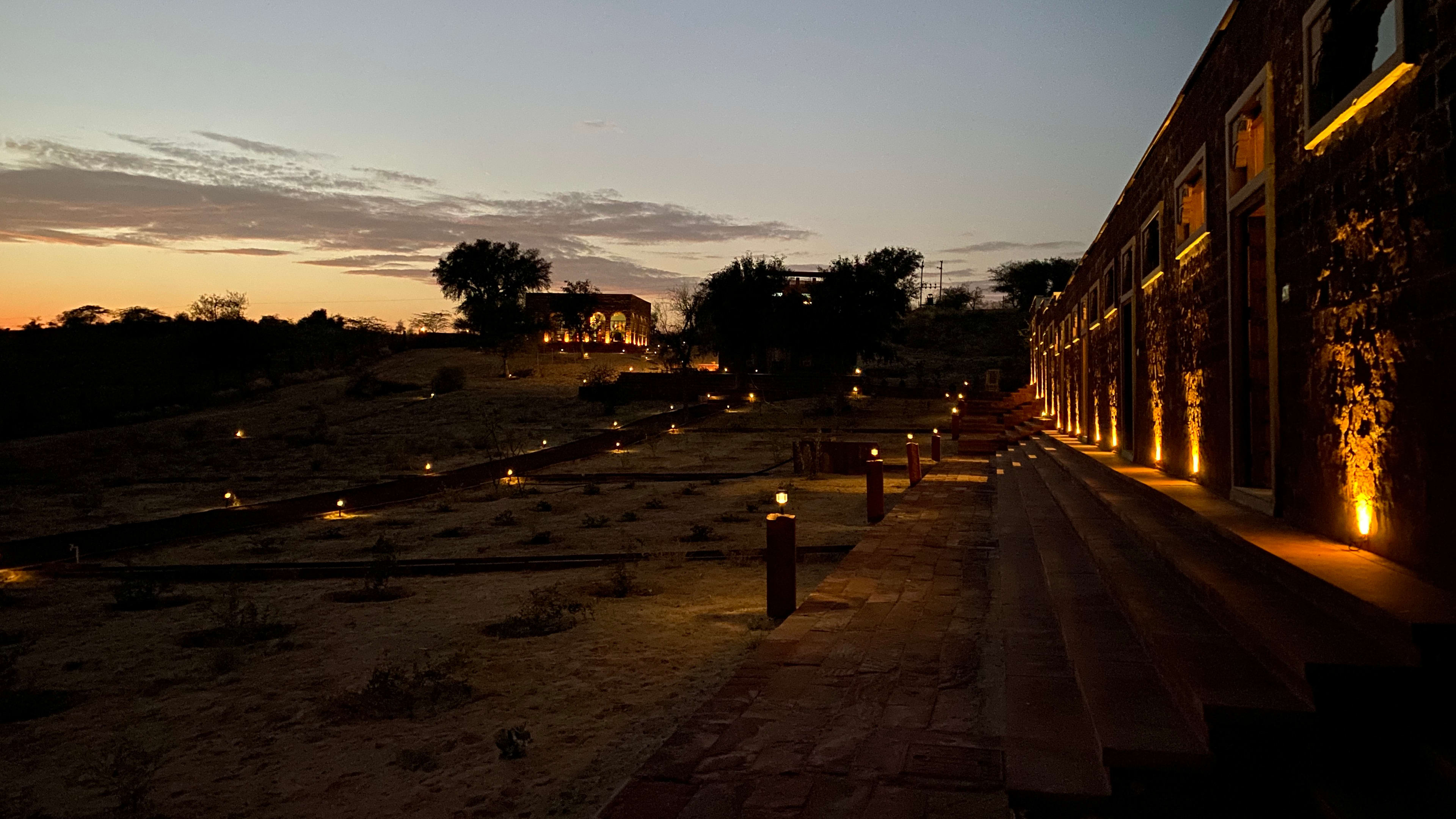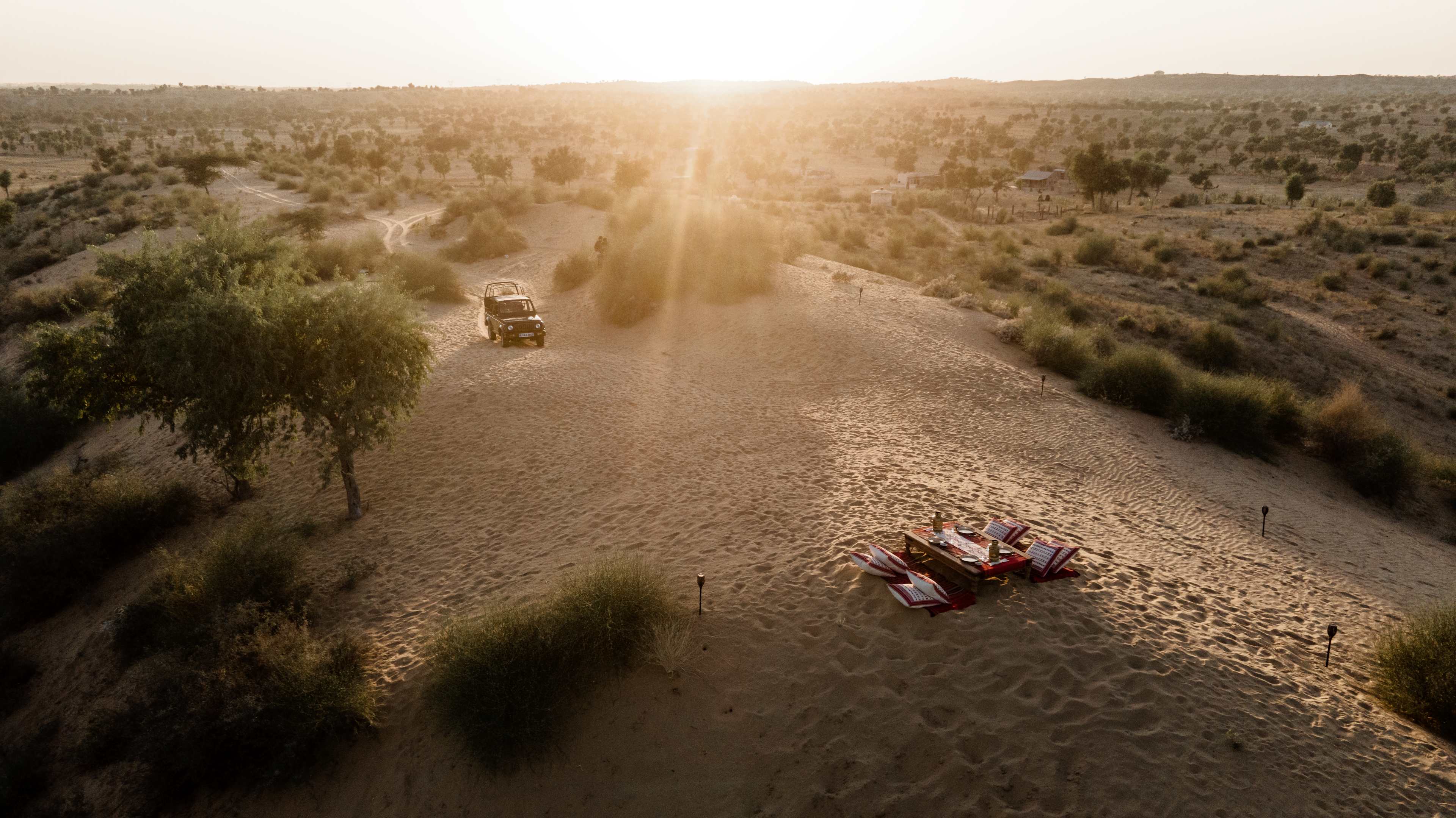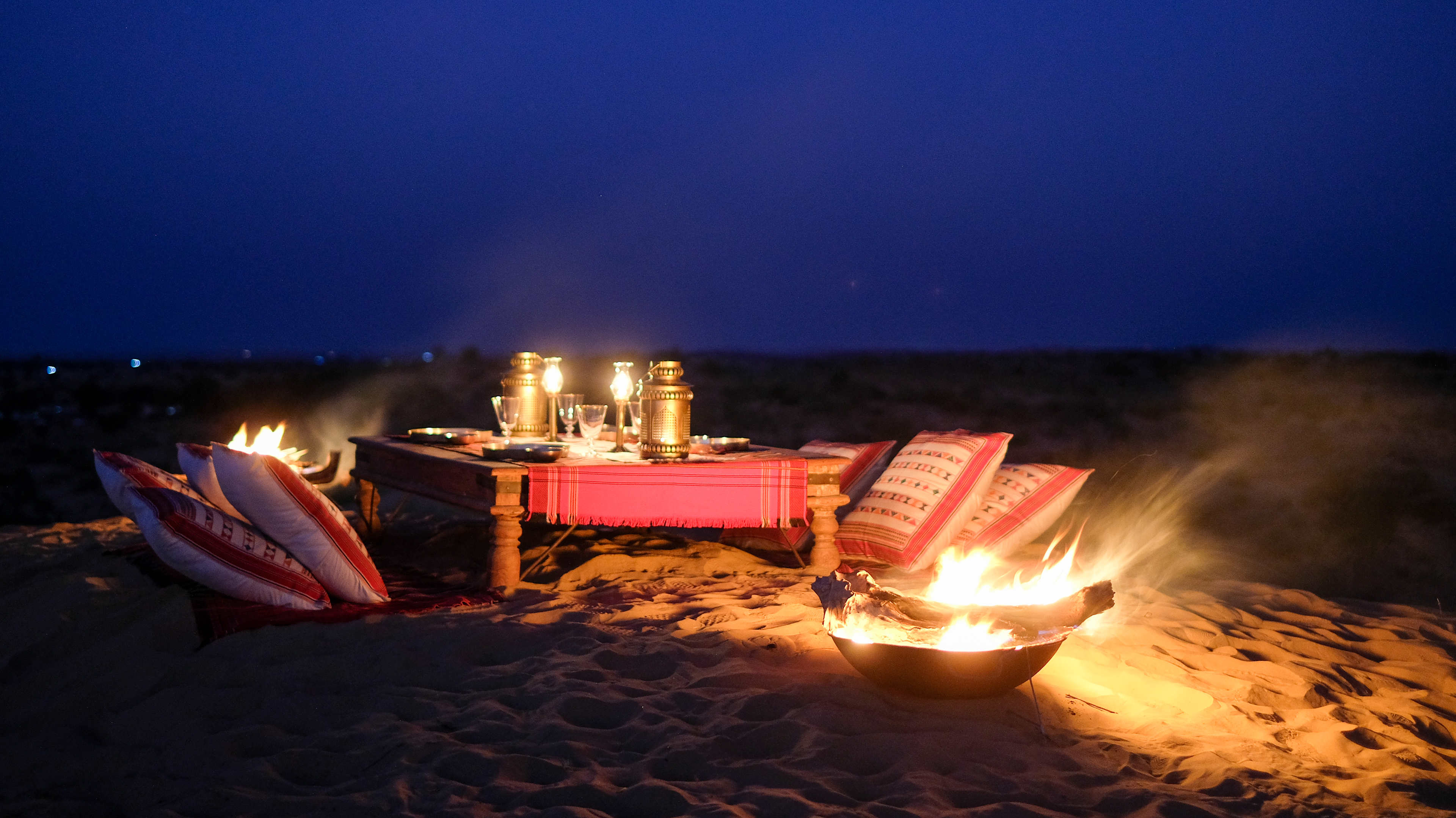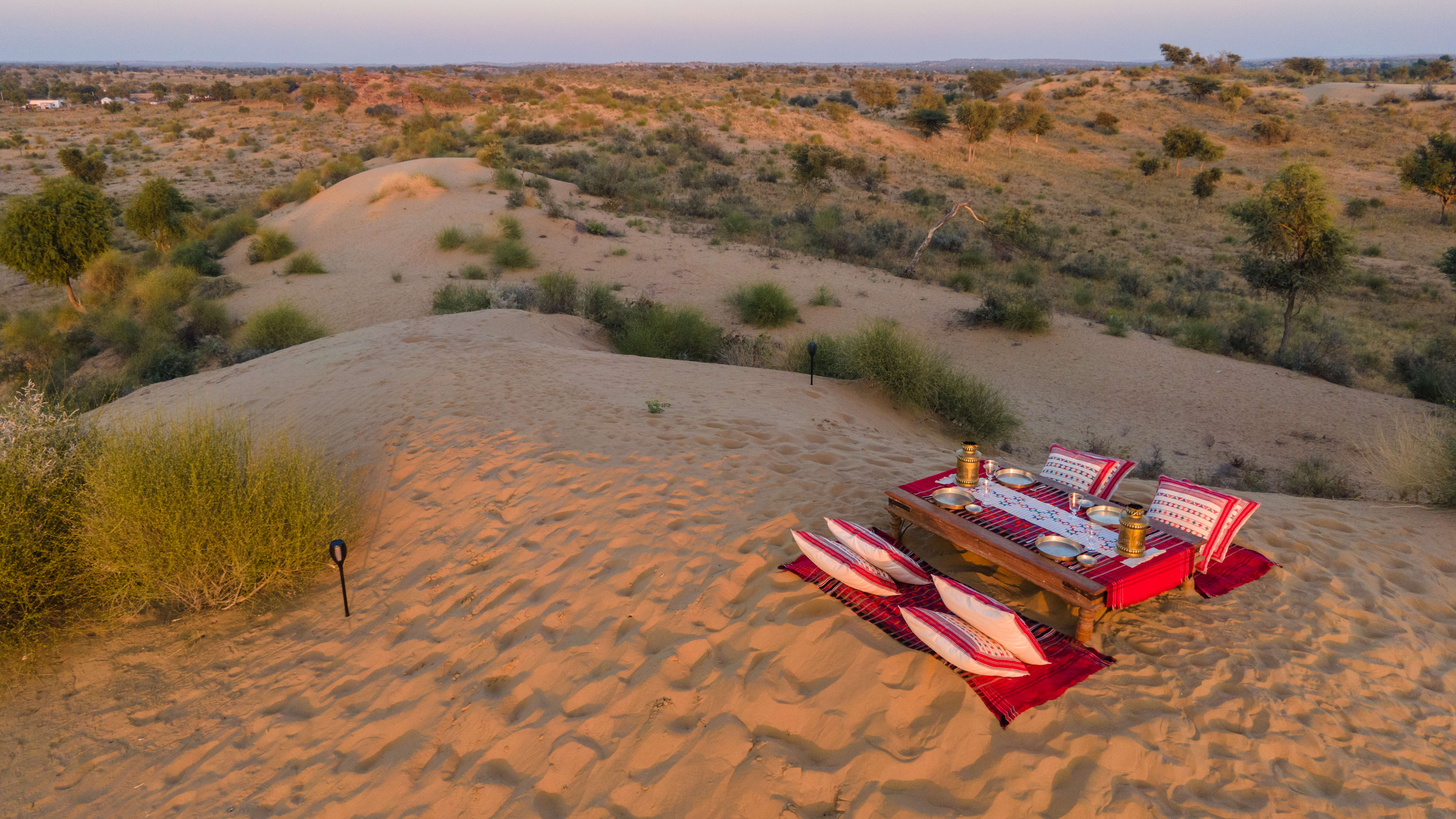 Sunset meals amid the arid majesty of the Thar Desert, with flowers and a fire – whether just the two of you, or with fellow guests – are a must.