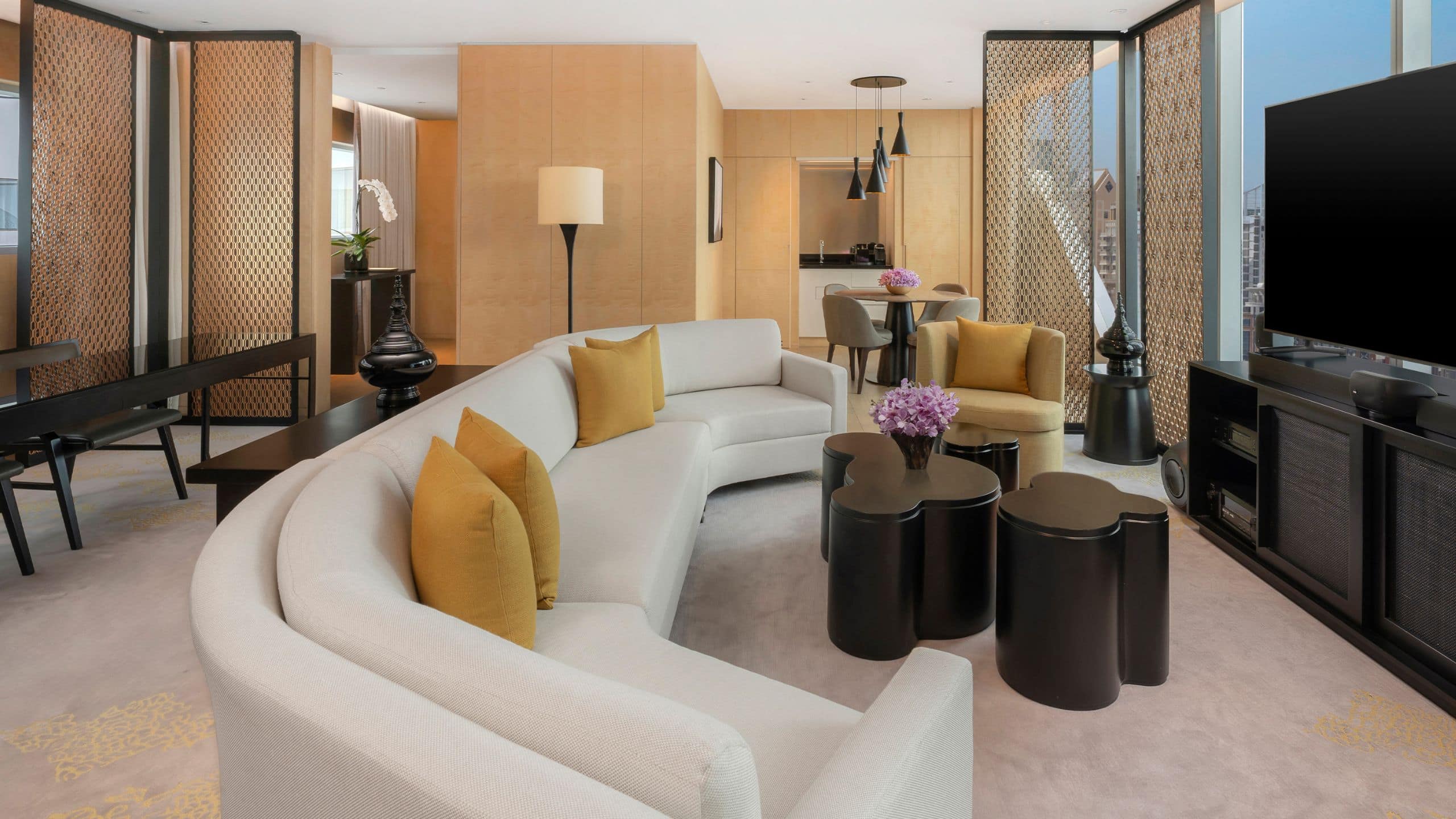 Une suite standard de 58 à 87 mètres carrés offrant une vue imprenable sur la ville et dotée de deux lits jumeaux, d’un lit King, d’un séjour et d’un bureau séparés.